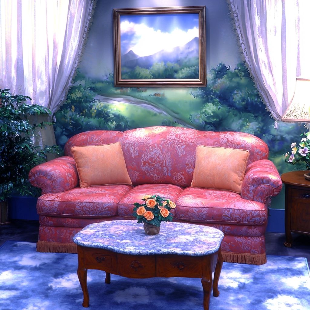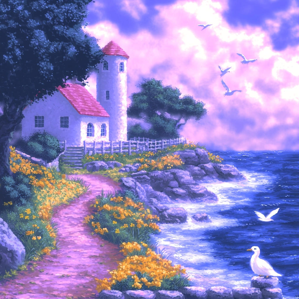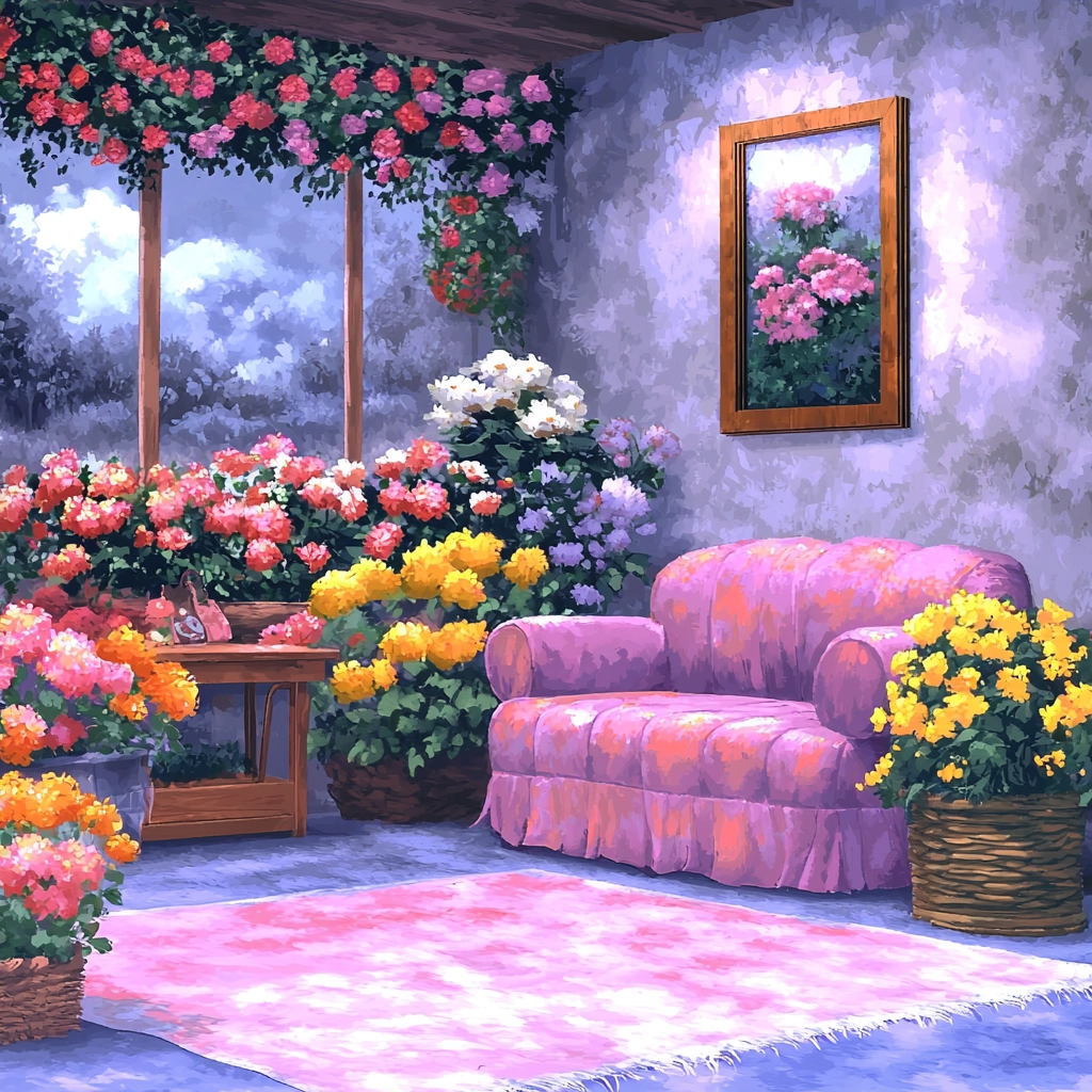 Gentle lighting blends with vibrant purples and pinks, creating a luscious palette. The soft textures evoke a refined, tactile quality, while spatial depth is achieved through clever manipulation of layers and contrast.