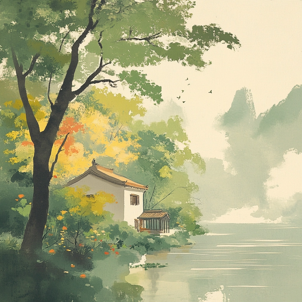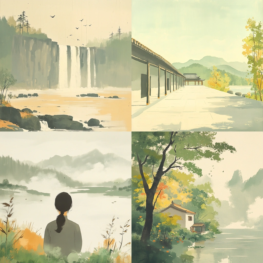There is a soft blending of watercolors creating a smooth texture that mimics natural transitions between elements. Light is distributed evenly, lending to an expansive sense of space and depth, giving the landscapes a gentle and harmonious feel.