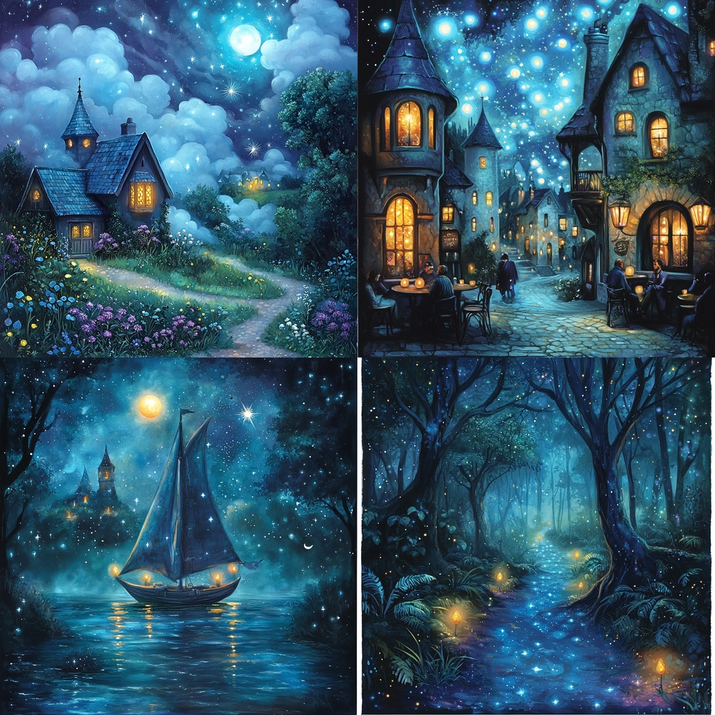 Rich blue hues blend with deep dark tones in various scenes.