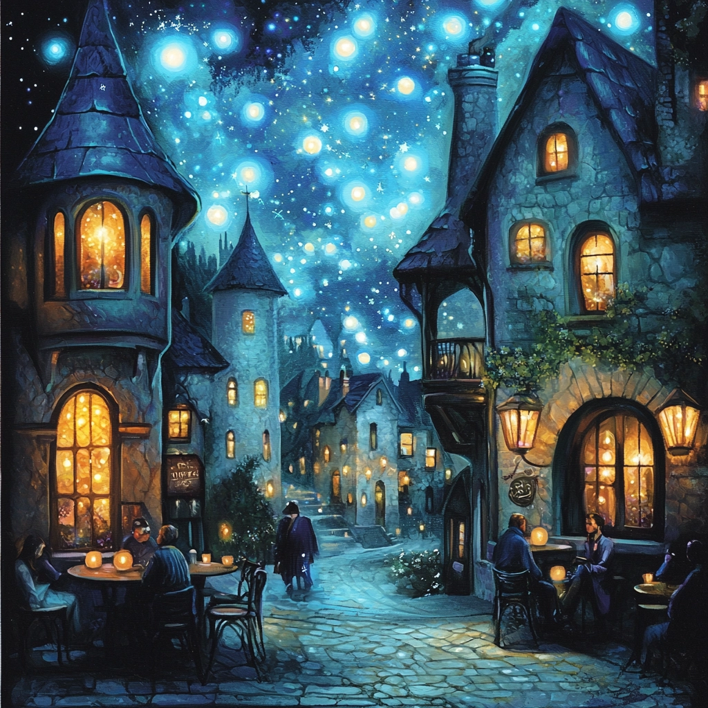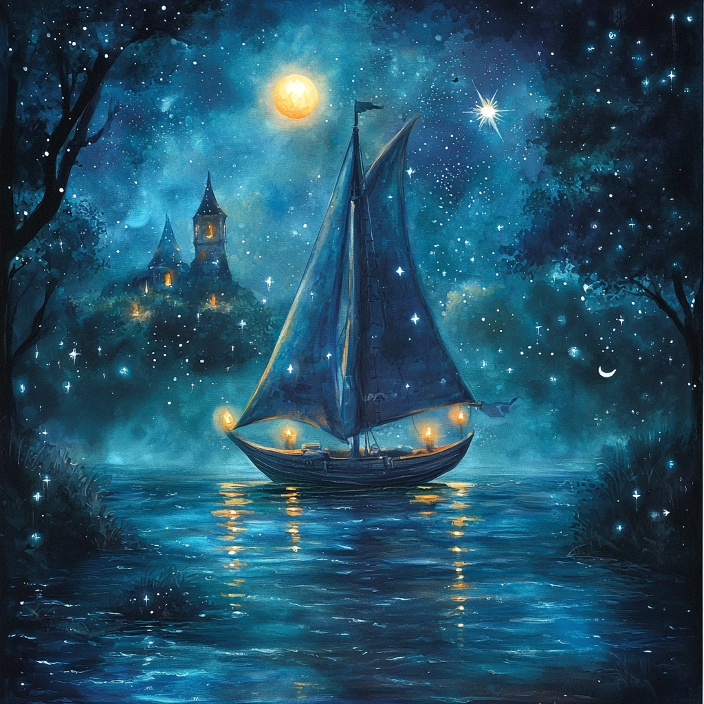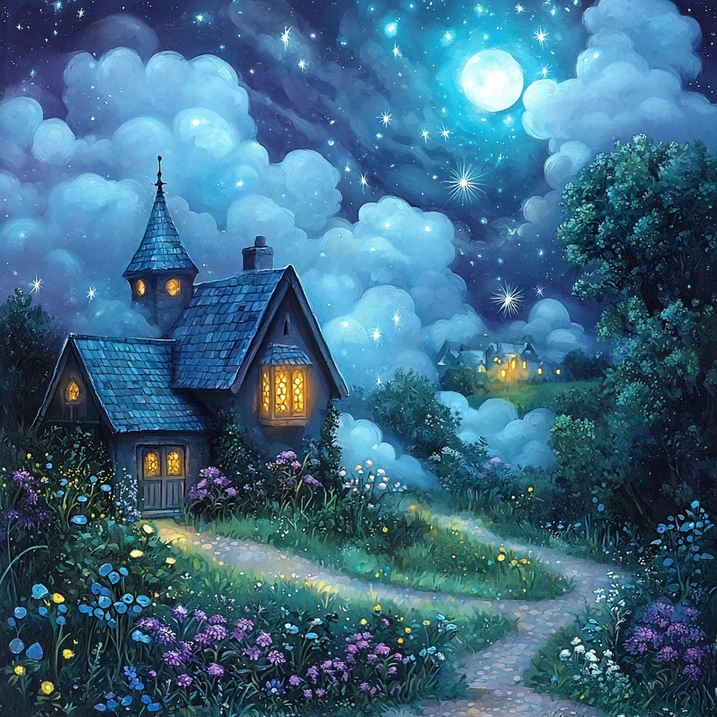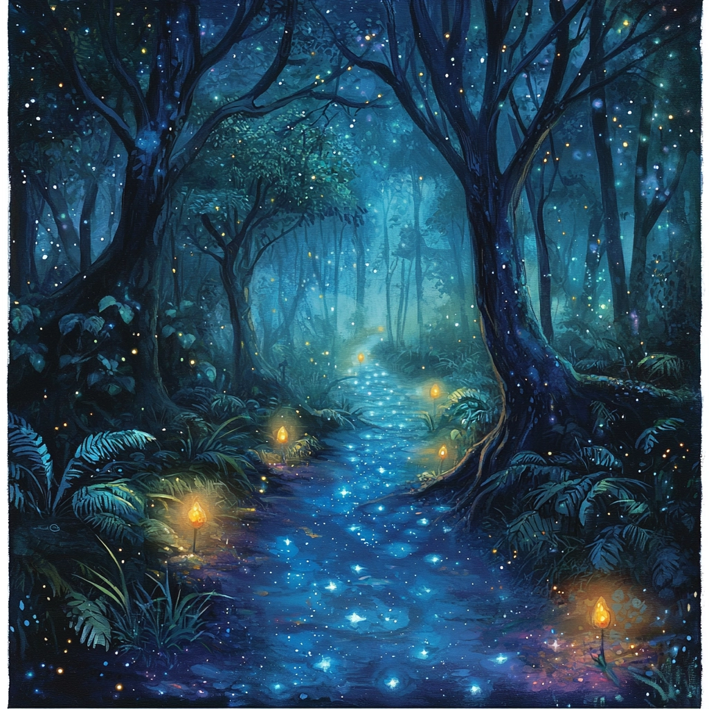 Lighting creates a glowing effect against the night background, enhancing depth with intricate details. Colors exhibit a smooth gradient, capturing cool, immersive spatial dimensions. Texture nuances emphasize light transitions across surfaces.