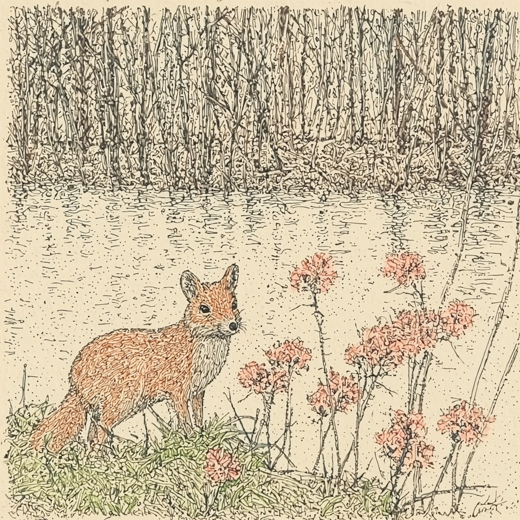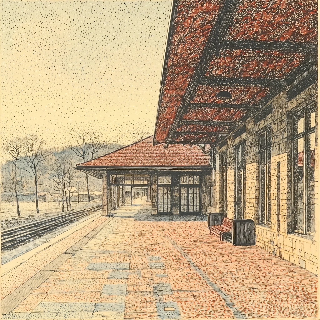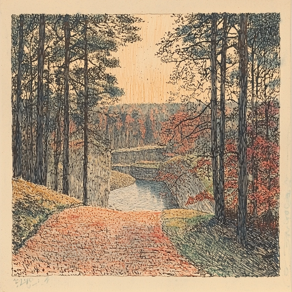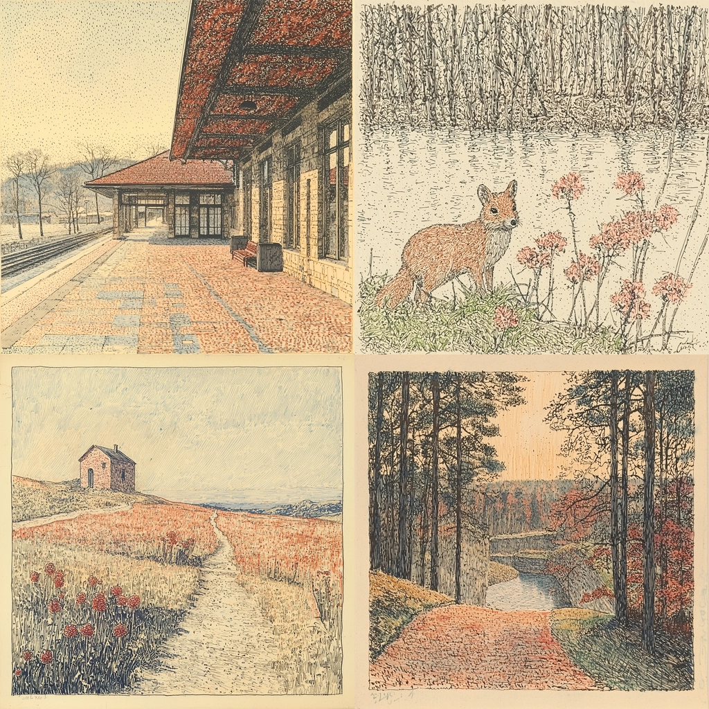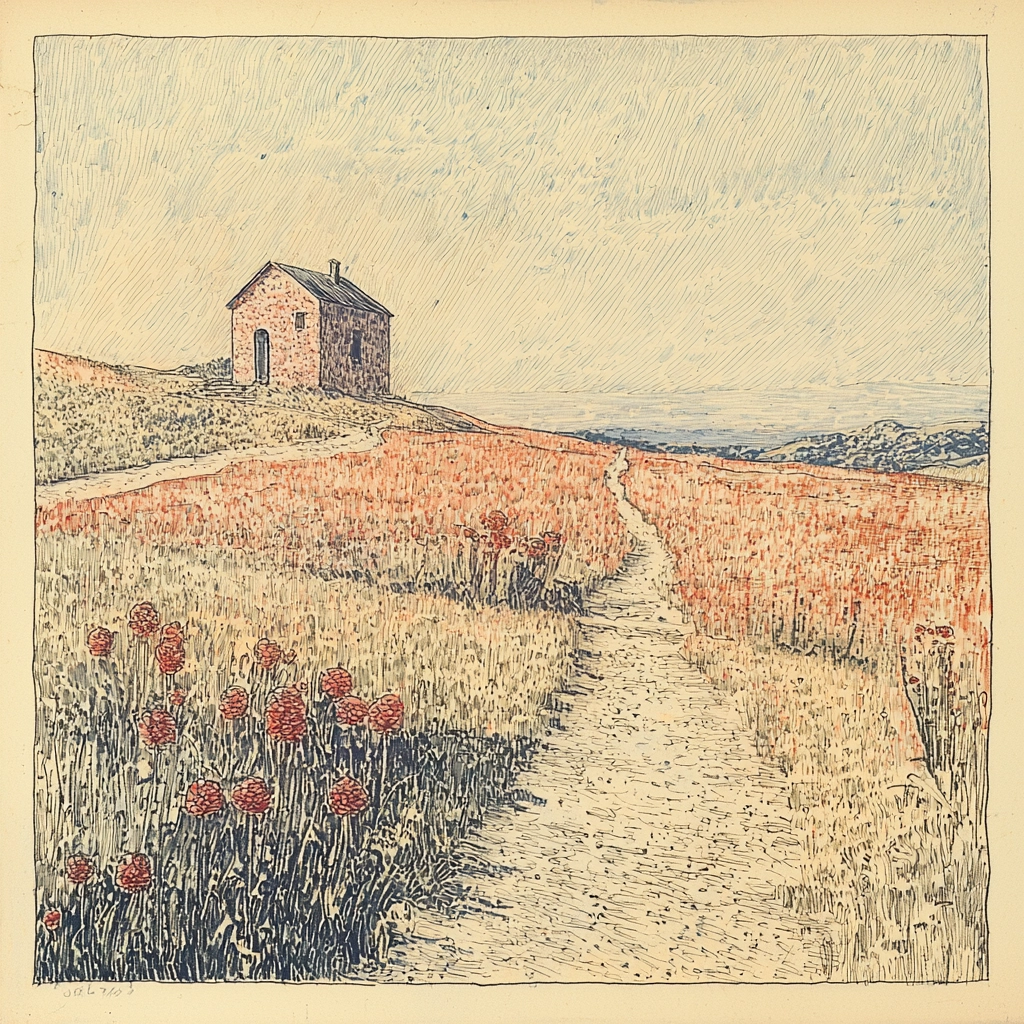 The use of stippling creates intricate textures, imparting a tactile surface. The color palette is soft, dominated by light beiges, with accents of red and brown, enhancing the spatial depth. Gentle lighting effects introduce subtle contrasts and highlight delicate details.