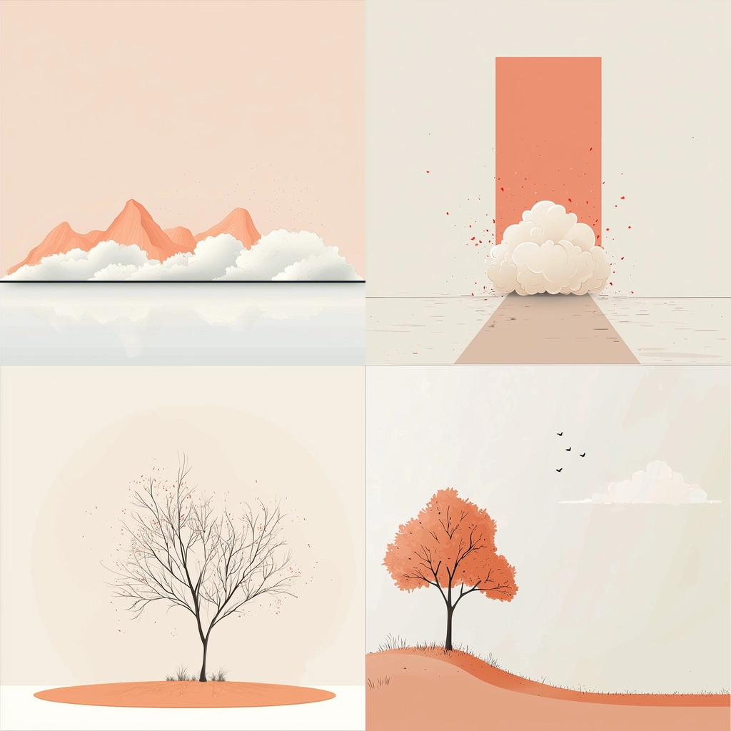 Lighting is diffuse and evenly spread, enhancing the understated beige backdrop with warm orange highlights. Spatially, the scenes feel open and uncluttered, offering a serene clarity. The texture exhibits smooth gradients that reinforce simplicity.