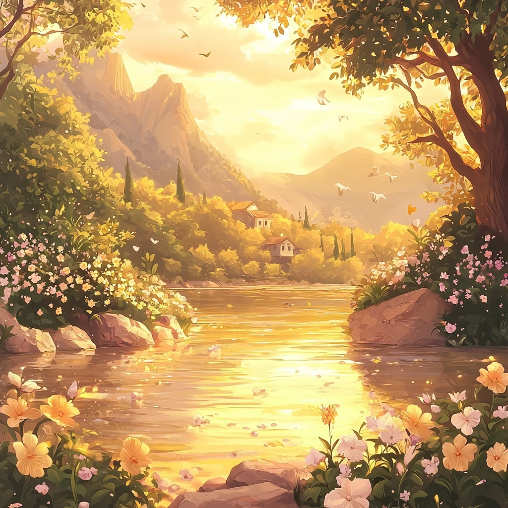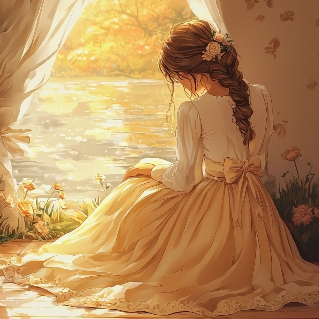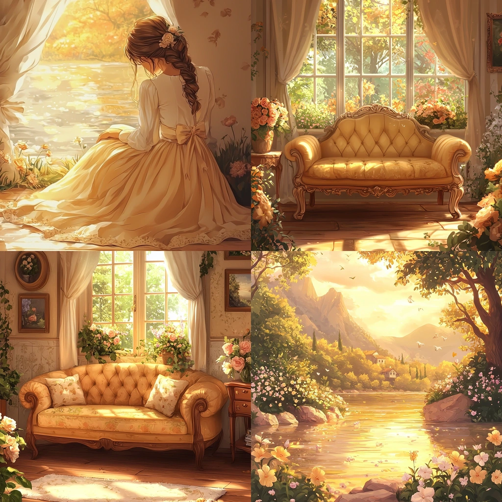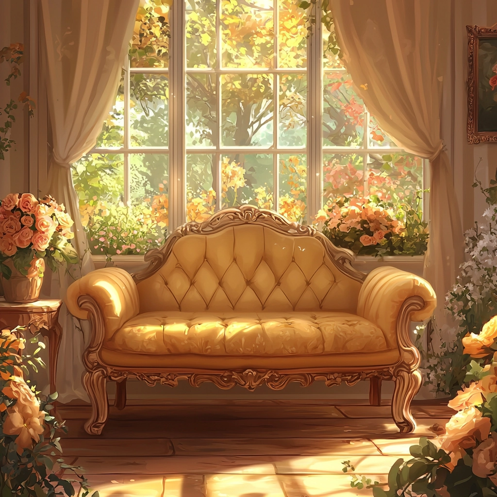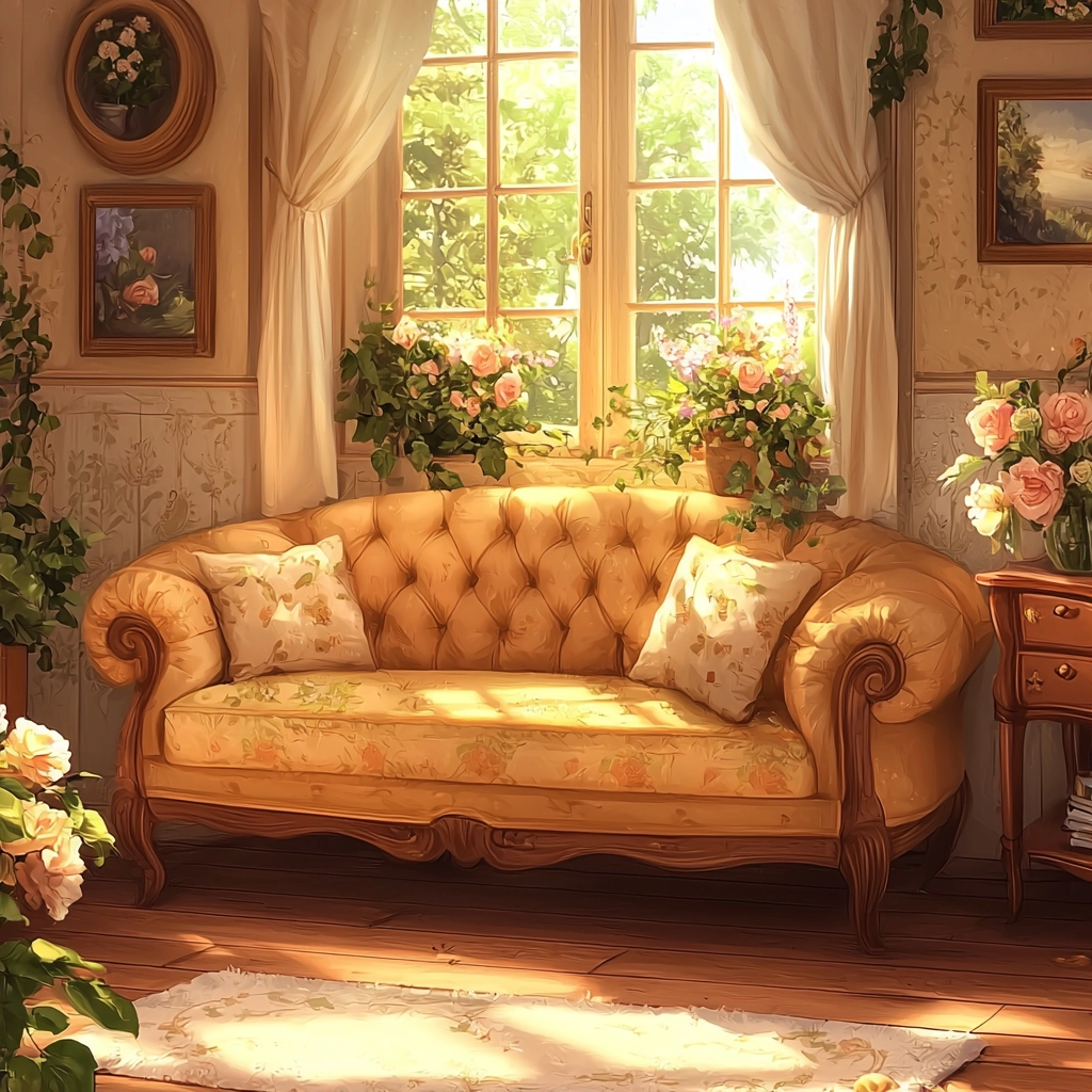 Illuminated by warm, gentle lighting that creates an embracing warmth; rich textures of fabric and foliage are rendered in soft, inviting colors, enhancing a perception of comforting enclosure.