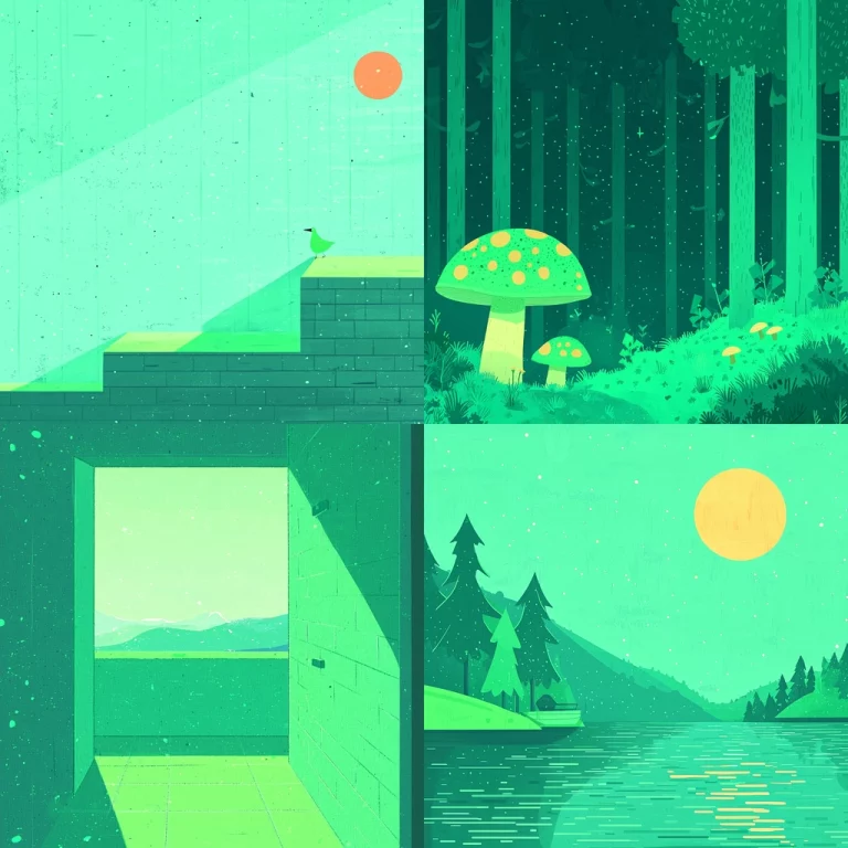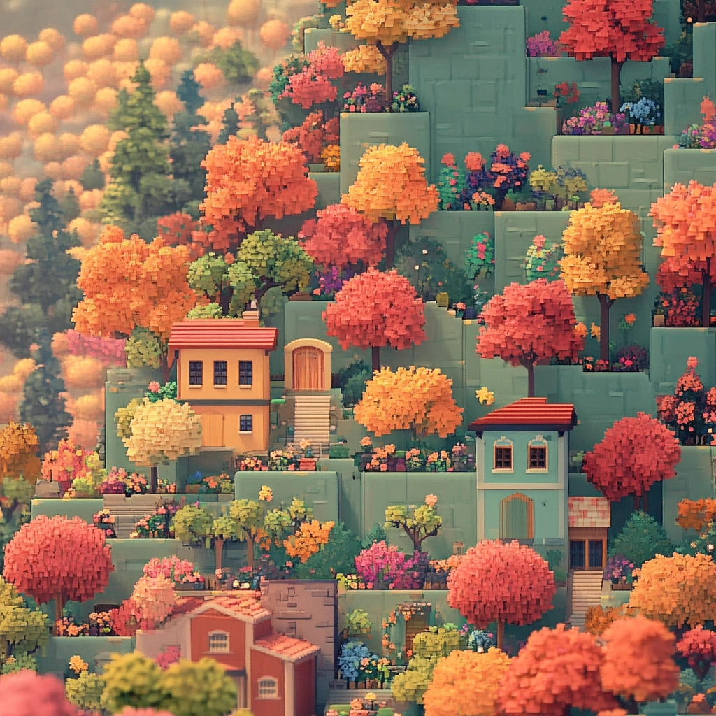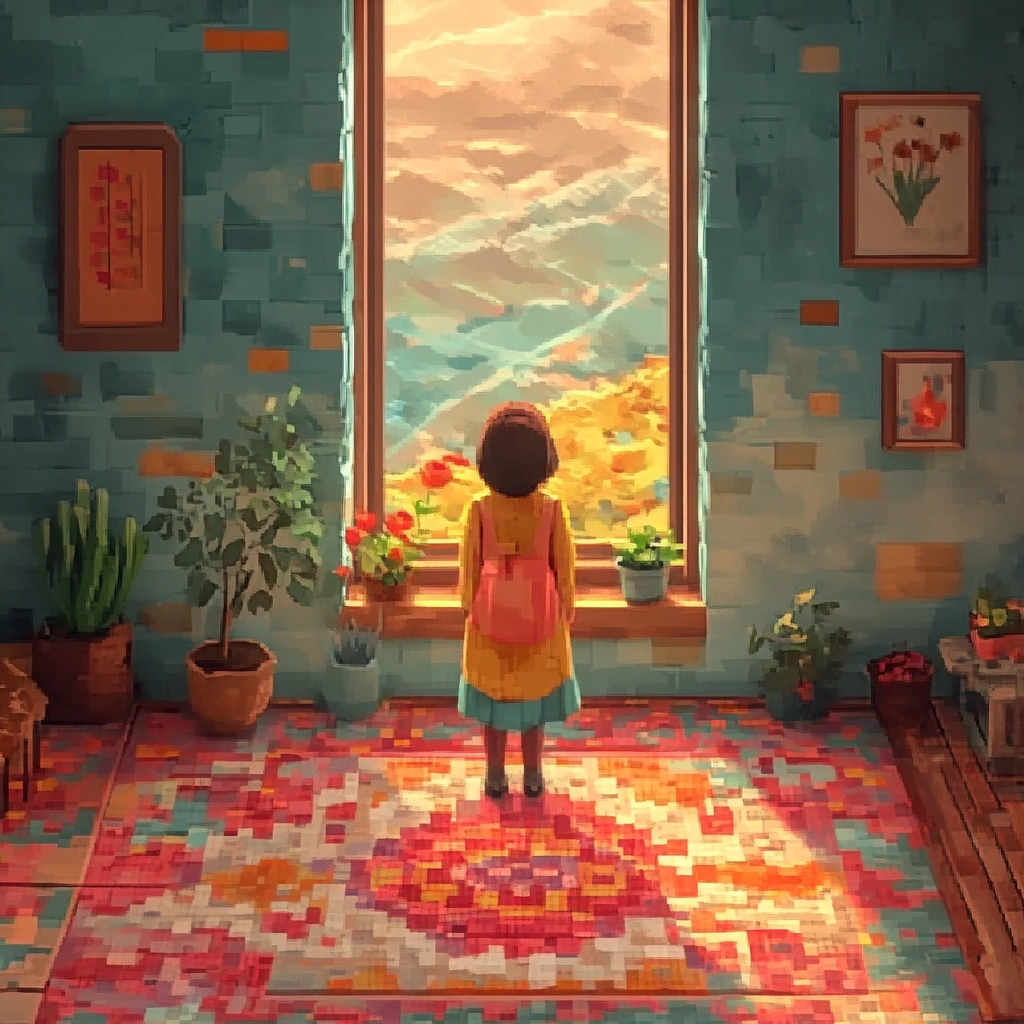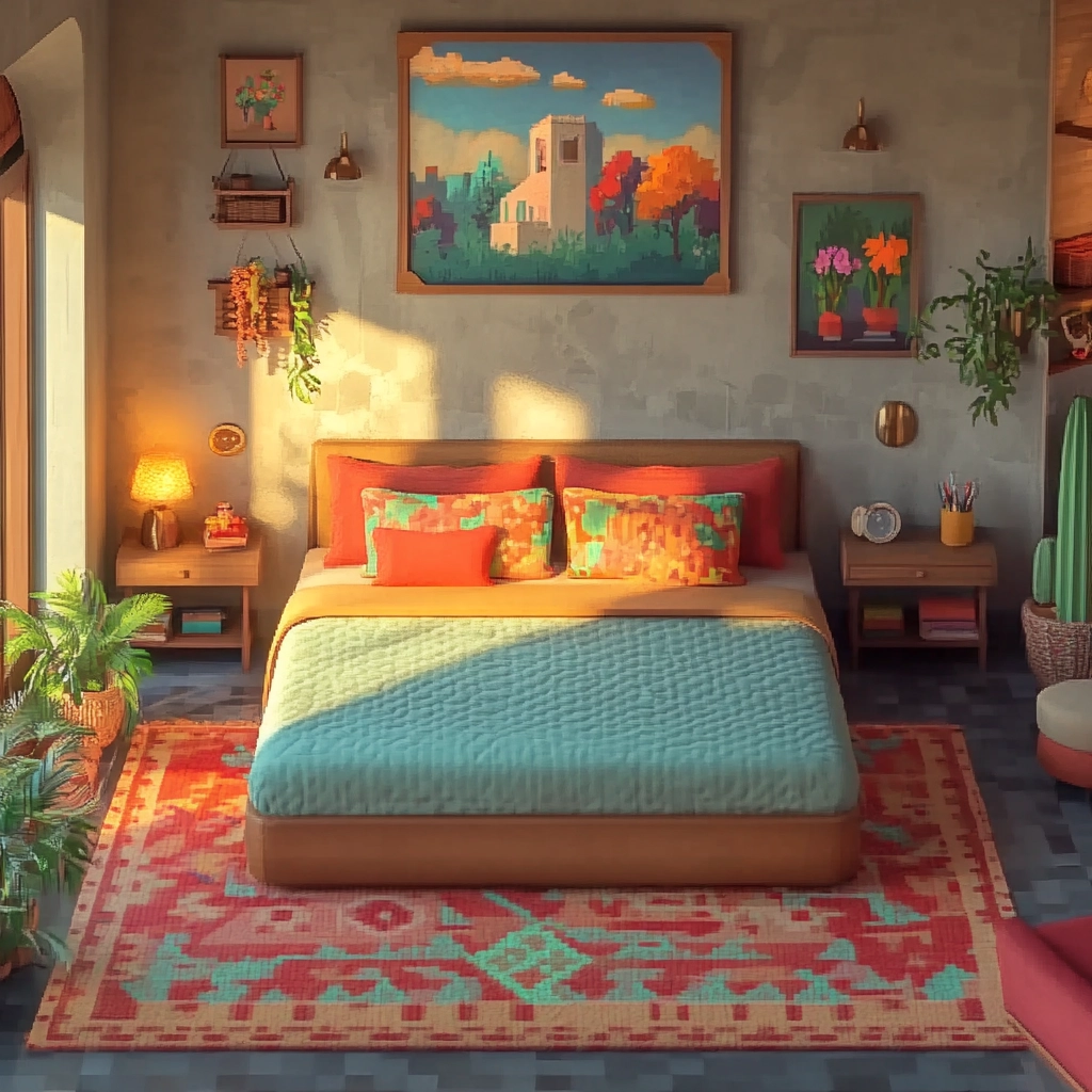Sunlight filters through spaces, casting warm shadows and highlighting textured surfaces. The palette prioritizes orange and teal, creating balance. Foreground textures are rich with depth, giving a retro feel, while the spatial arrangement directs focus inward.