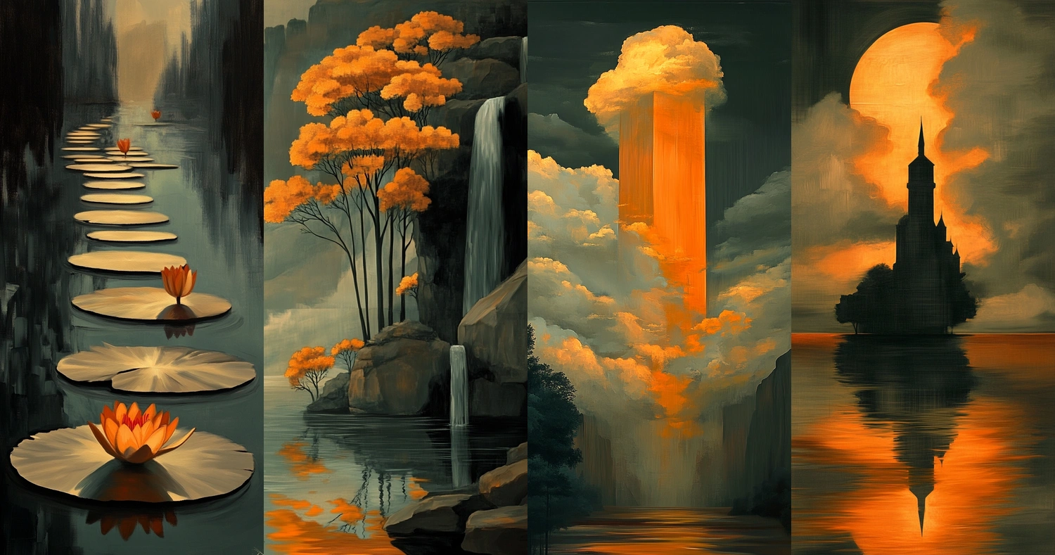 Rich contrasts and warm hues dominate with dramatic lighting.