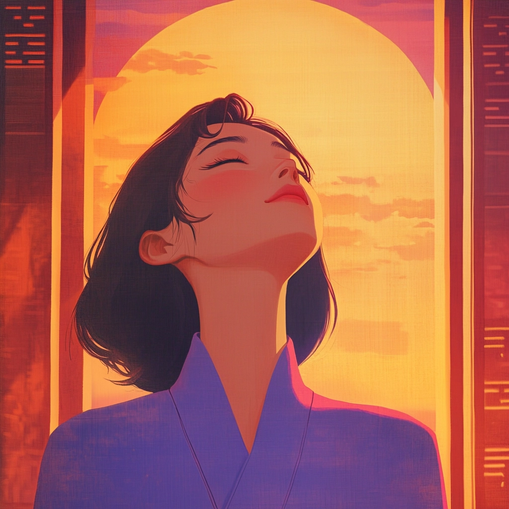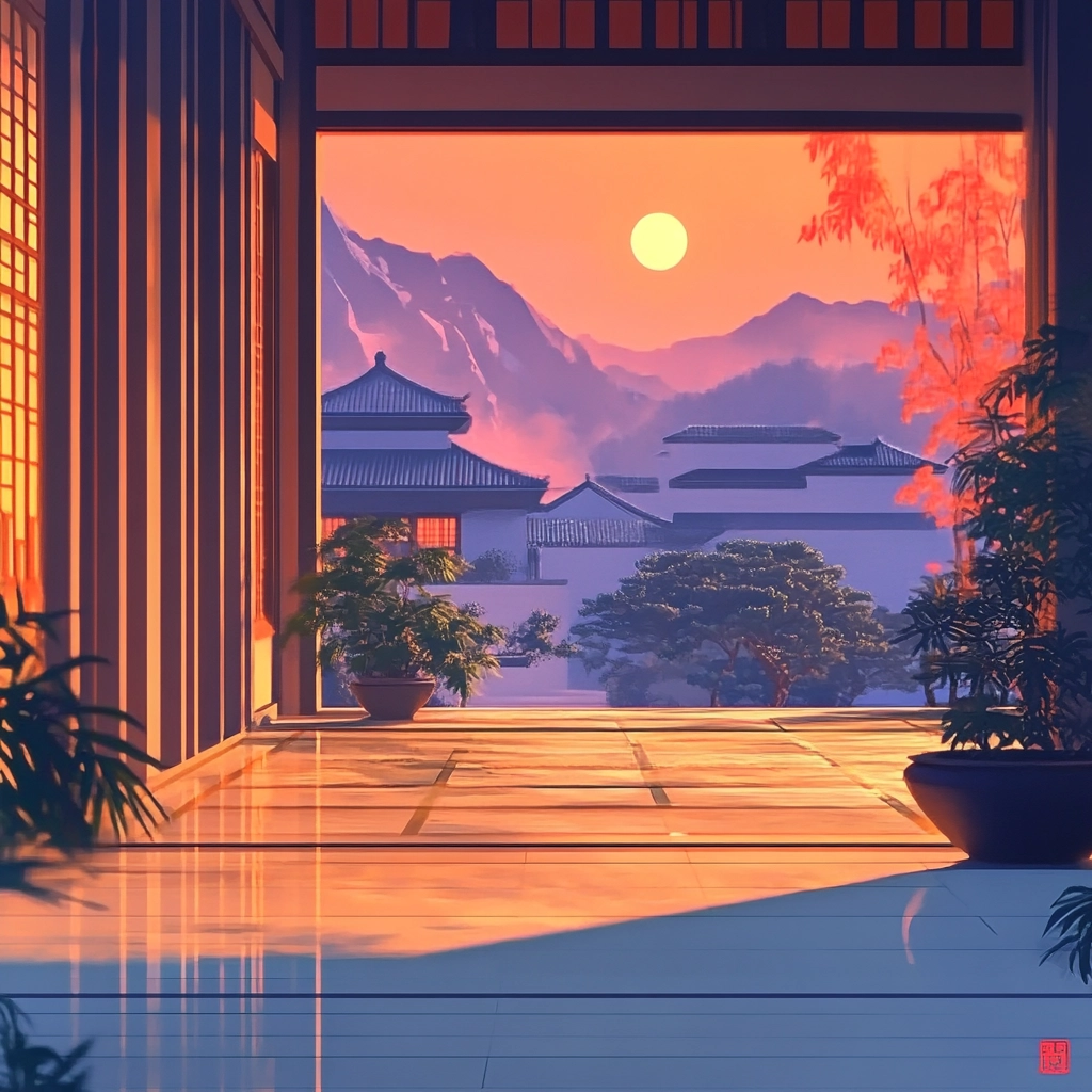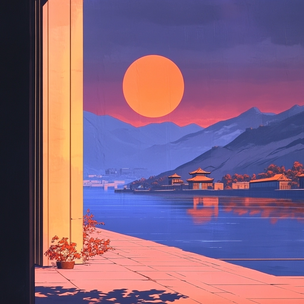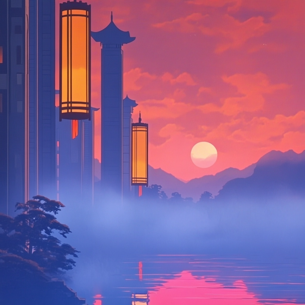 Strong lighting effects enhance the vividness of colors with the warm glow of orange juxtaposed against cooler purples and blues. The compositions have a dynamic sense of space, framed by architecture that guides the eye towards the horizon, while texture is implied through soft, fluid transitions.