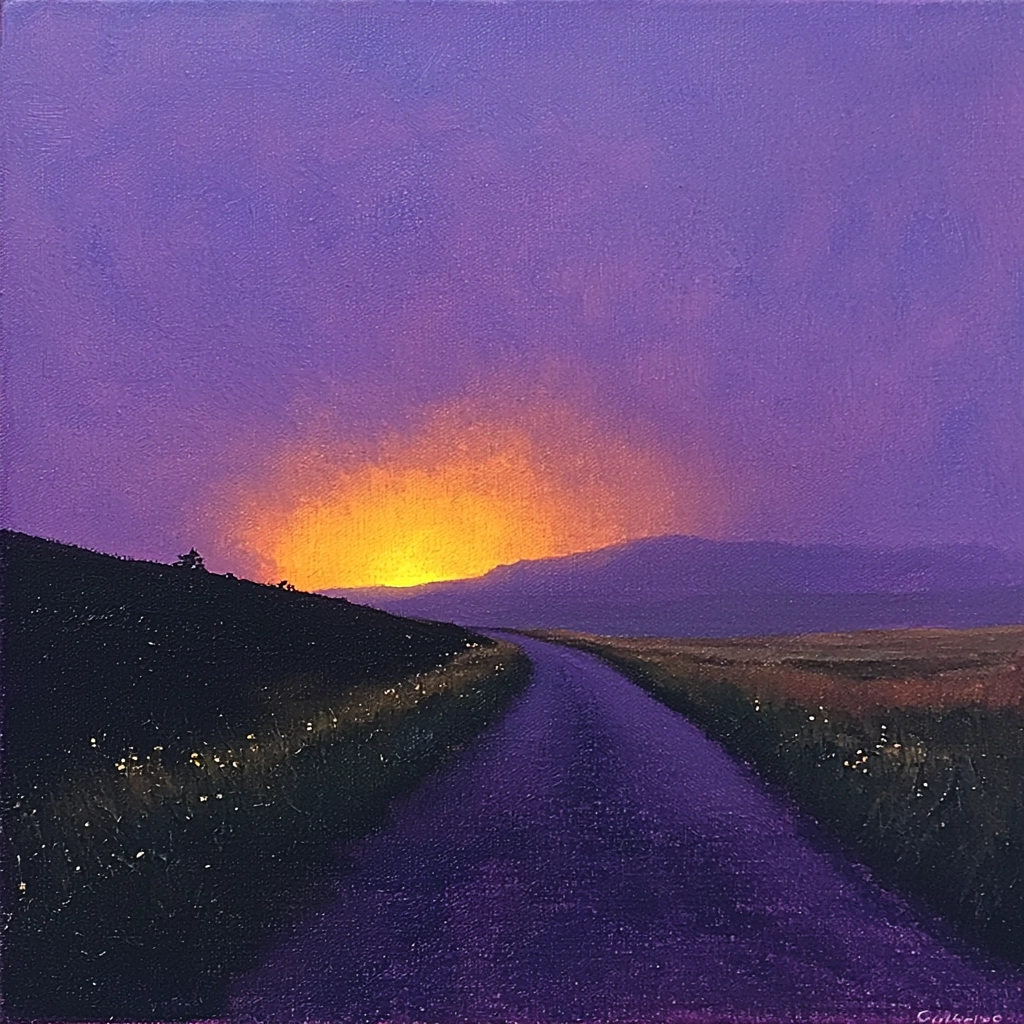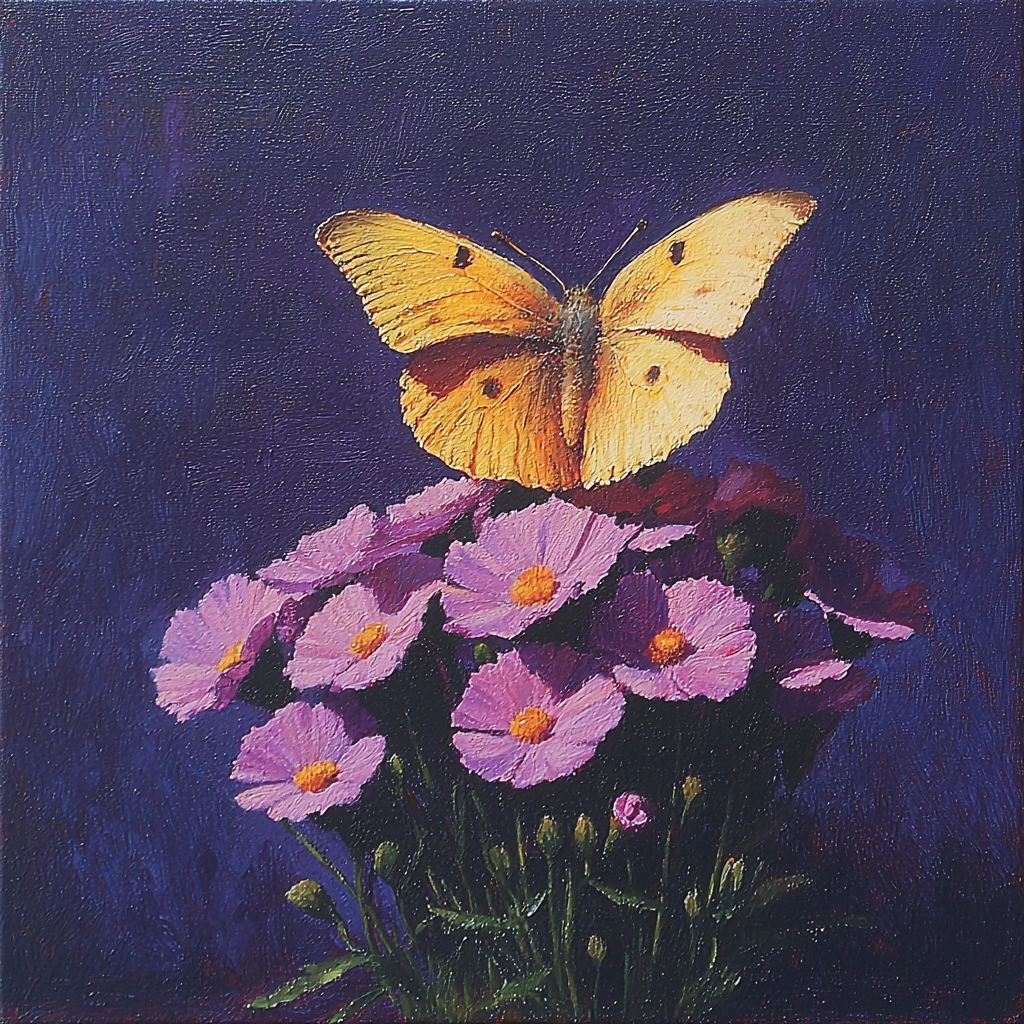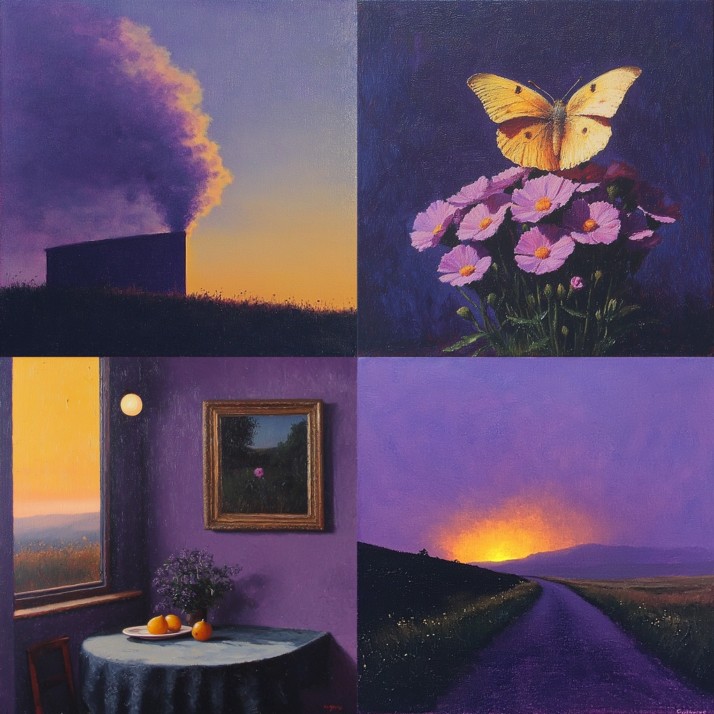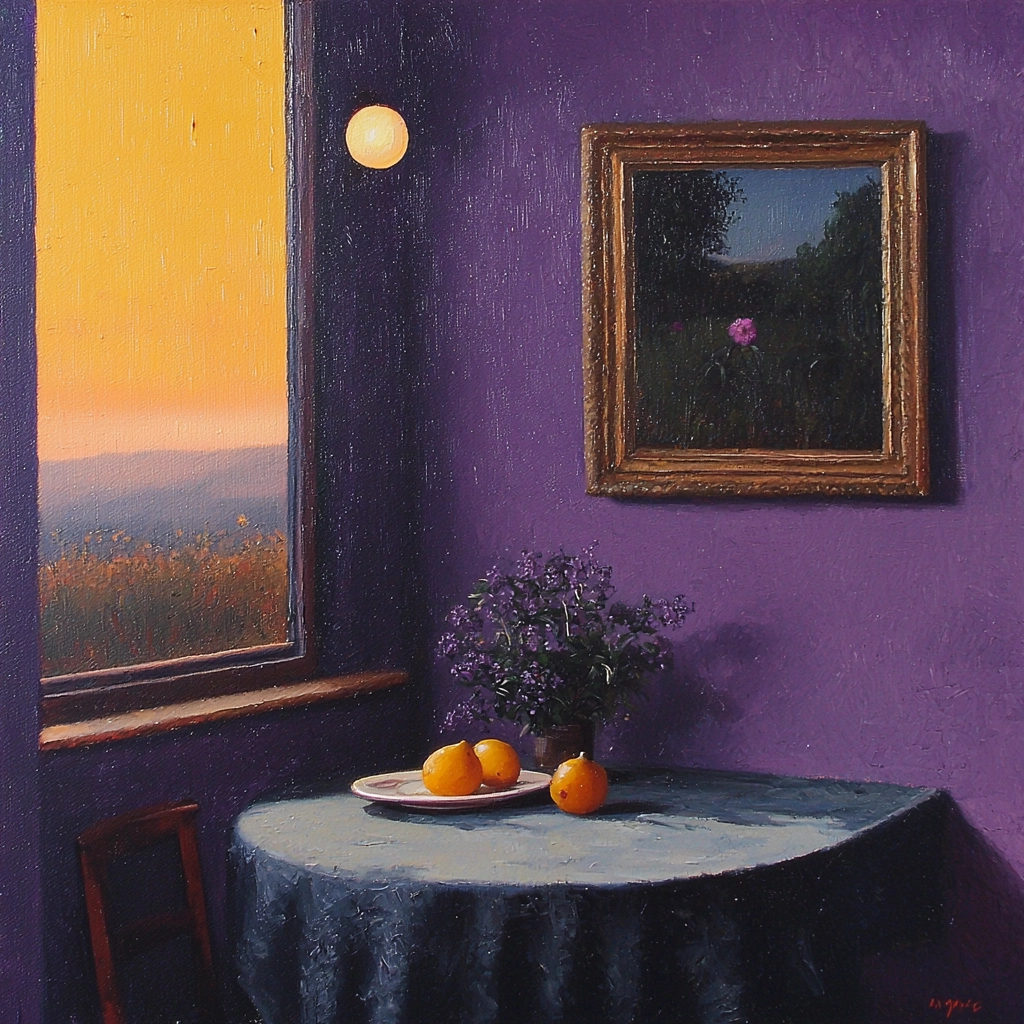 The lighting captures a glow-like quality, creating deep shadows and bright highlights. Colors are saturated, bringing vibrancy to indigo and warm tones. The texture appears smooth yet defined, with a balanced spatial arrangement inviting exploration.