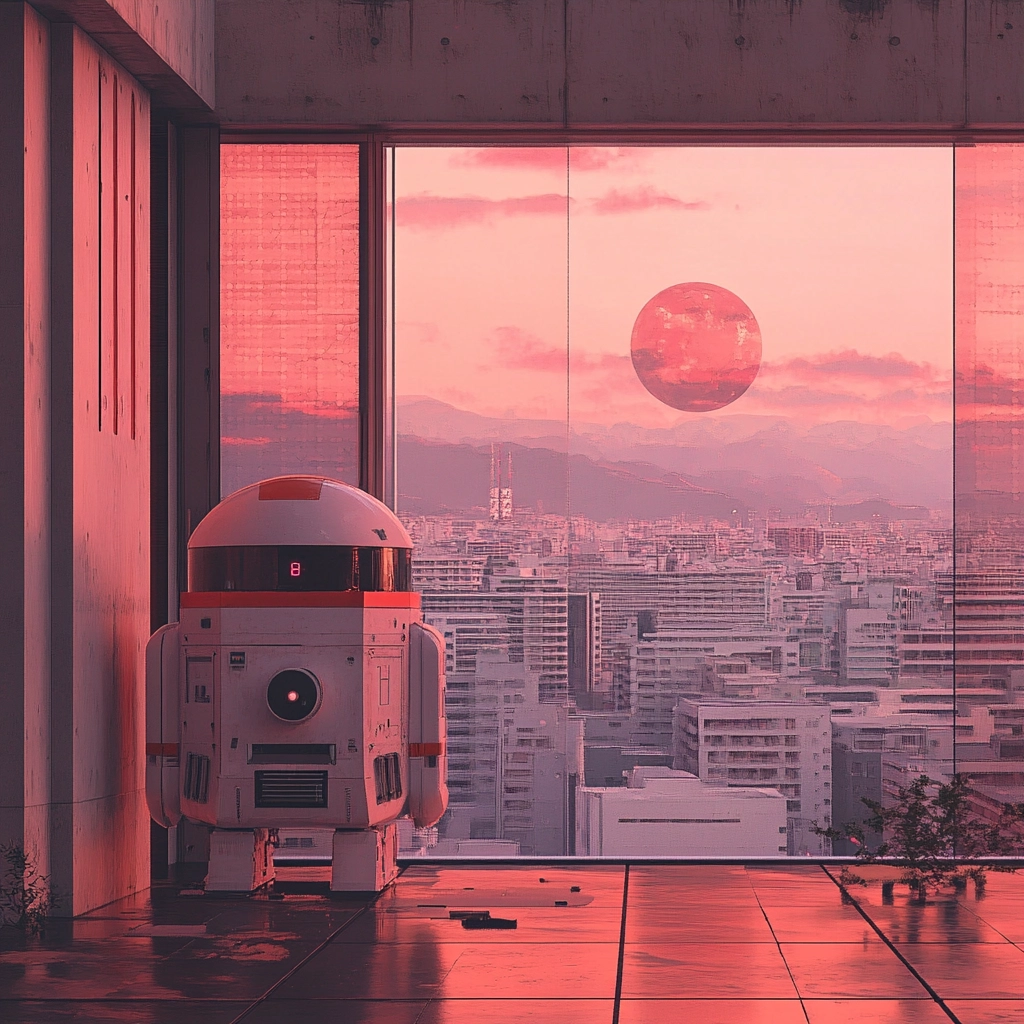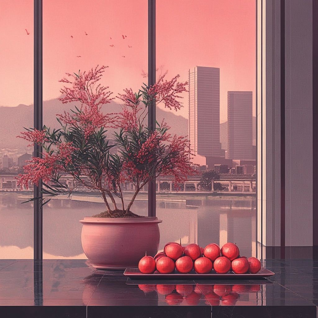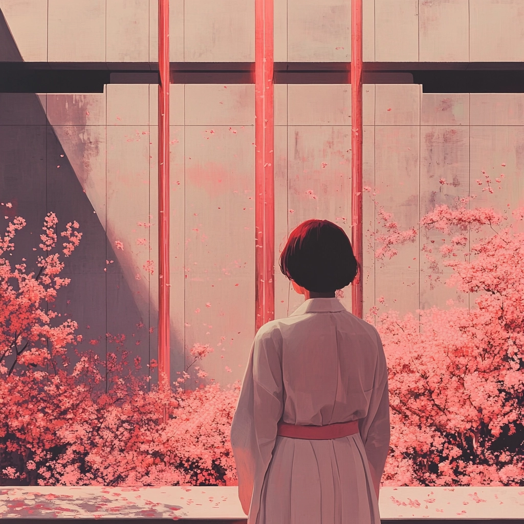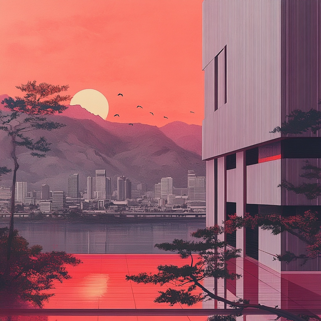 The scene portrays a balanced use of pink and gray shades with minimalistic elements, enhancing an urban environment with a sleek composition.