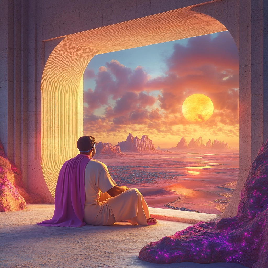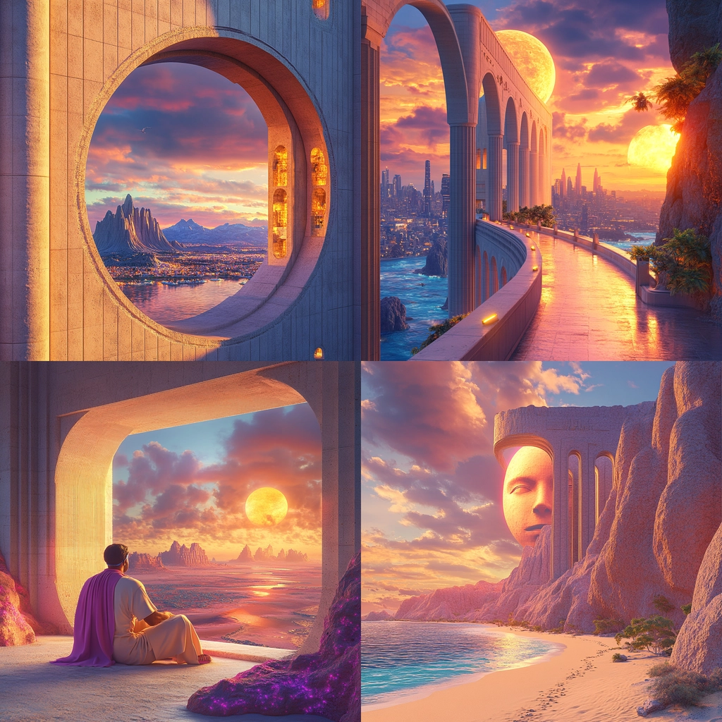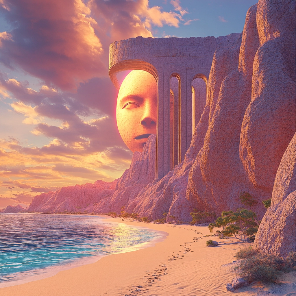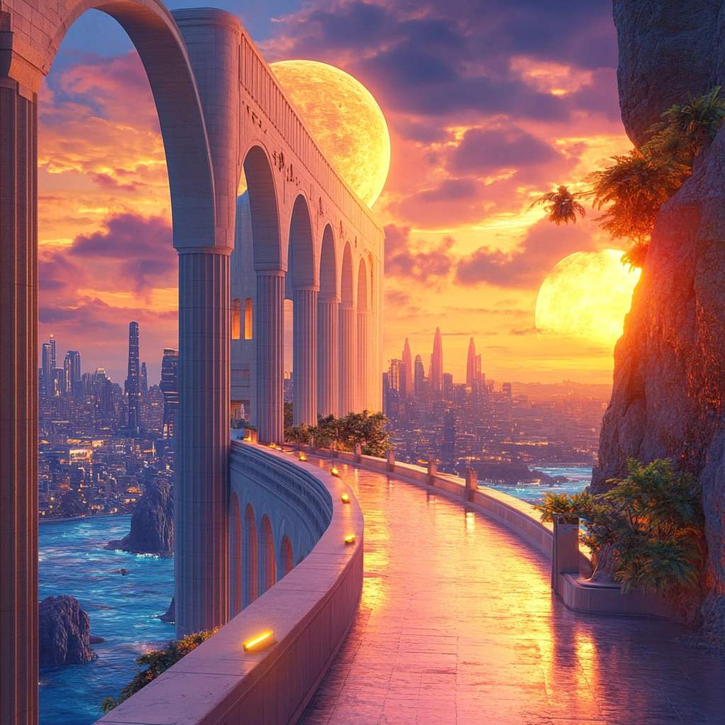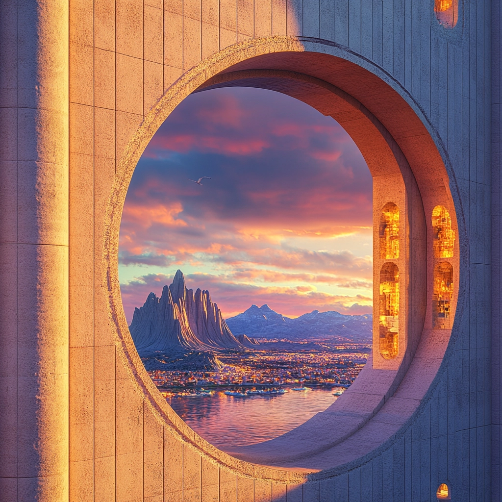 The lighting effects provide a warm glow that contrasts with cooler tones, emphasizing both the artificial structures and the natural surroundings, creating depth and texture. The careful use of color gradients enhances the dimensionality and spatial sense.