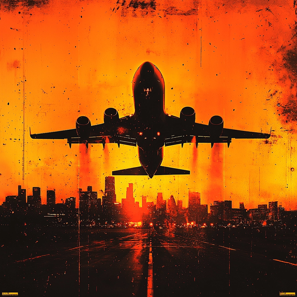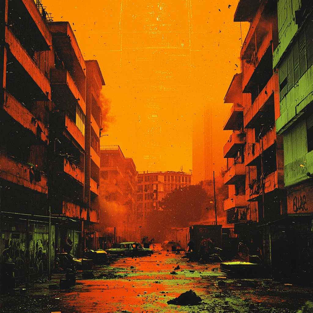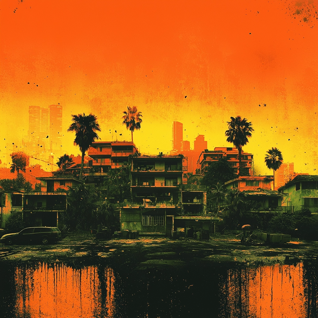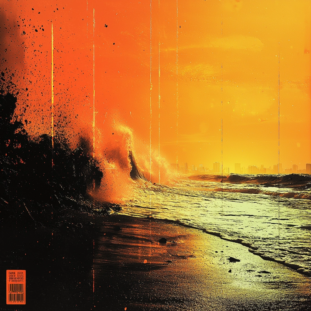 The bold use of orange delivers a vivid sense of heat and intensity, while the sharp blacks create dramatic contrasts. Lighting emphasizes angular forms and deep shadows, enhancing depth and texture throughout compositional elements.