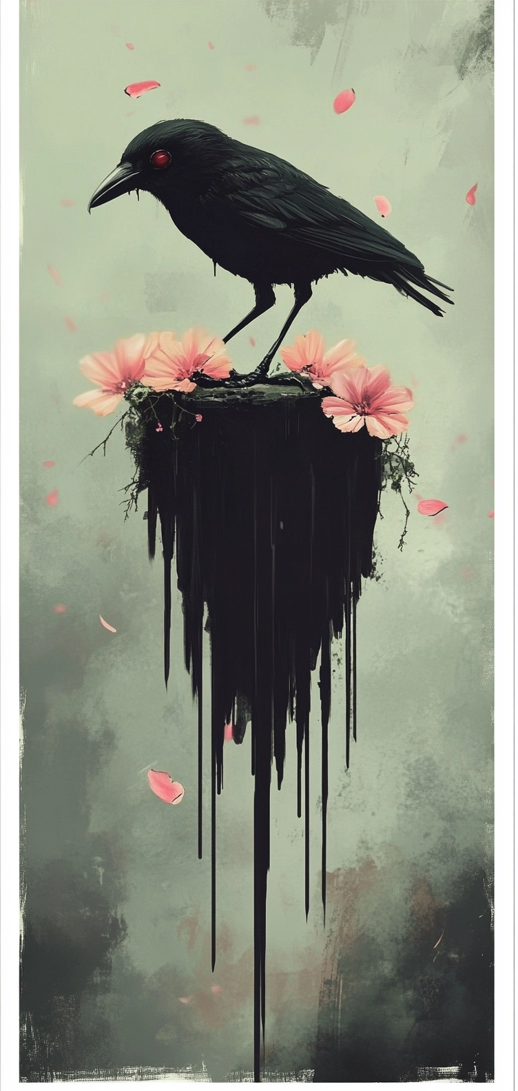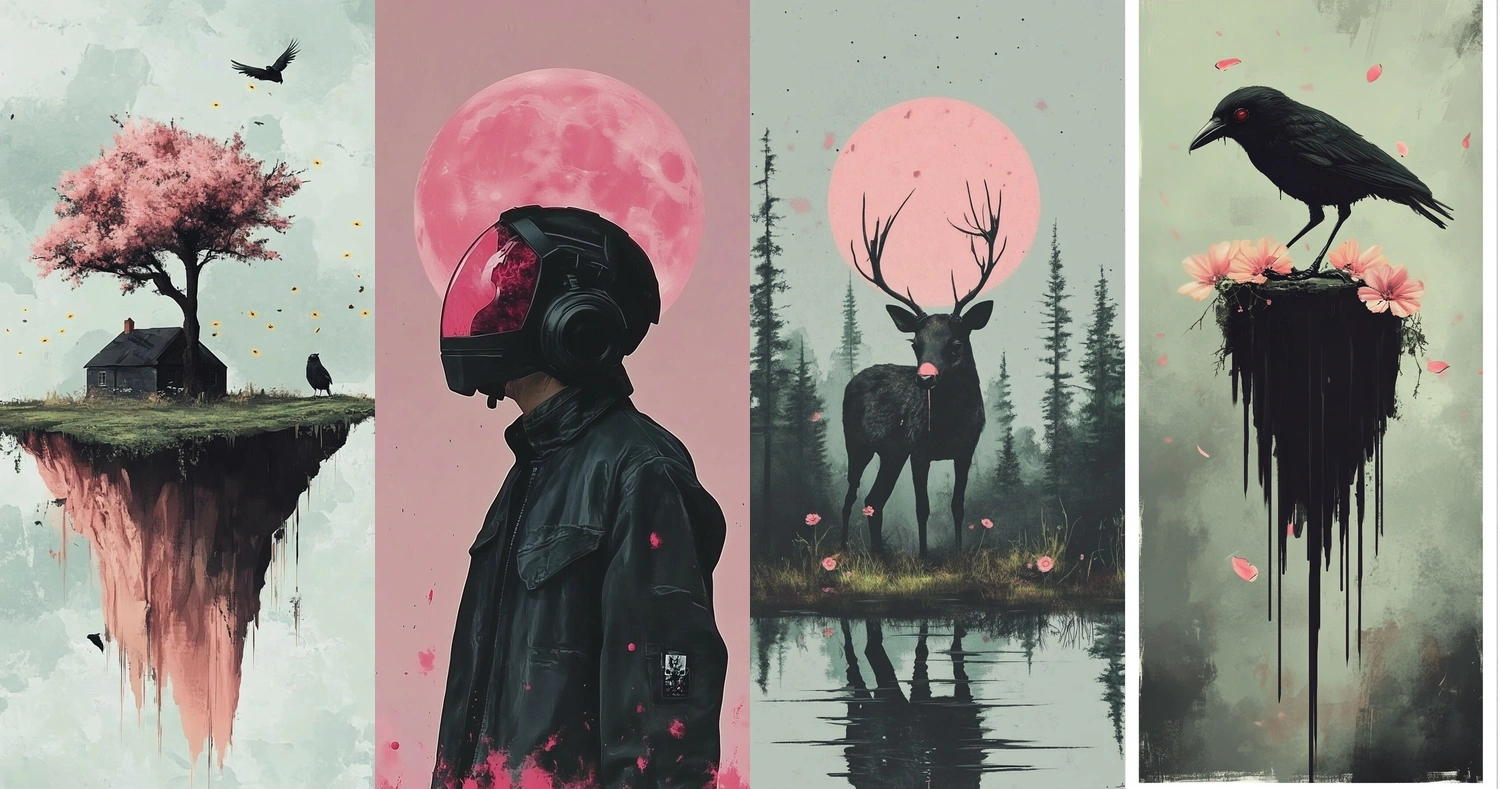 The use of bright pinks contrasts sharply with deep blacks, creating a bold, surrealistic space. Textures appear both soft and well-defined, with lighting amplifying the contrast between different elements, enhancing depth perception.