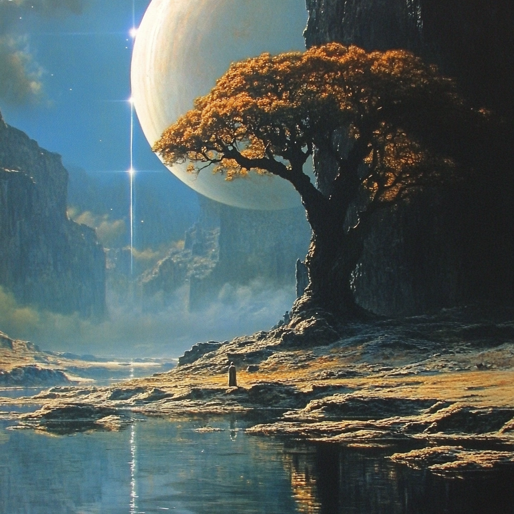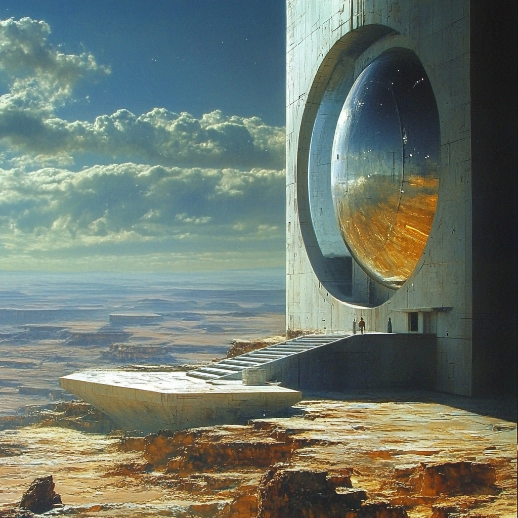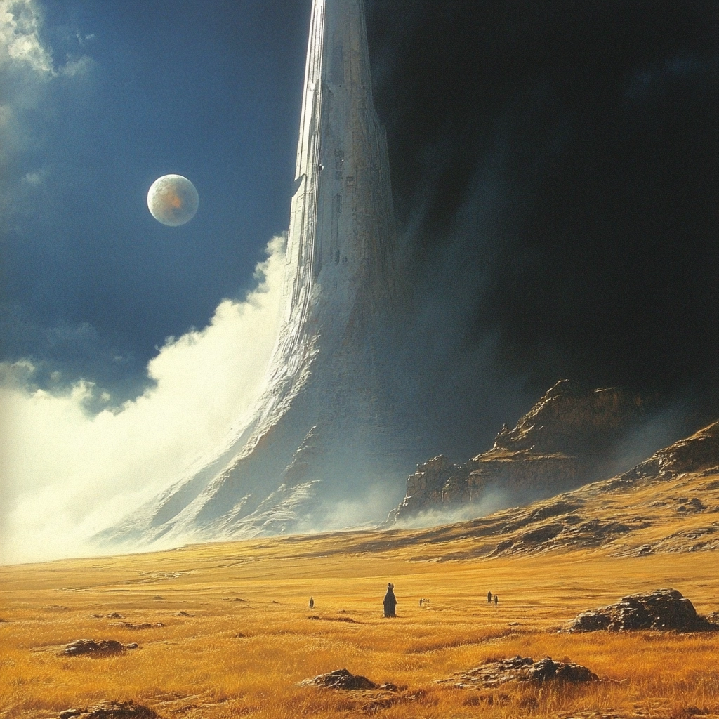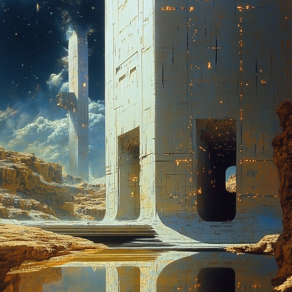 Lighting offers dramatic contrasts, highlighting large, looming forms against vast landscapes. The textures blend smooth surfaces with rugged terrains, creating depth and varied spatial perception. Gold and blue tones interplay for futuristic and natural impressions.