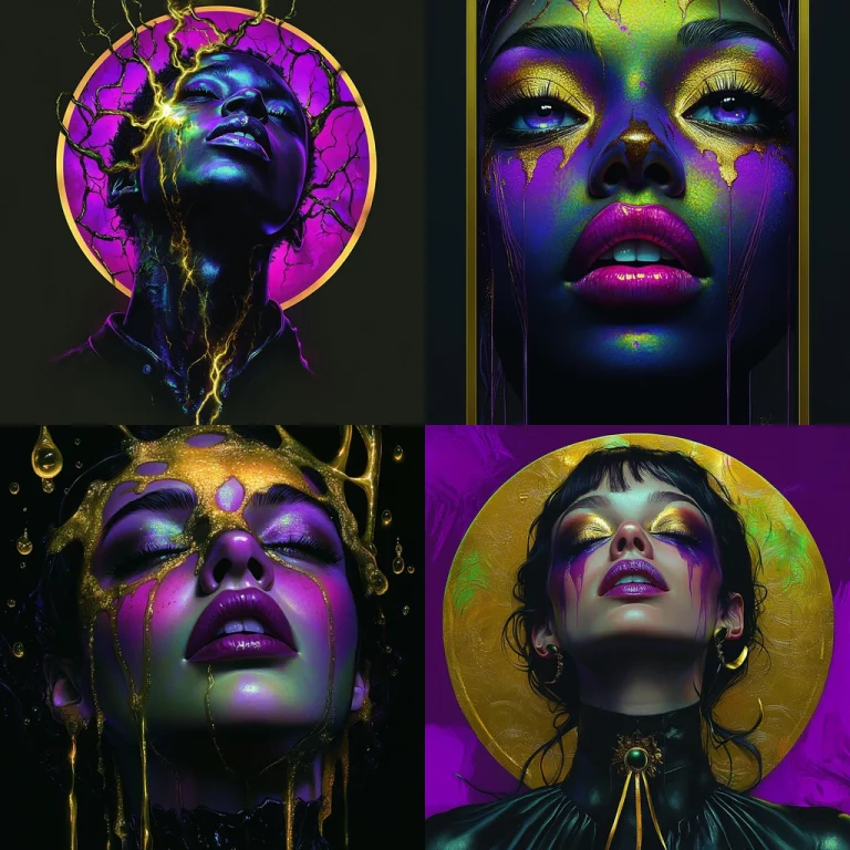Dynamic vivid hues create stark contrasts with surreal portrayals.