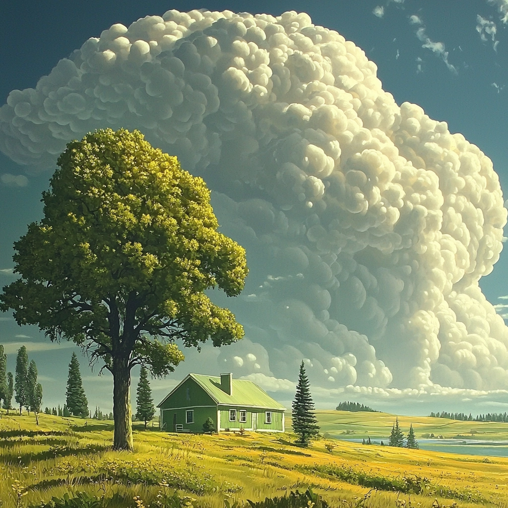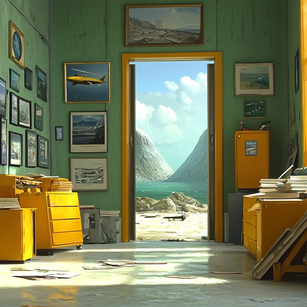 Vibrant green and yellow dominate, creating bold contrasts. Soft, diffused lighting enhances the surreal quality. Refined textures emphasize contours and boundaries, conveying depth through color juxtaposition.