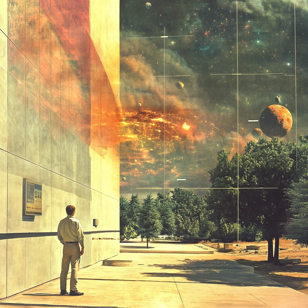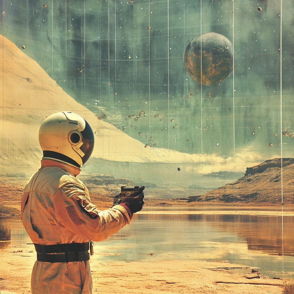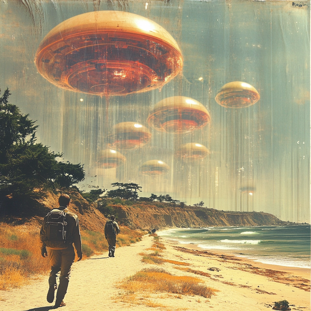 A surreal landscape with golden hues and cyan skies, combining futuristic and natural elements.