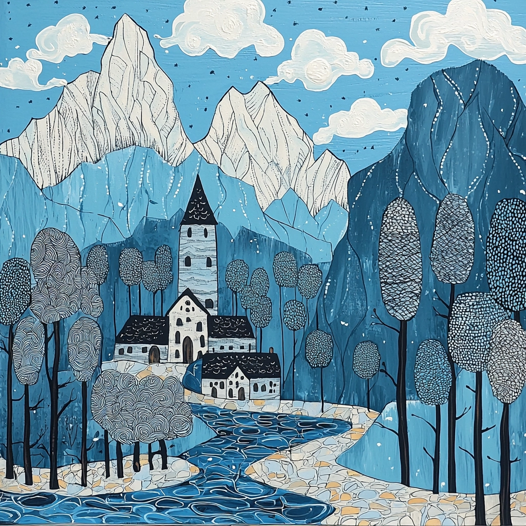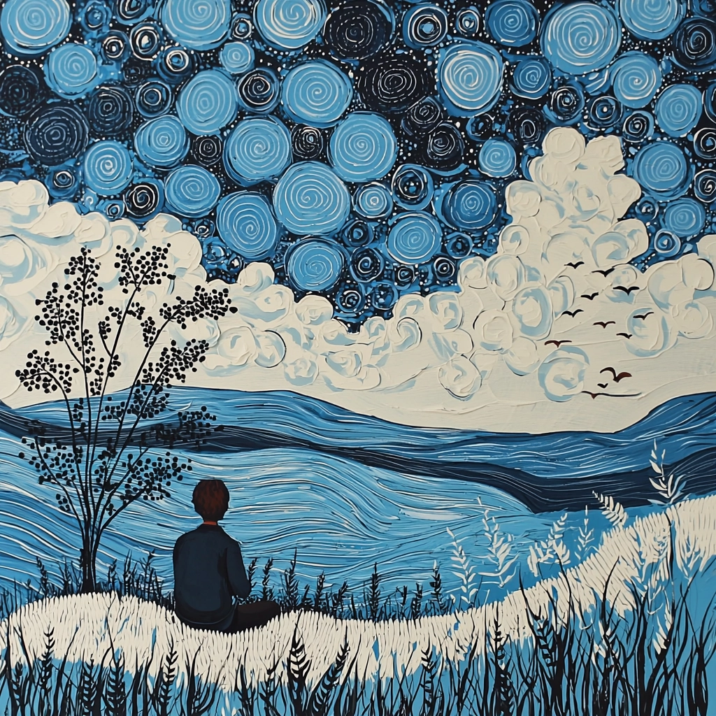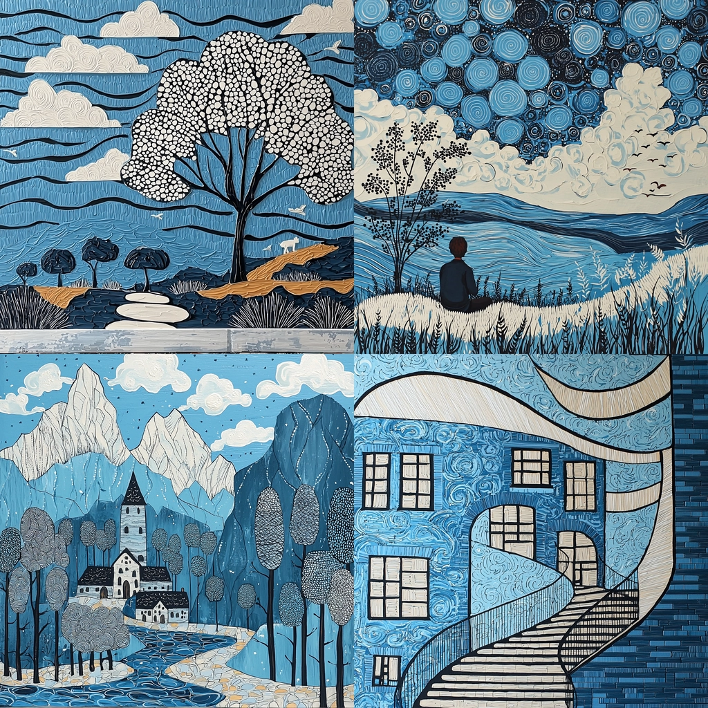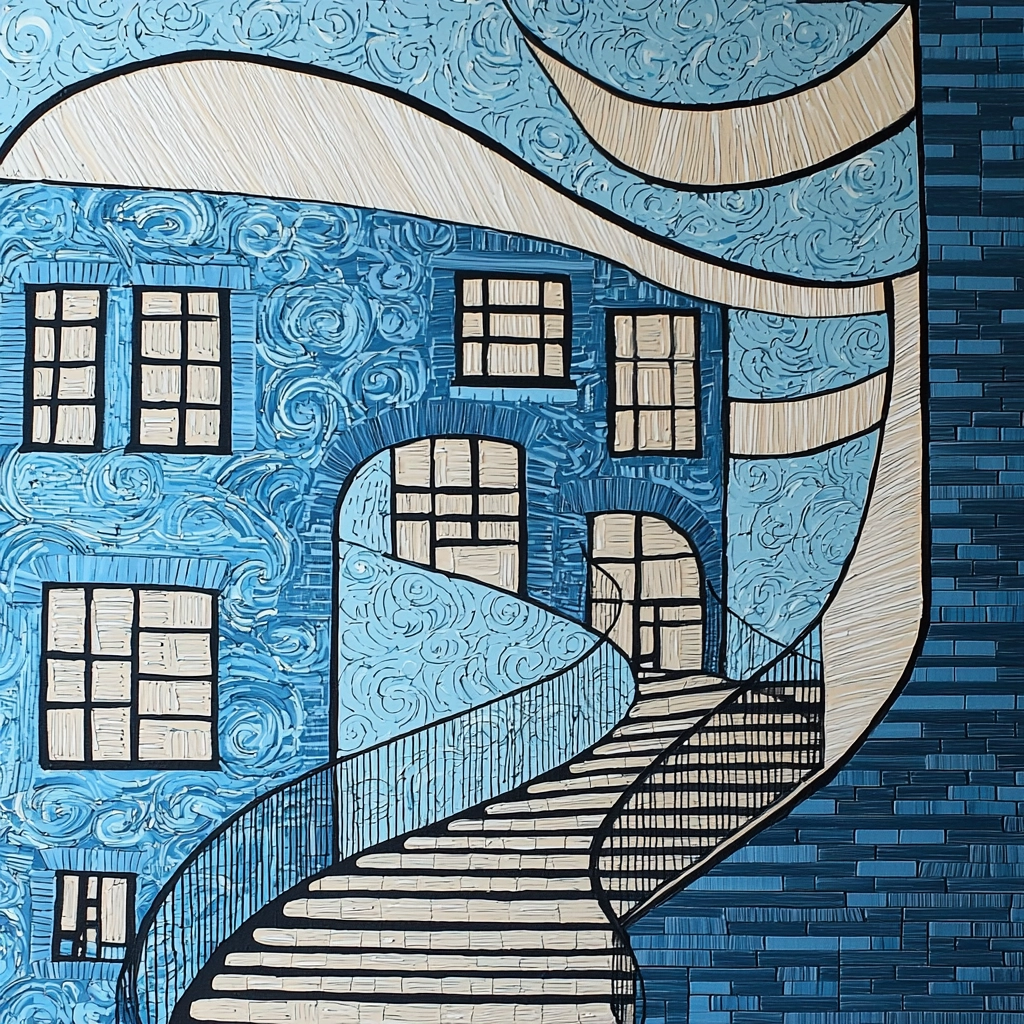Use of swirling patterns, blue-dominated palette, and intricate line work.