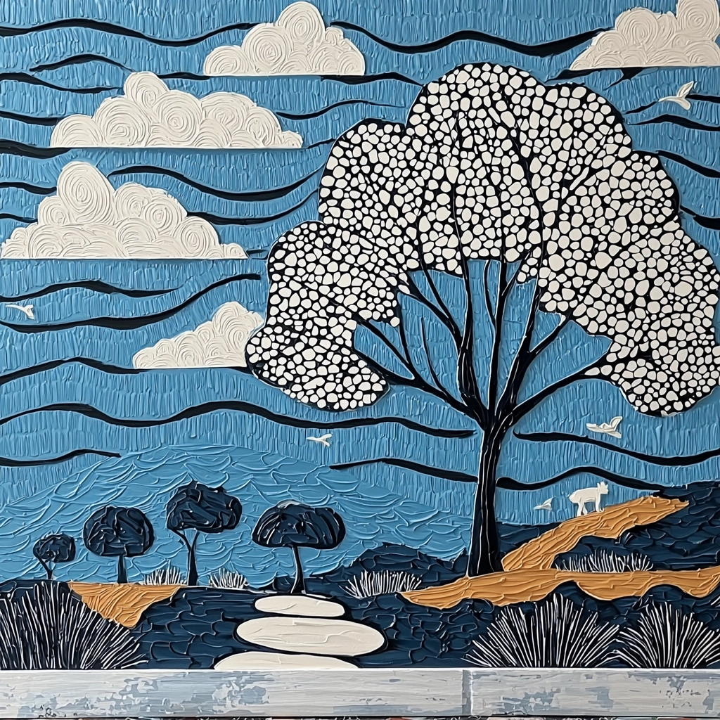 Dynamic use of swirling patterns creates a sense of movement, with blue tones dominating the color scheme. The textures are detailed, giving a tactile quality to the surfaces. The lighting is consistent and subtle, emphasizing the flow of lines and shapes.