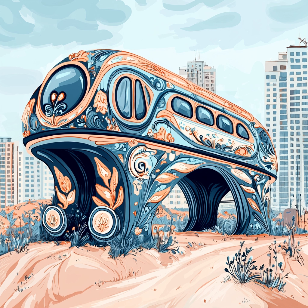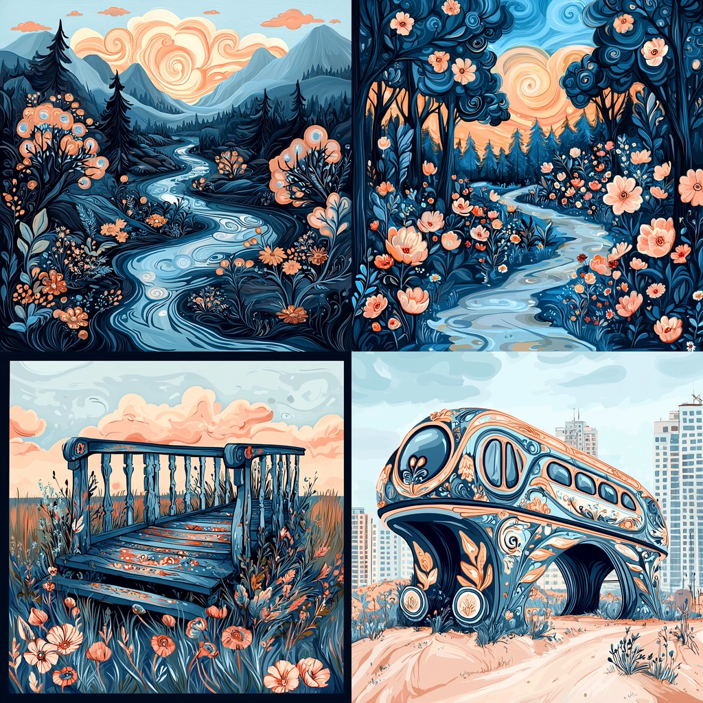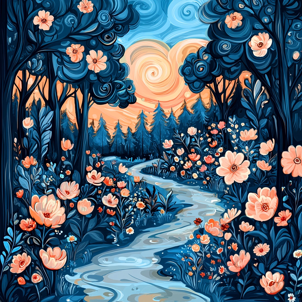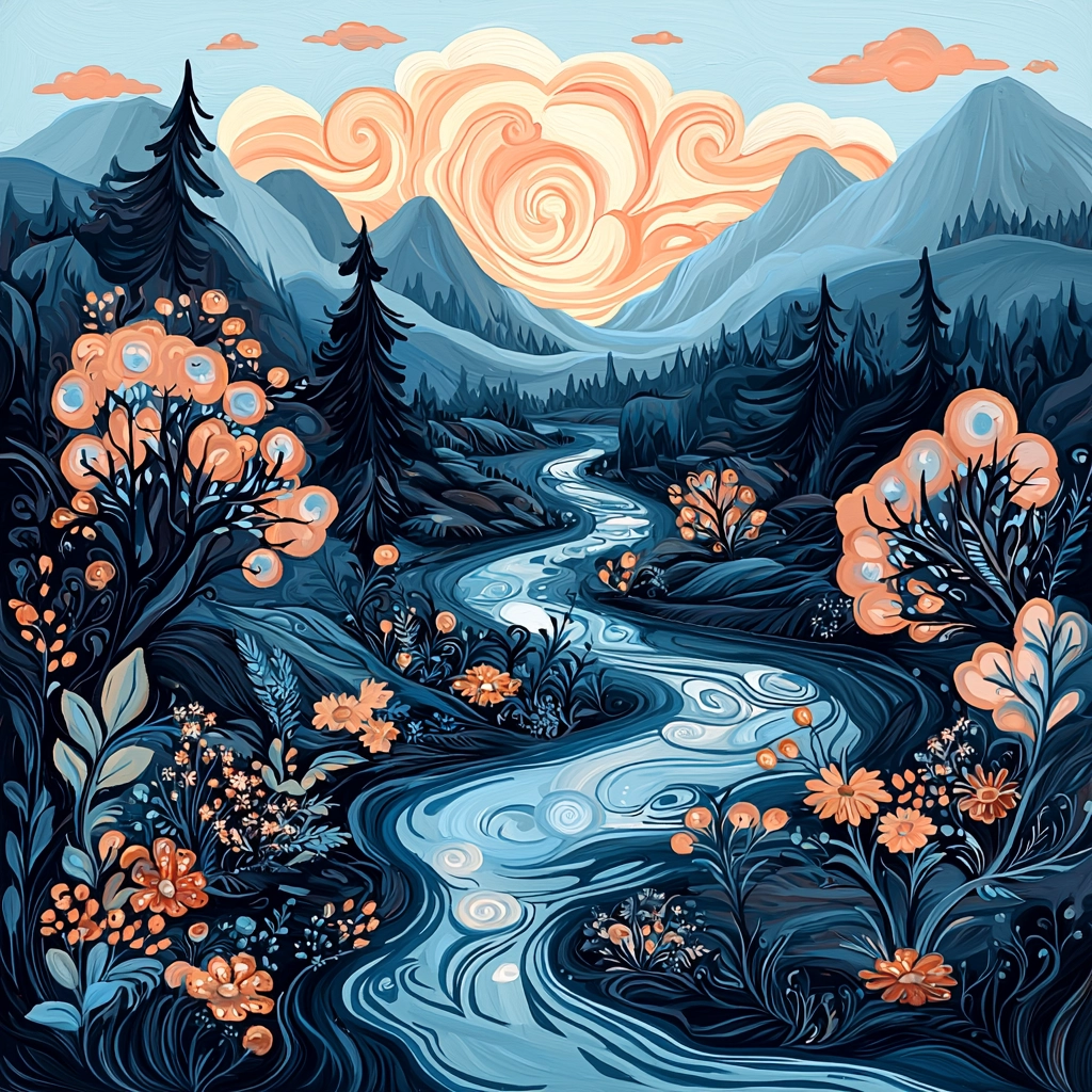 Lighting effects highlight swirls of indigo, while peach provides a warm contrast. The spatial sense is fluid with intertwining lines, and textures are richly depicted with flowing curves and layered depth.