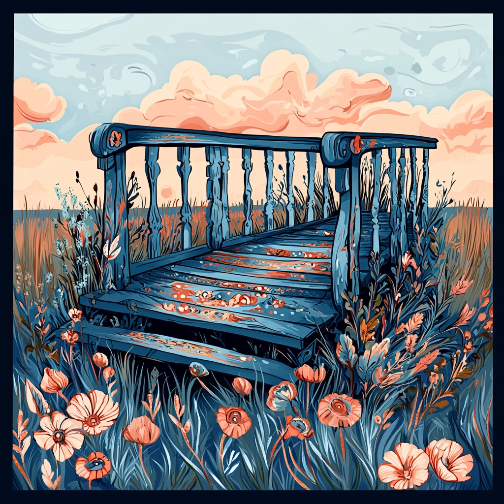 Dynamic composition with flowing indigo lines and warm peach undertones, creating a lively atmosphere.