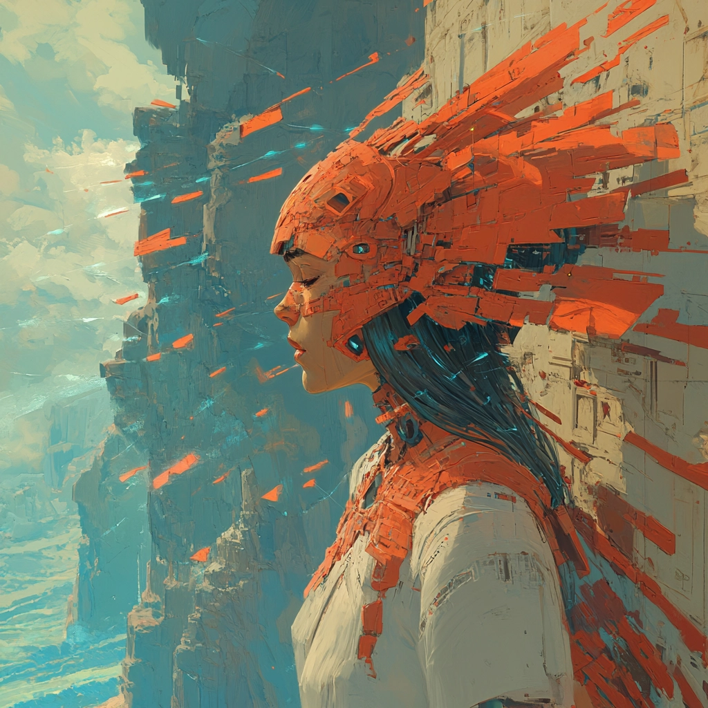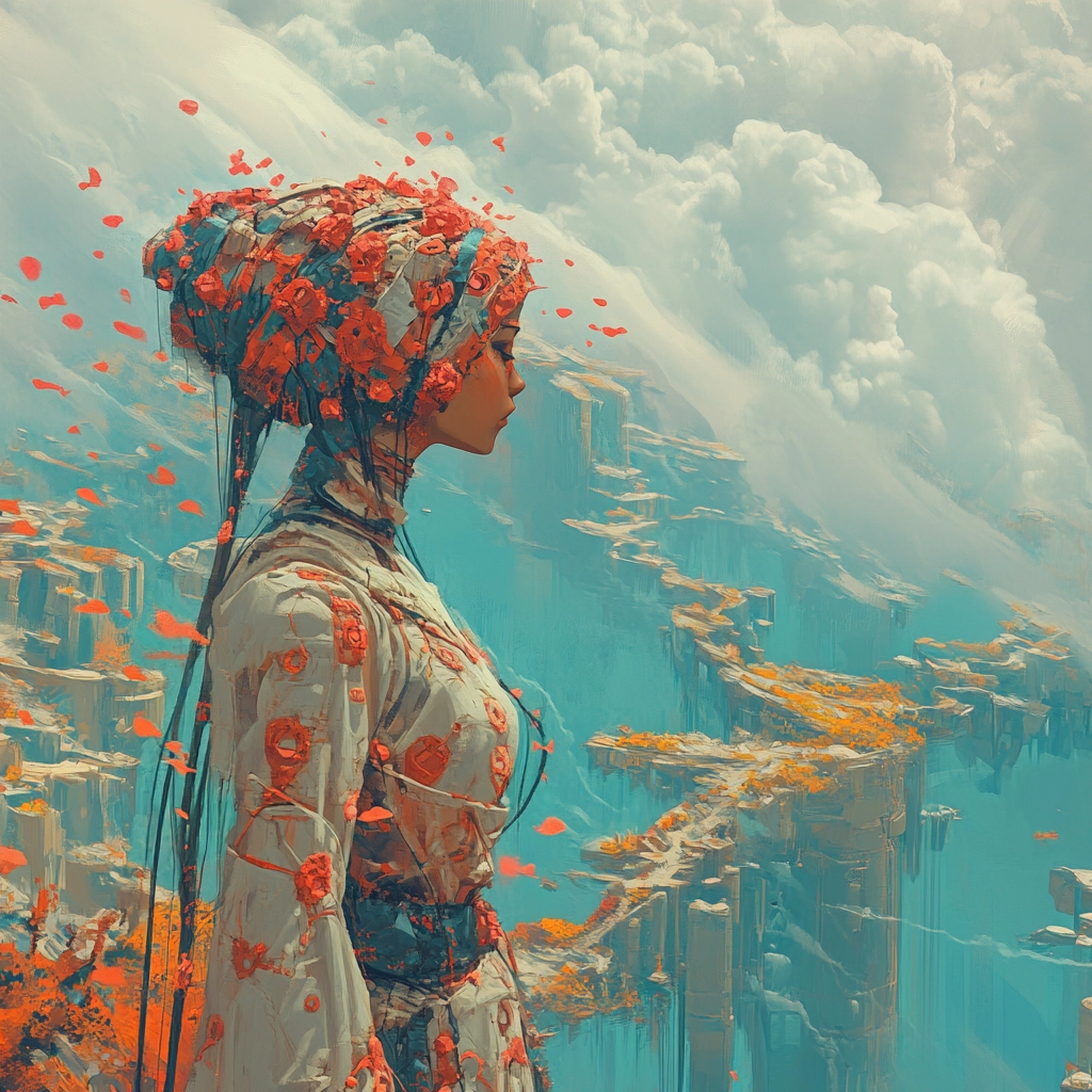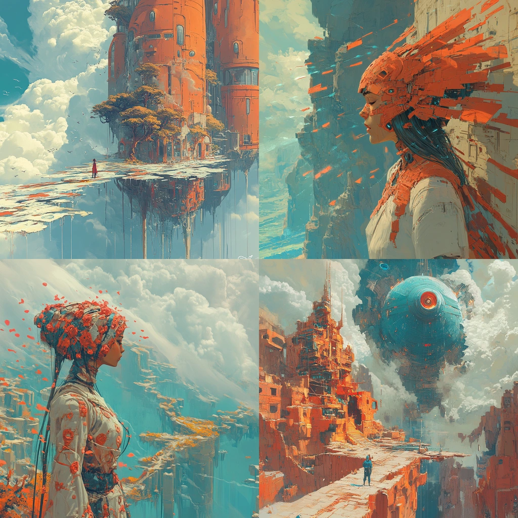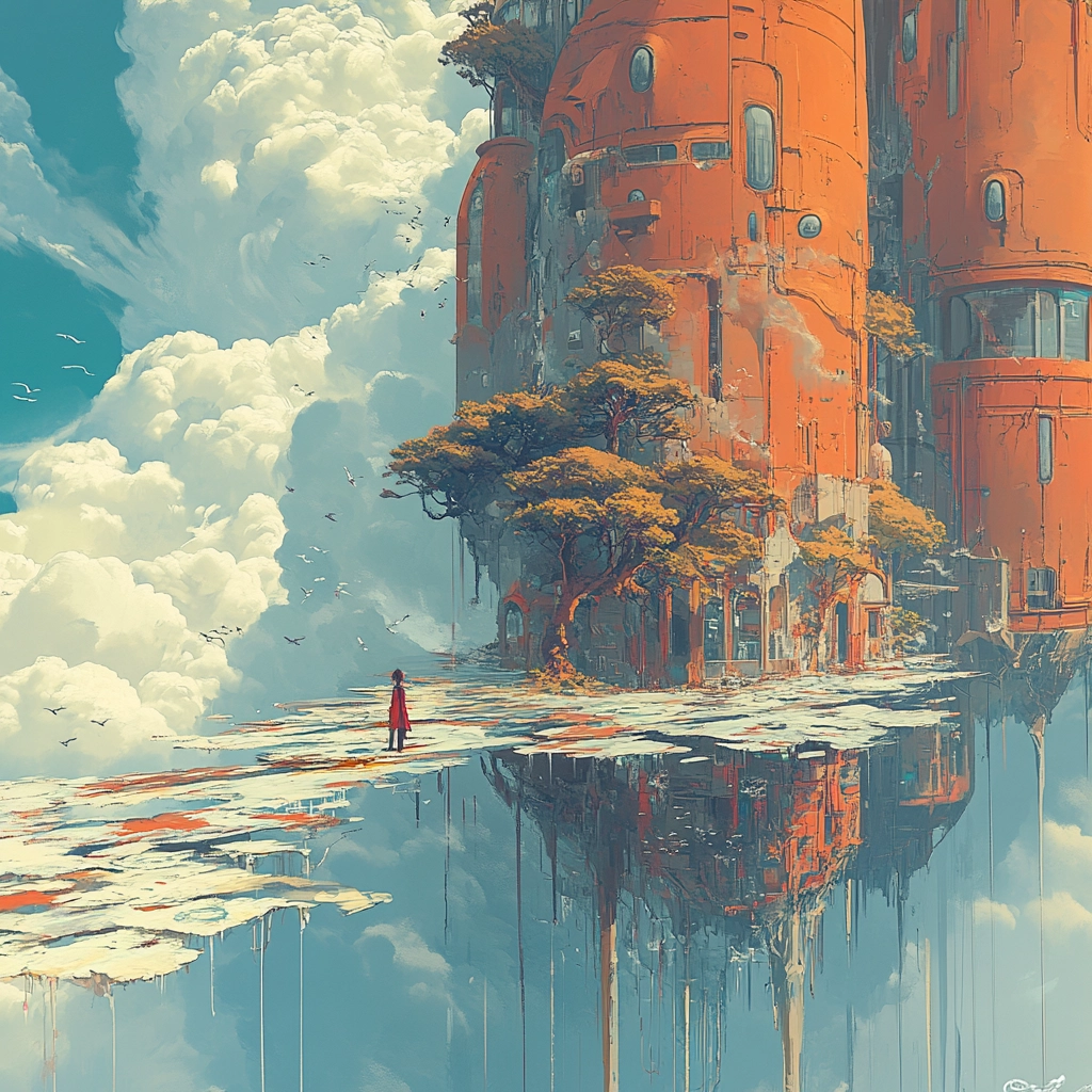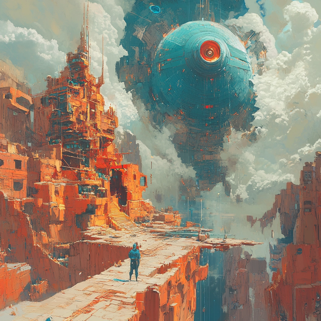 Intricate lighting enhances depth, with robust colors defining dynamic spaces and solid textures. The landscape features vivid contrasts between artificial and natural, capturing an expansive spatial essence.