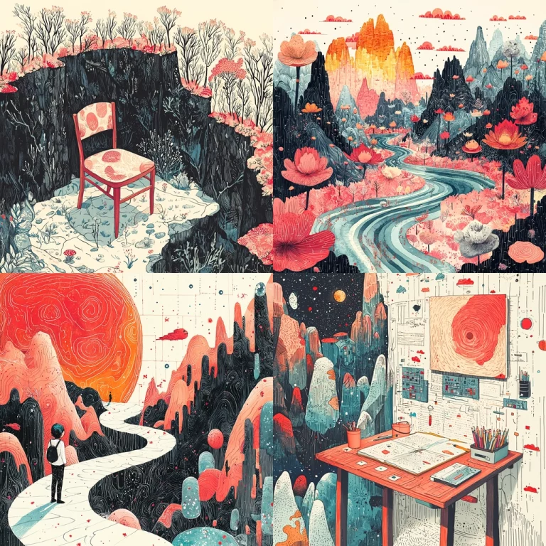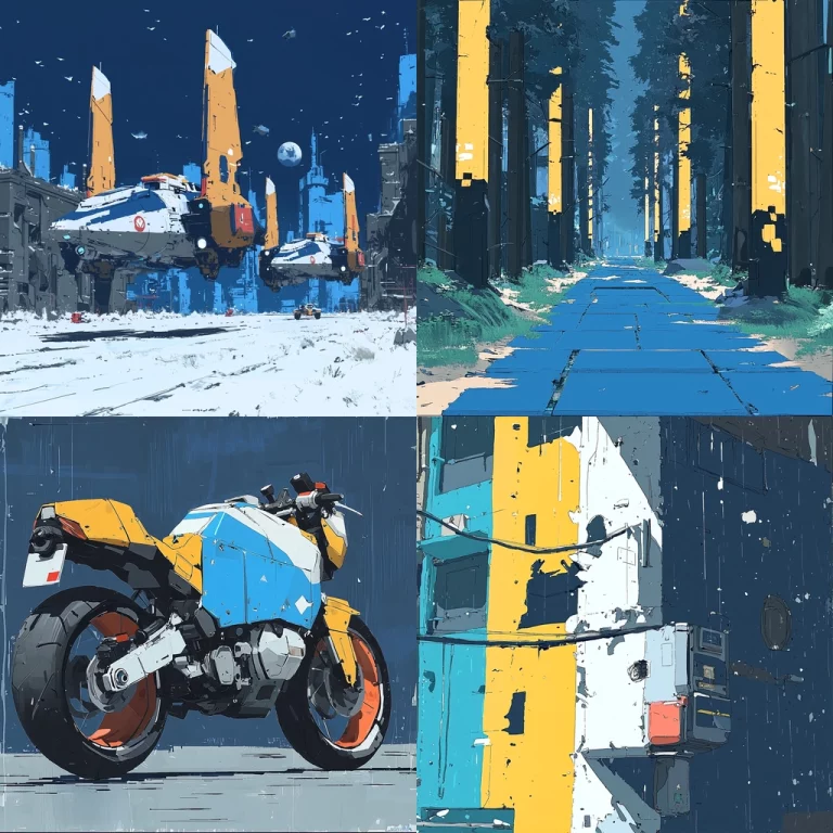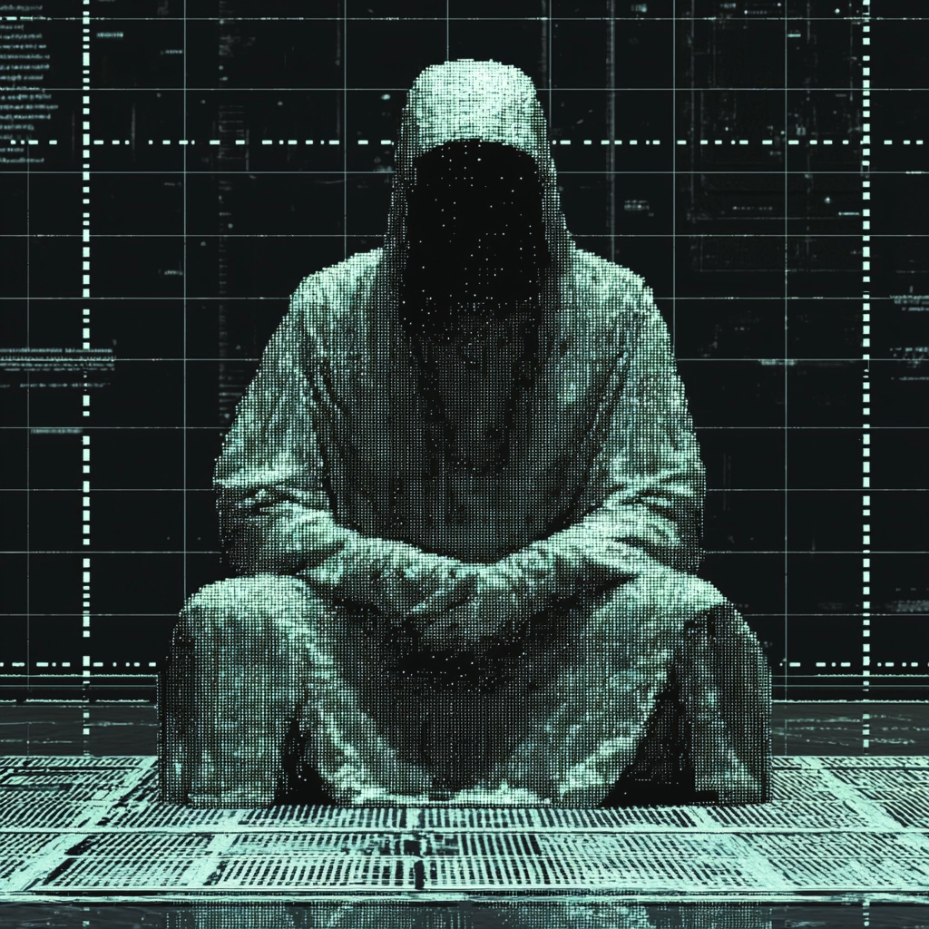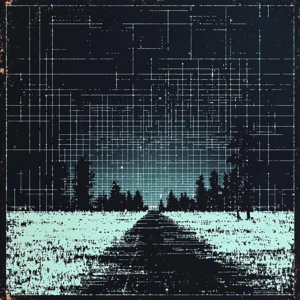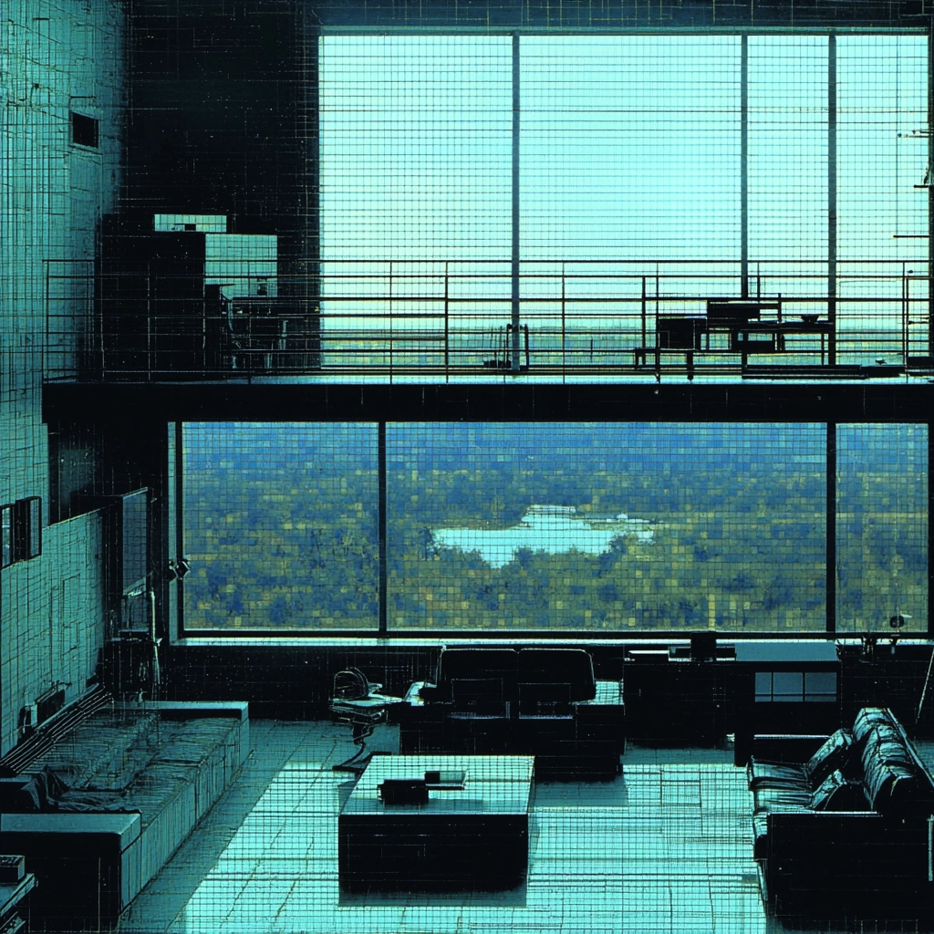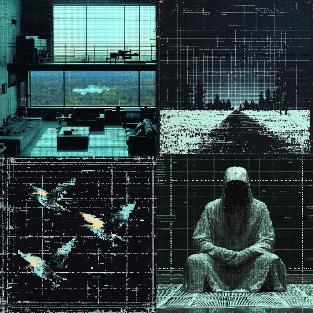The use of lighting effects creates a stark contrast between light and shadow, enhancing the spatial sense and depth. The composition employs a grid-like pattern, emphasizing texture through digital-like pixels. Cool tones dominate, reinforcing a technological aesthetic.
