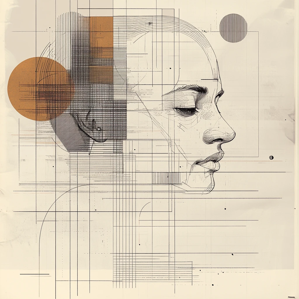 Fine parallel lines intersect with circular motifs and angular grids, while subtle sepia tones warm the monochromatic palette. Translucent layers build depth through overlapping geometric elements and precise architectural measurements.