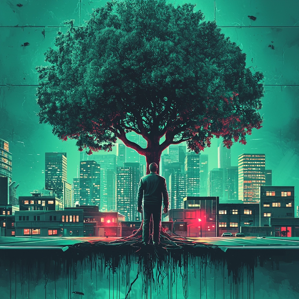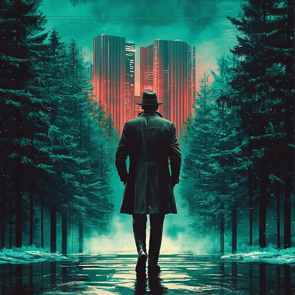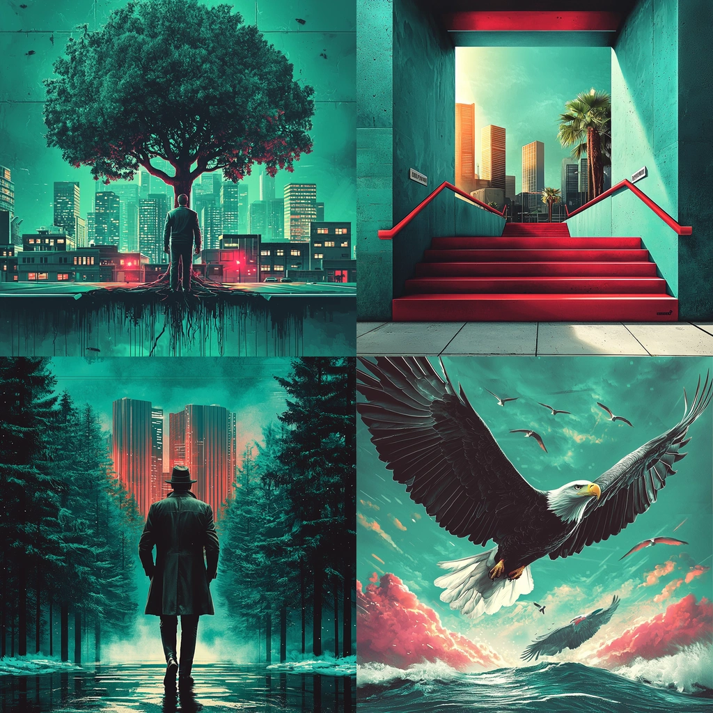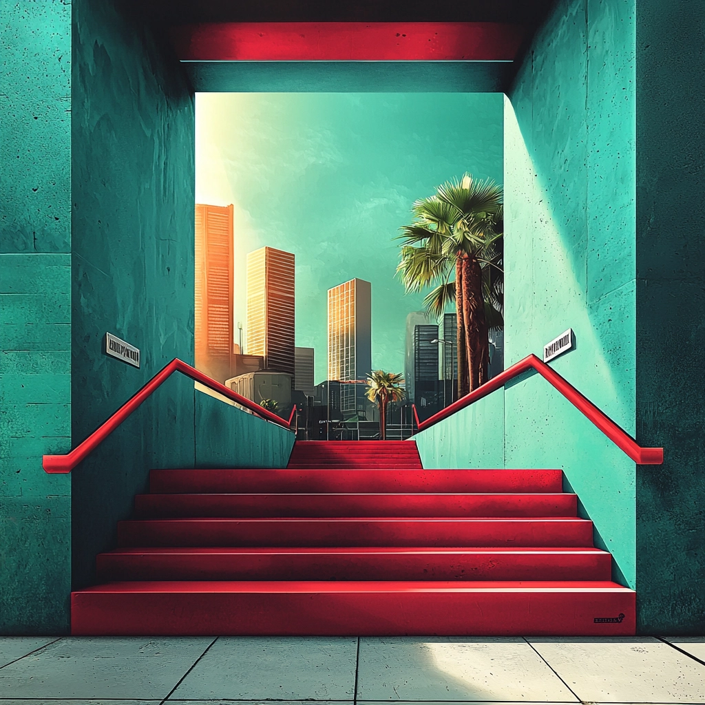 Bright cyan contrasts with deep red, creating a striking visual tension. The lighting emphasizes depth and form with sharp edges and shadow play, achieving a vivid, dramatic spatial effect.