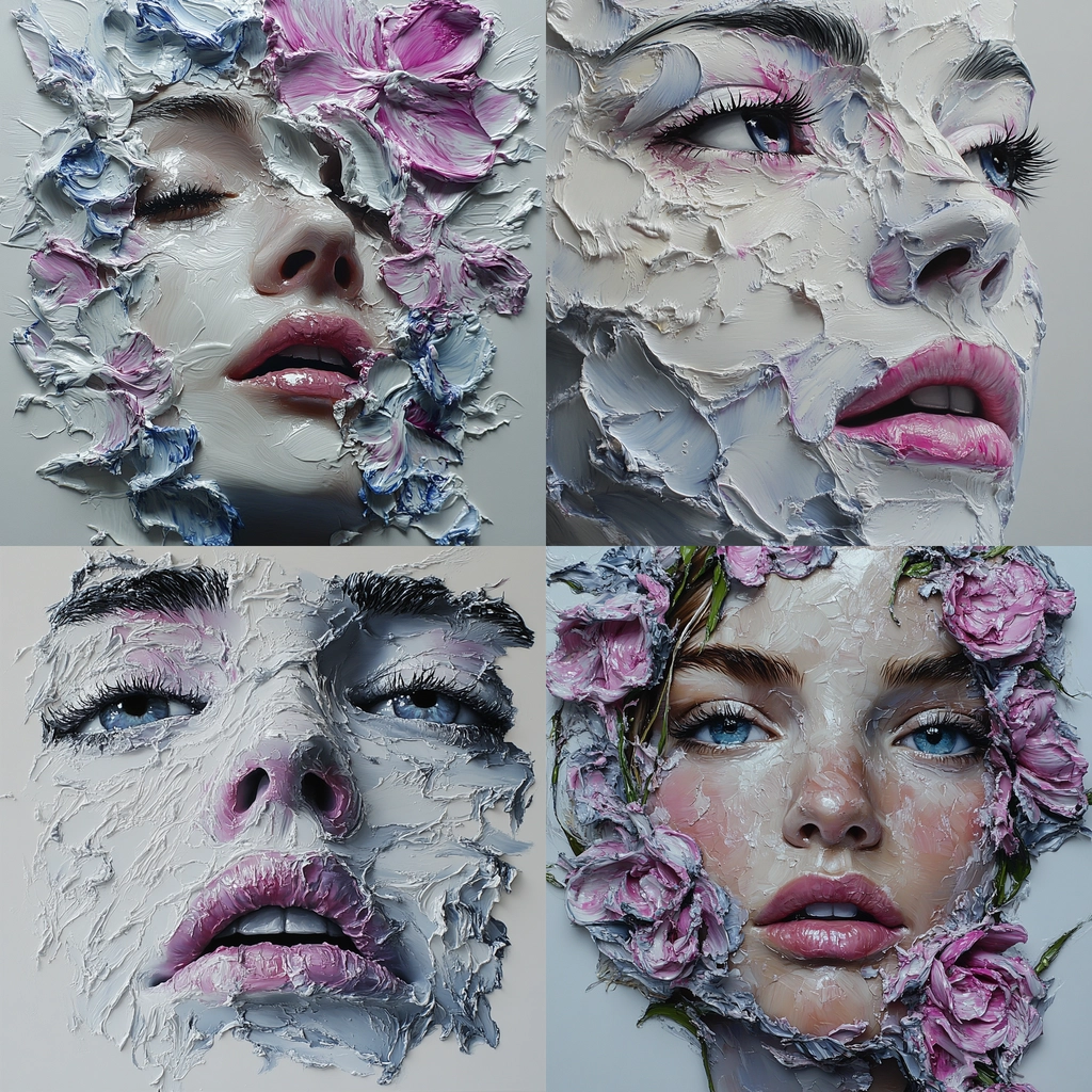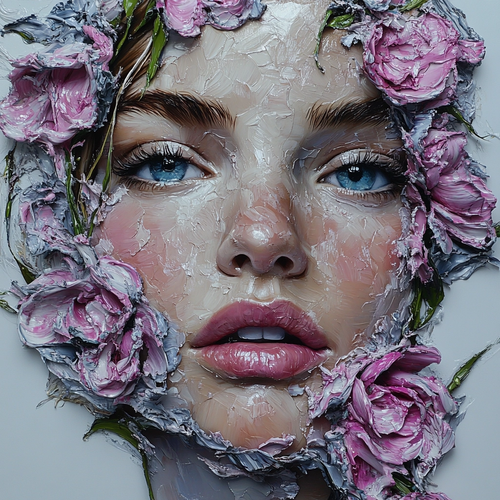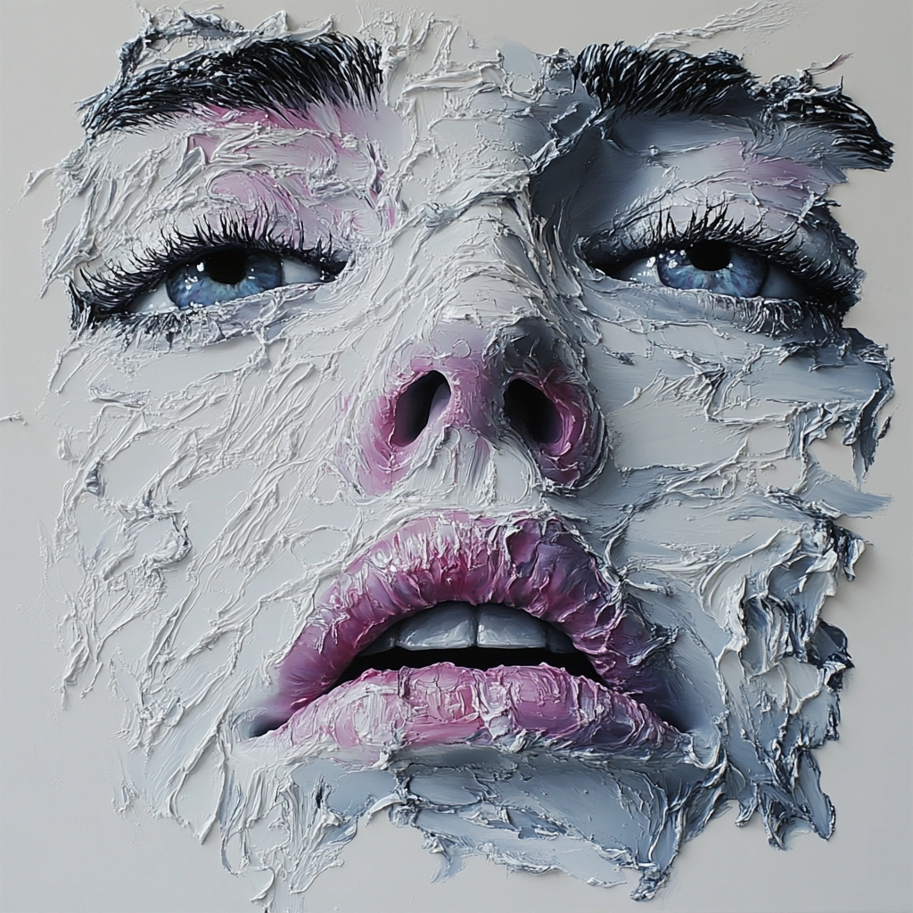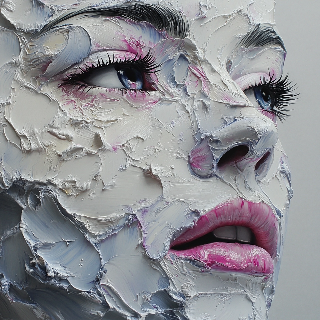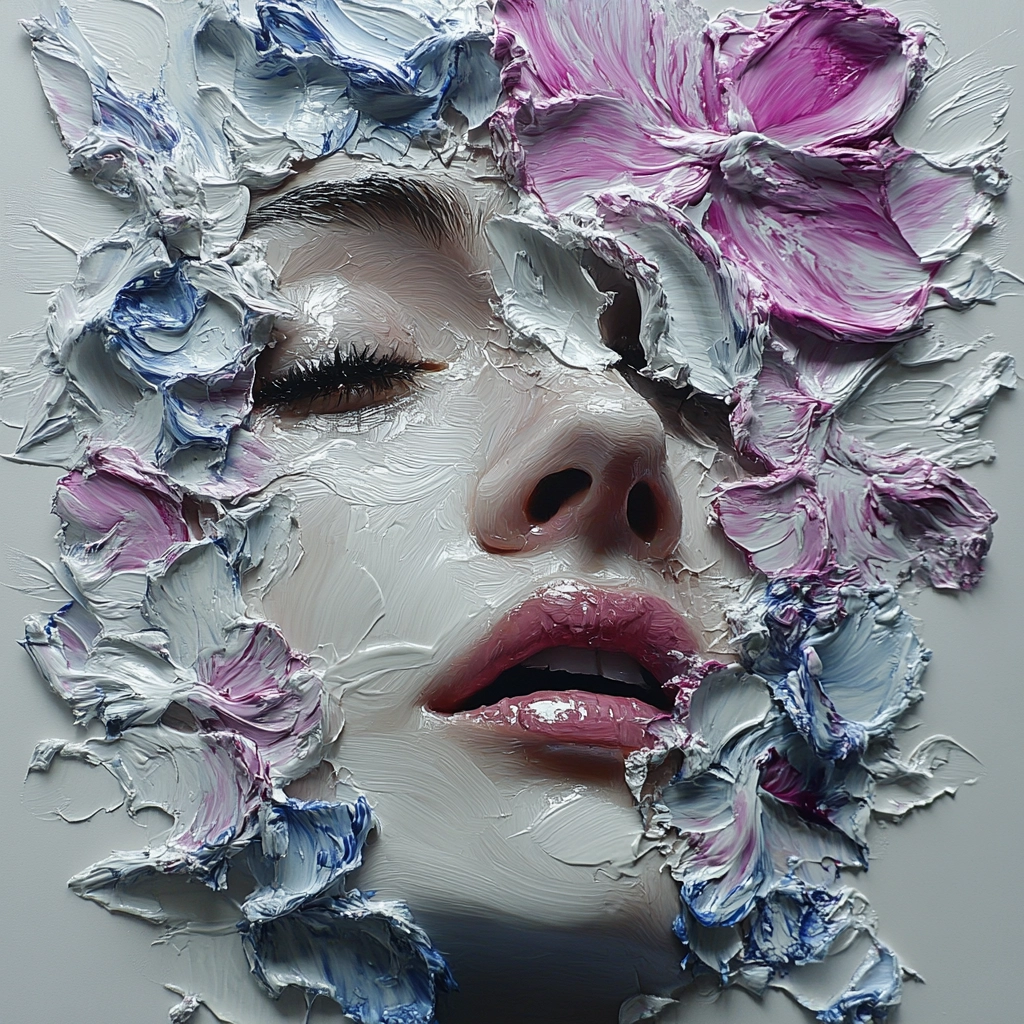 The art employs thick, textured brushstrokes creating a tactile surface effect. Pastel hues like pink and blue are applied with dynamic strokes, imparting a spatial depth that draws the viewer in. White accents subtly enhance the visual clarity and balance.