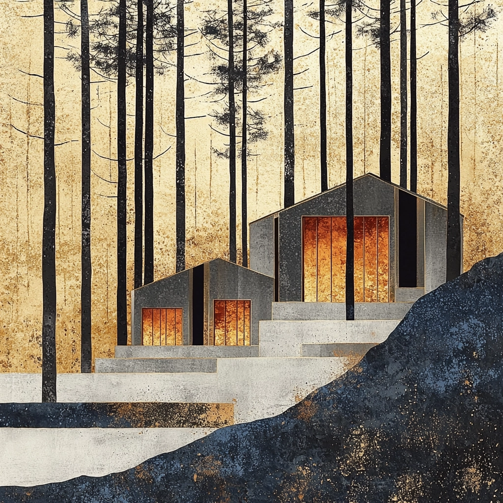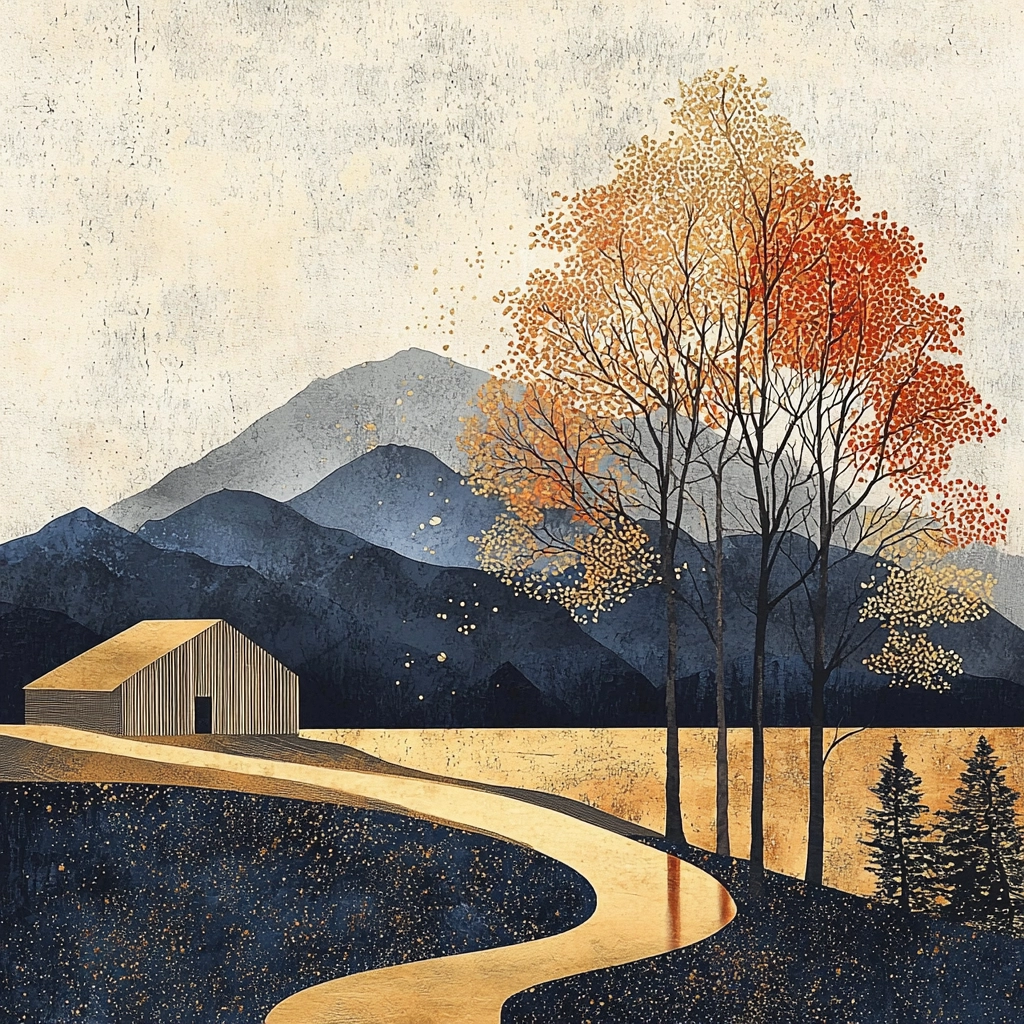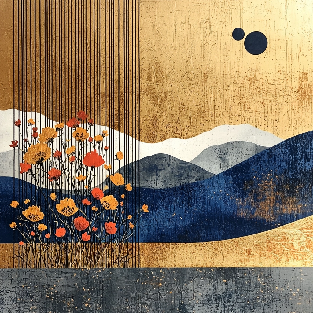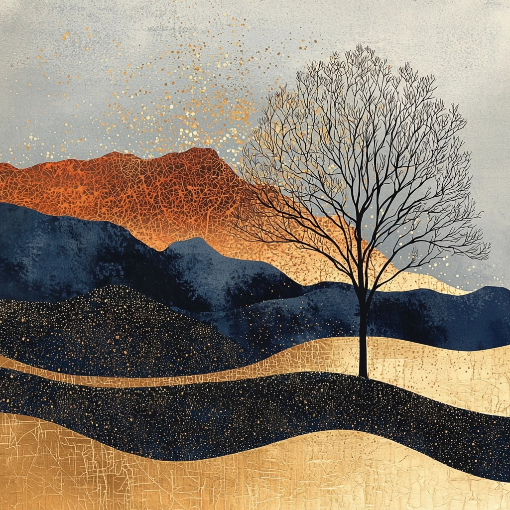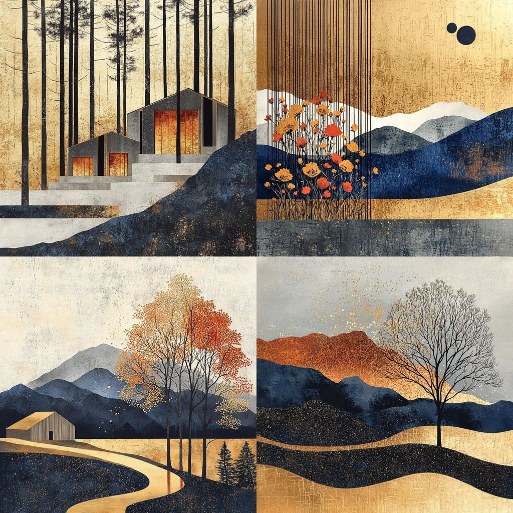 Rich gold and dark blue dominate, creating contrast with textured layers for a balanced visual hierarchy.