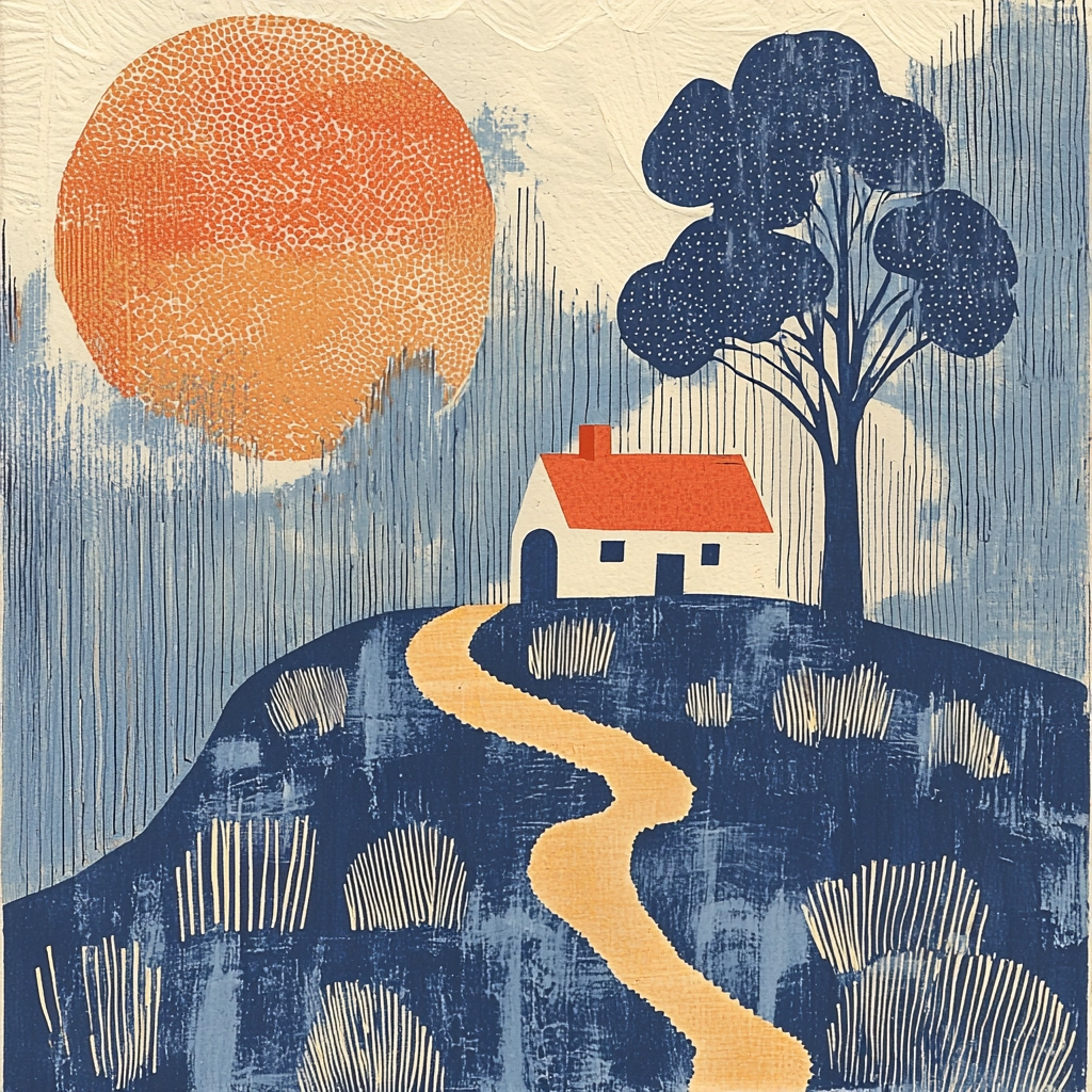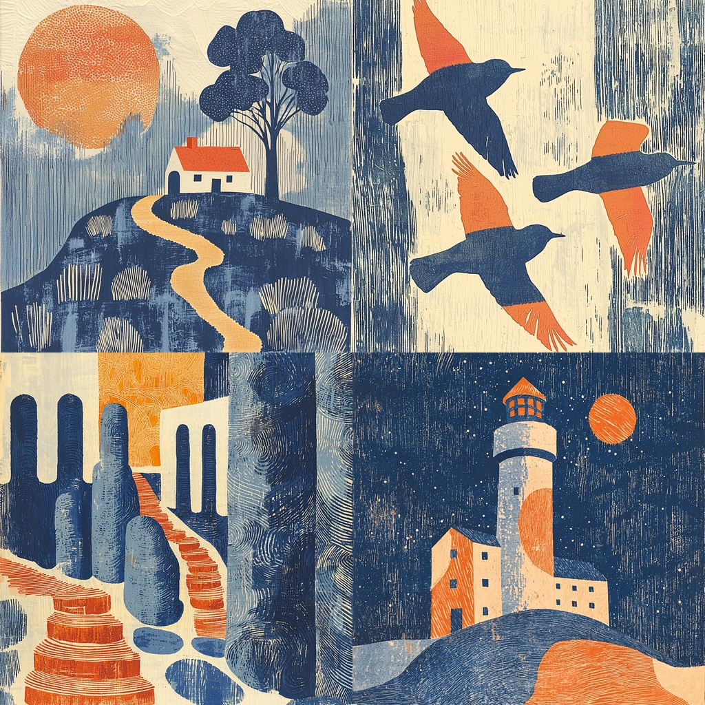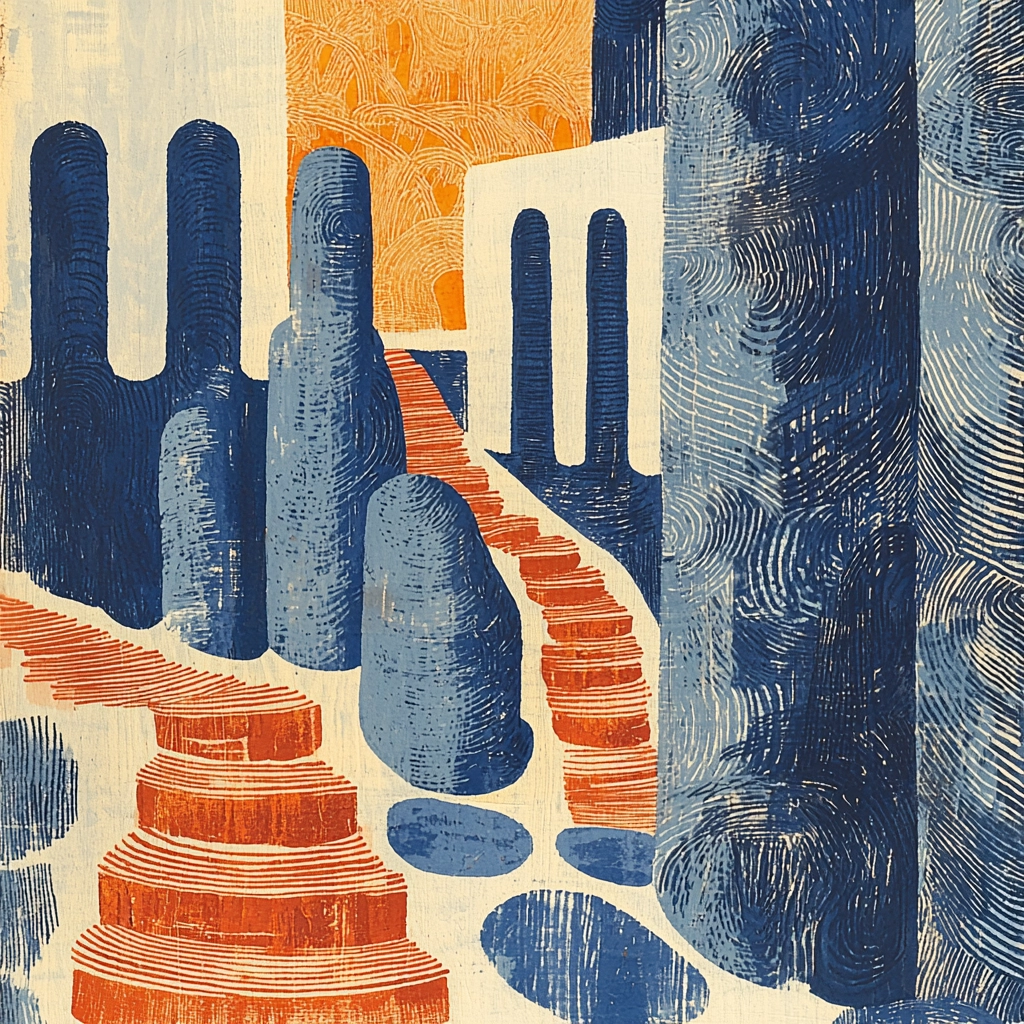 Textured elements are highlighted with contrasting blue and orange, creating dynamic lighting effects. The spatial composition emphasizes bold shapes and layered textures, enhancing the visual impact.