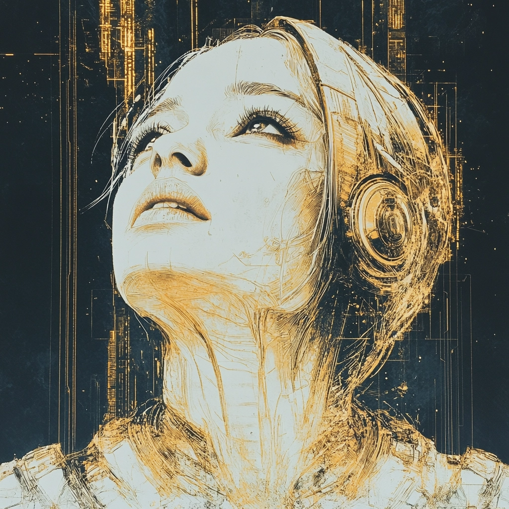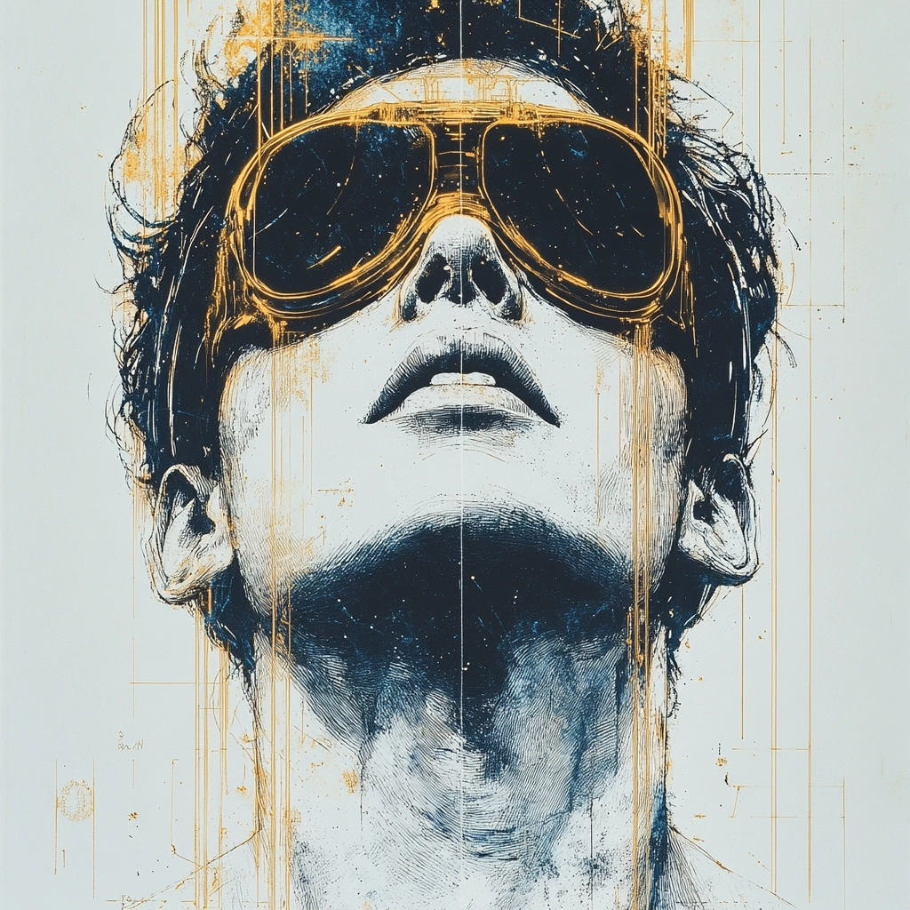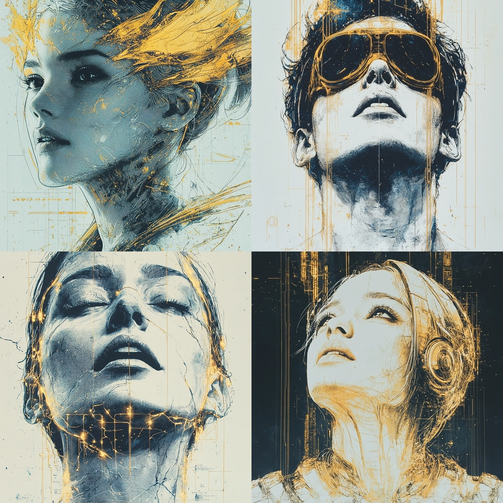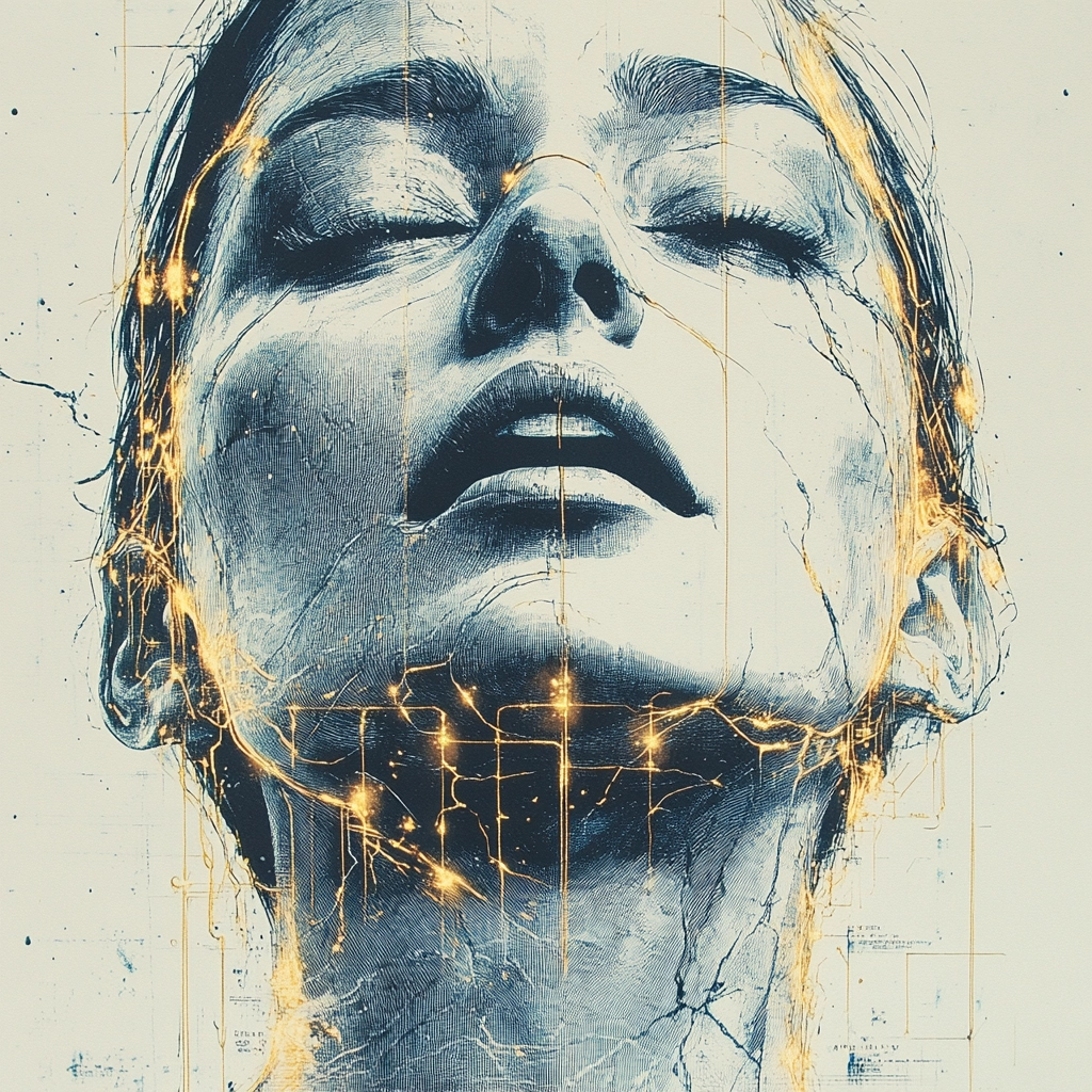 Lighting is applied to emphasize contour and form, producing a dimensional feel through sharp contrasts between shadows and highlights. The gold accentuation introduces a metallic texture against soft matte blue and beige tones. Fine linear marks suggest structural complexity while subtle gradient shifts enhance volume and depth. Spatial organization maintains portrait-focused intimacy with layered surfaces that engage foreground and background distinctly.