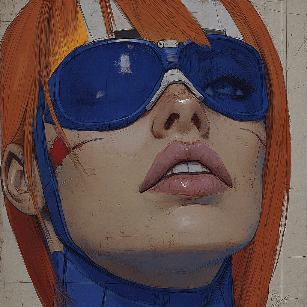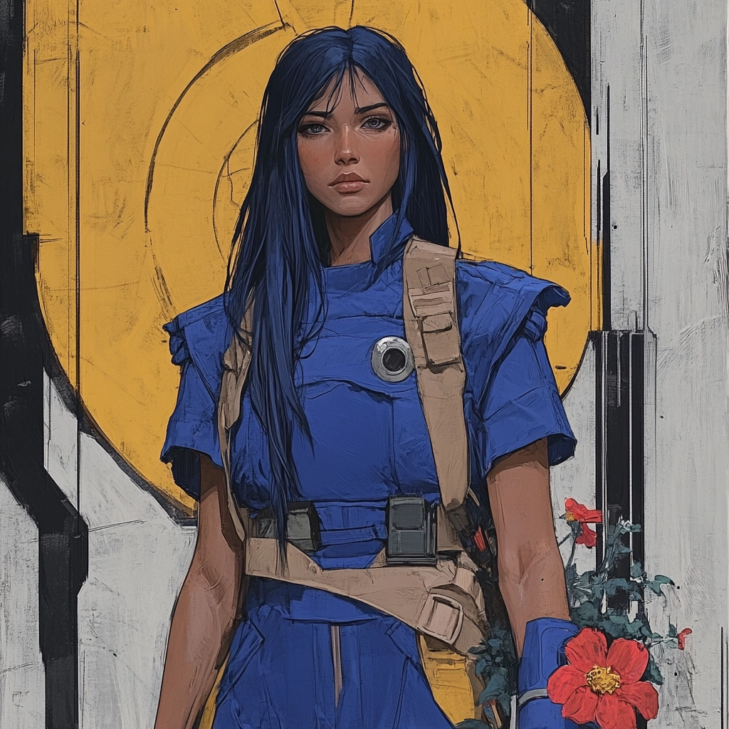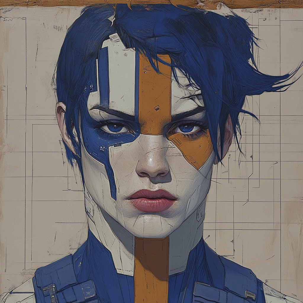 The artwork features vibrant blue clothing against muted geometric backgrounds, contrasting with pops of orange and gray, creating a vivid and structured visual appeal.