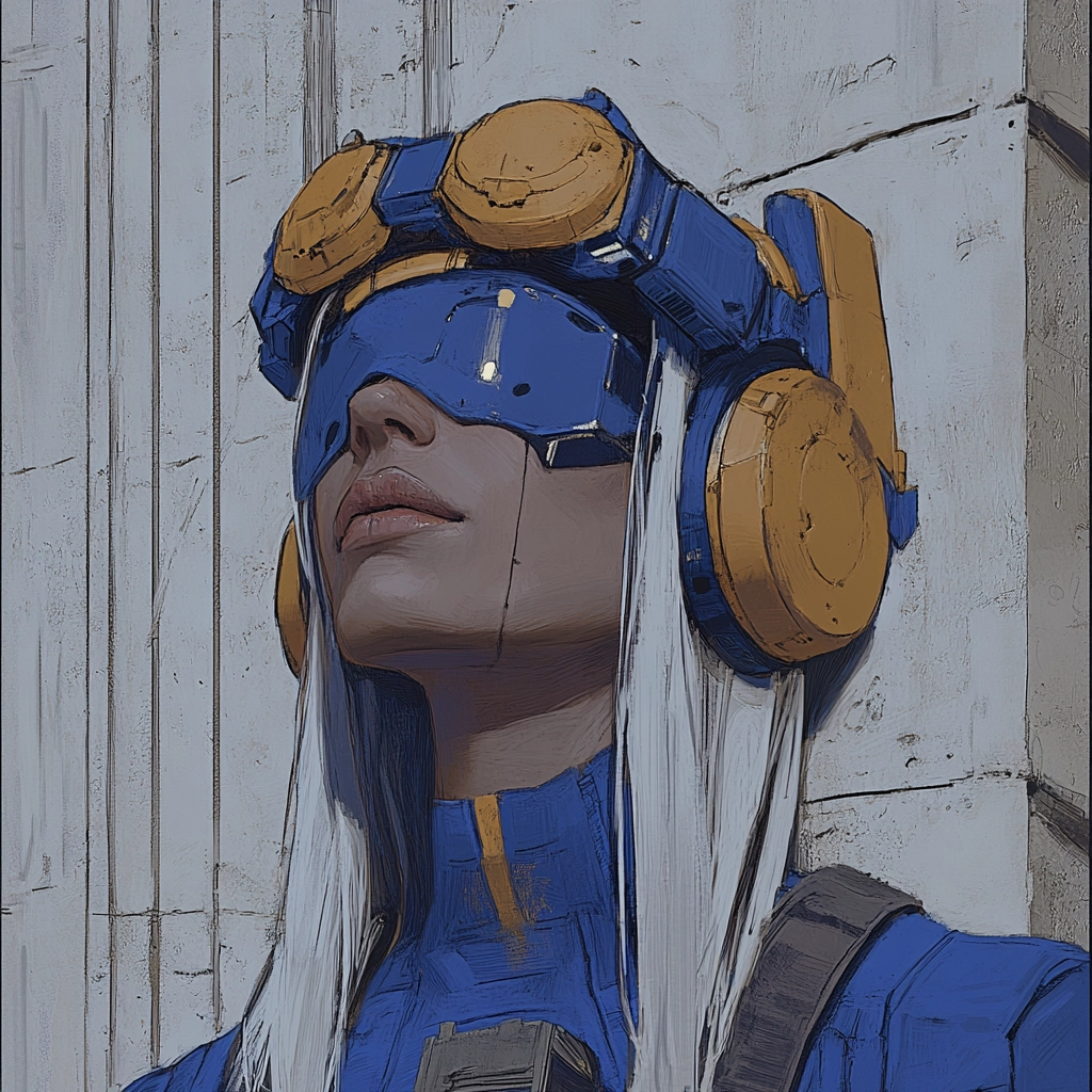 Strong lighting accentuates the contrast between vibrant blue and muted backgrounds, with a clear delineation between materials. Color is used purposefully to define the scene's spatial organization, providing a structured and organized feeling through geometric forms and carefully detailed textures.