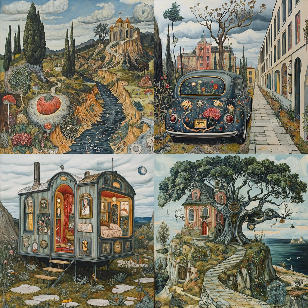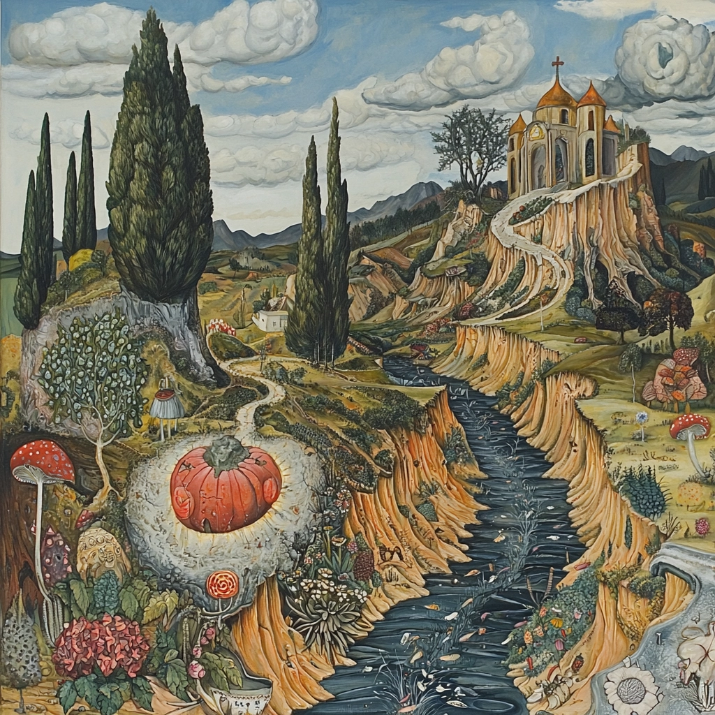 Intricate landscapes depicted with diverse textures and vibrant yet earthy colors, forming a compelling visual interplay.