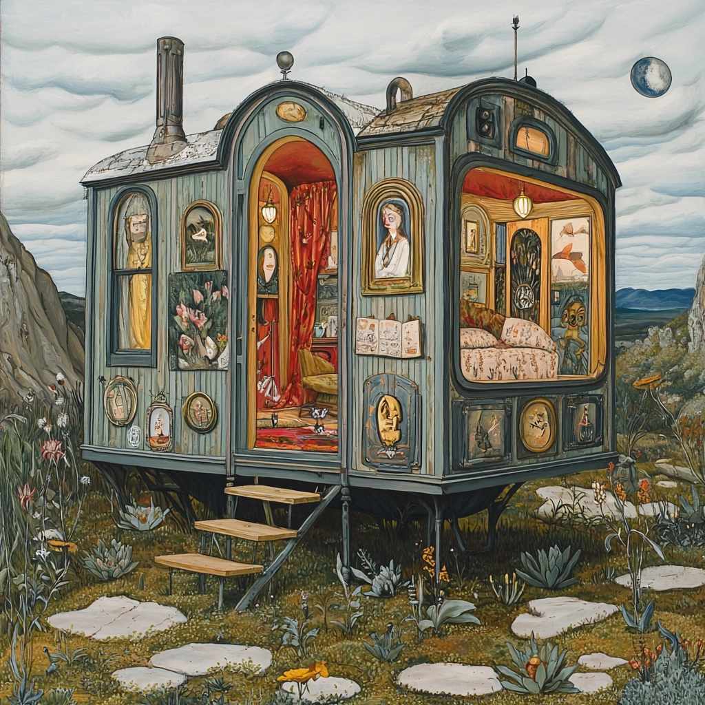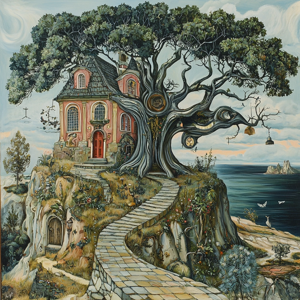 The use of light illuminates specific details, creating depth through shadow and contrast. A varied palette of greens, browns, and blues enhances the realistic yet imaginative world, while detailed textures offer a tactile sense in each visual space.