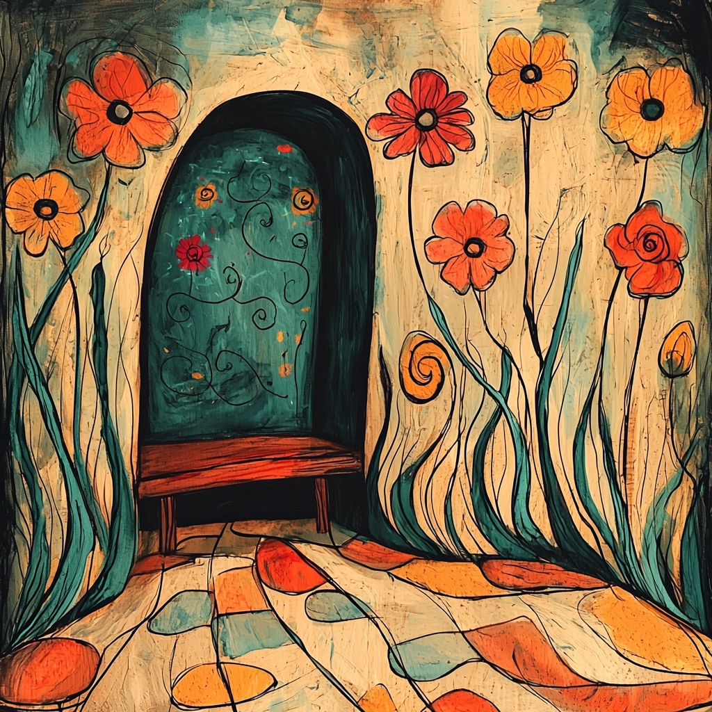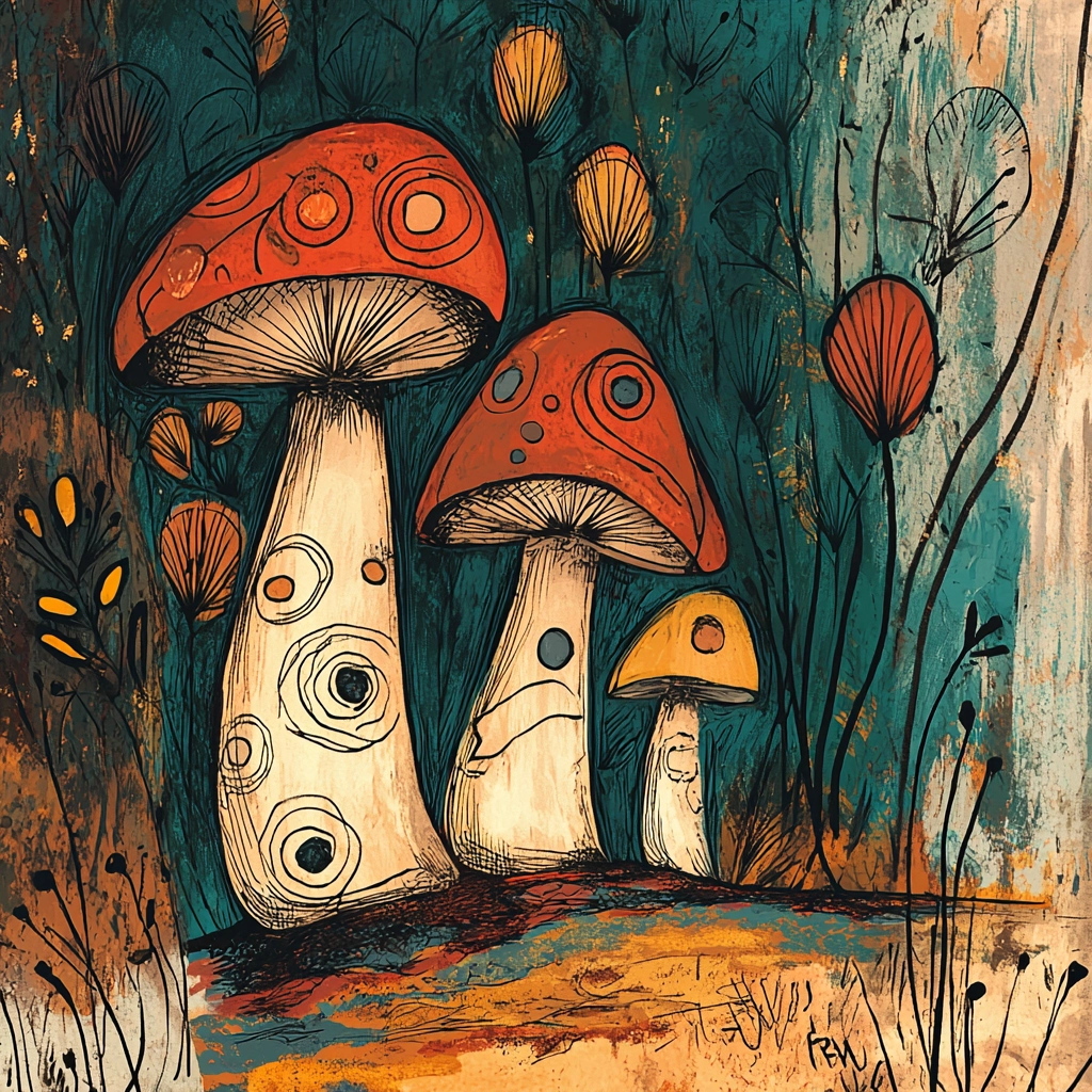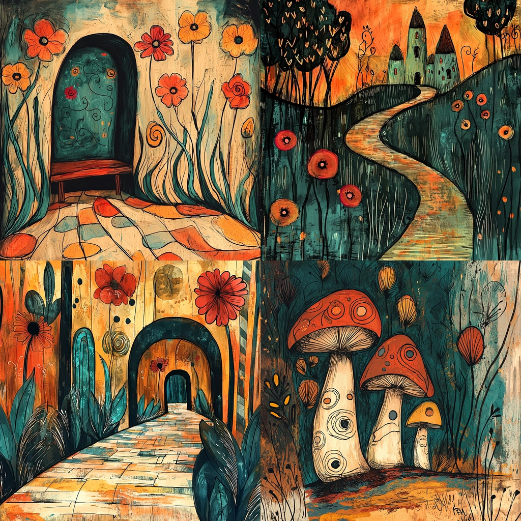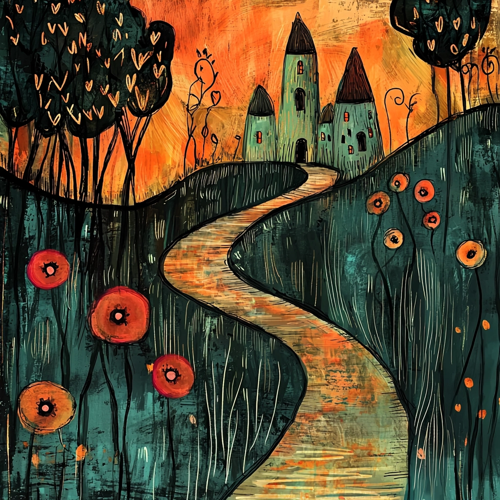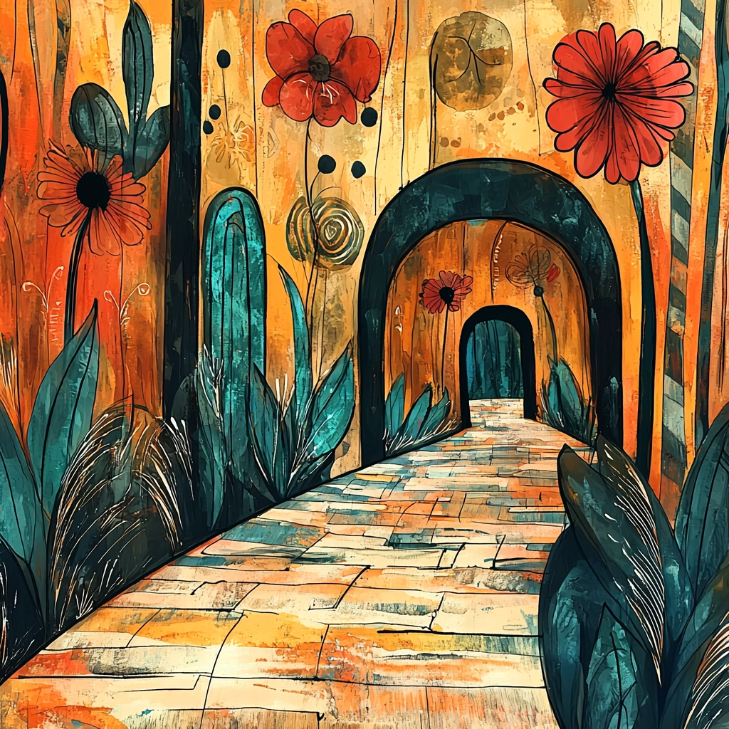 The artwork employs dramatic lighting with bold color contrasts between orange and cyan, enhancing the spatial depth and complexity. A textured finish brings out detailed patterns, adding to the richness of the natural theme, creating a lively visual dynamic.