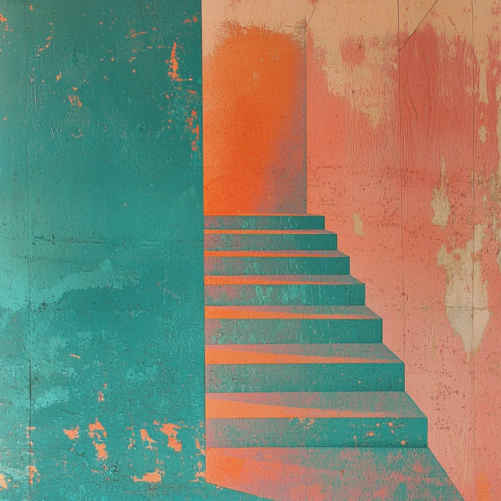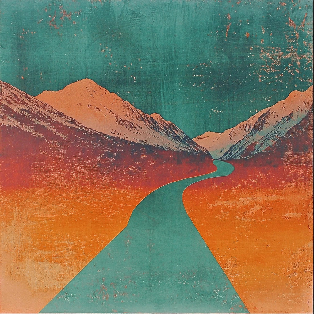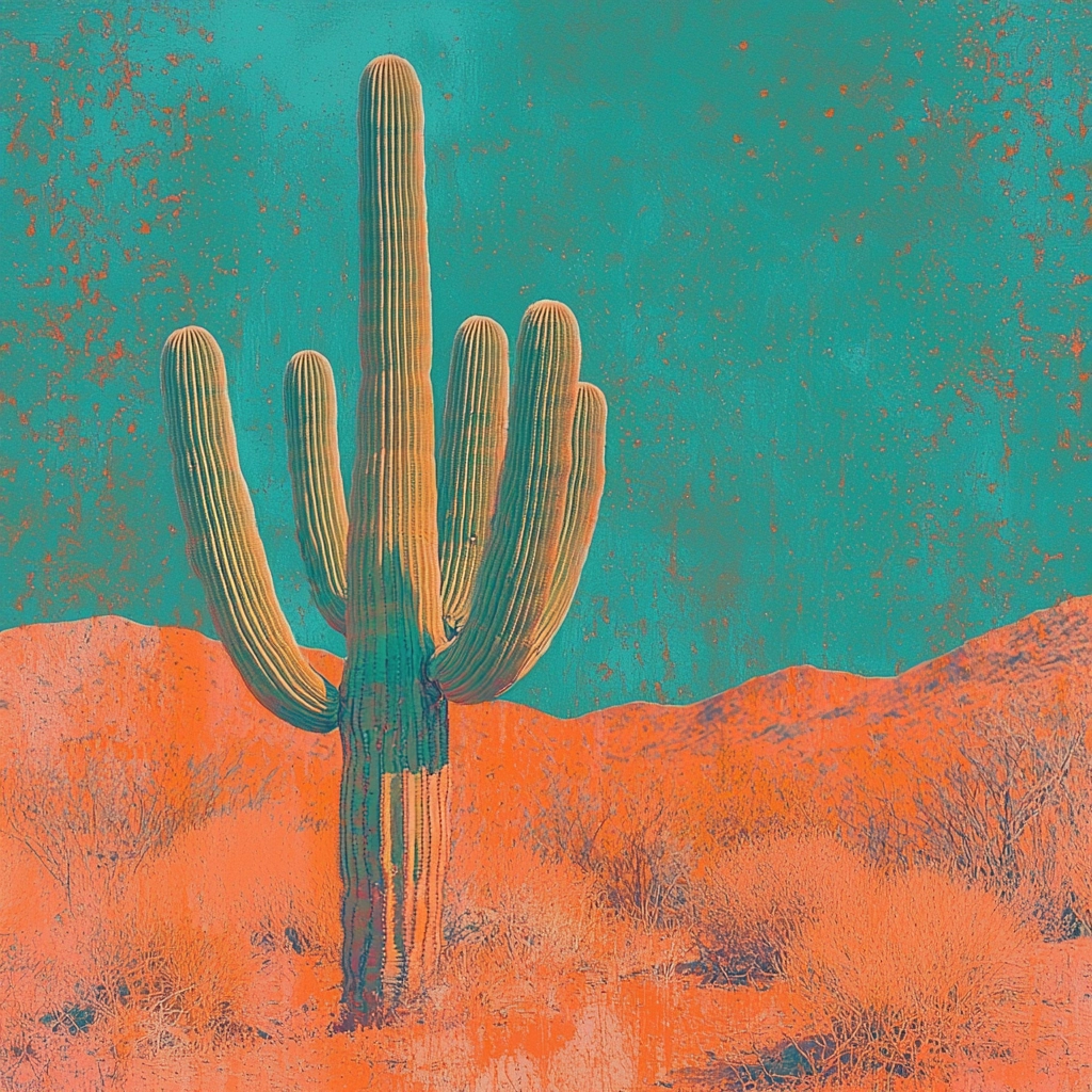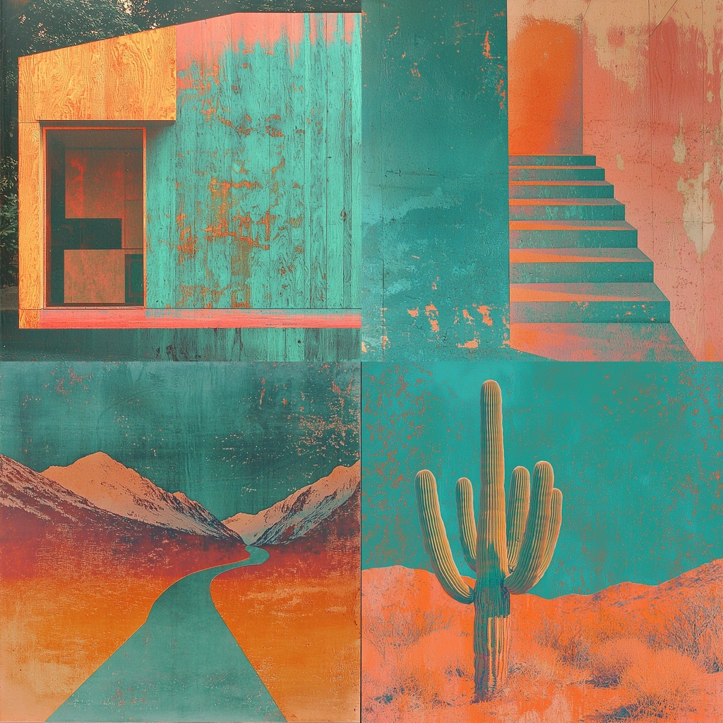 High-contrast lighting emphasizes geometric clarity and organic curves. Cyan and orange dominate with rugged textures and subtle weathered gradients, creating a balanced interplay of depth and flatness.