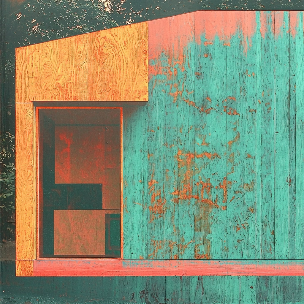 Vivid complementary hues and layered textures shape structural and natural forms.
