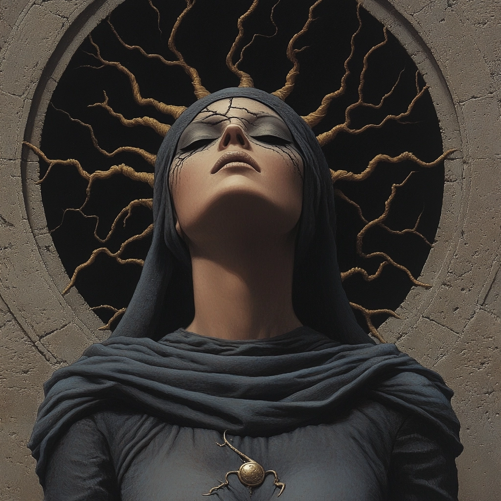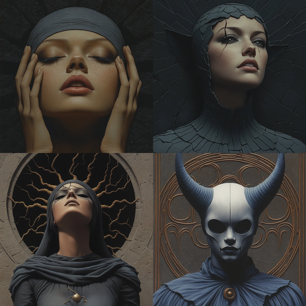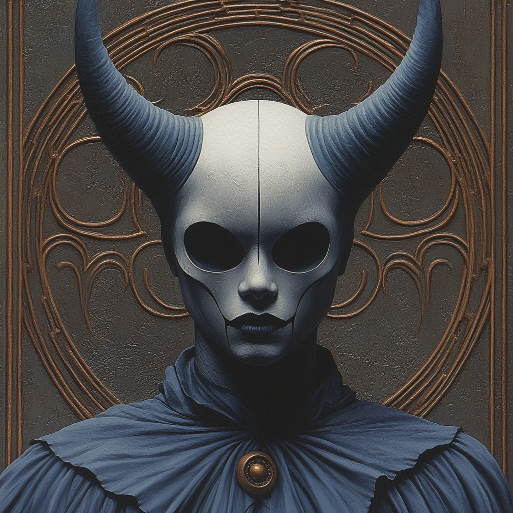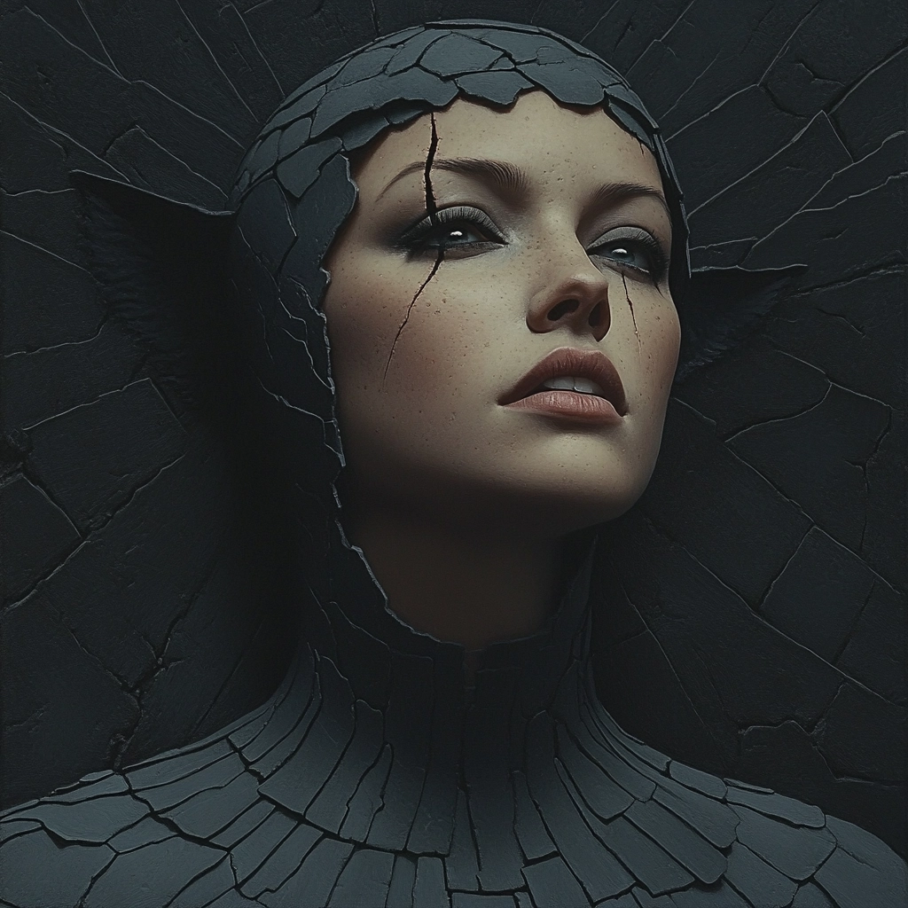 The composition features intricate textures with dark blue and gray tones, balanced by earthy browns.