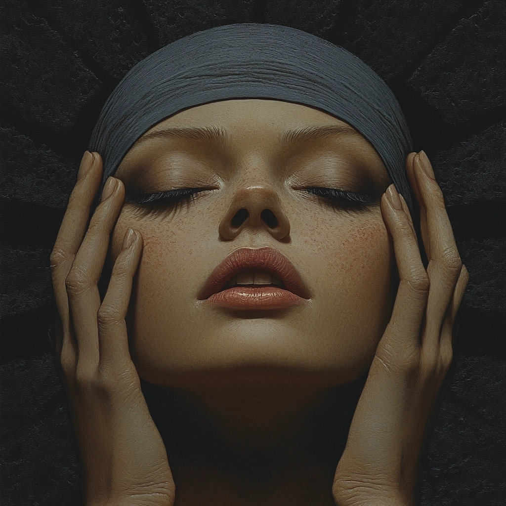 Lighting is subdued, creating gentle shadows that enhance the tactile quality of the surfaces. The textured detailing adds depth, with dark blue and gray tones providing a refined contrast against the muted browns. The spatial arrangement feels intimate and focused.