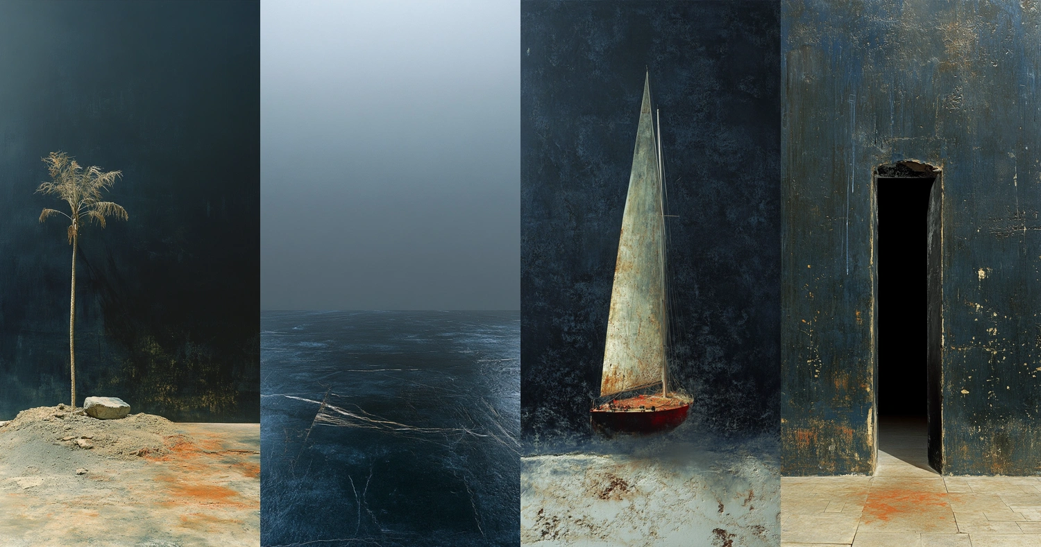 The piece employs shadowy lighting to create a sense of depth, with dark blues and browns enhanced by textured effects that suggest weathered surfaces, allowing hints of light to define edges and contours subtly.