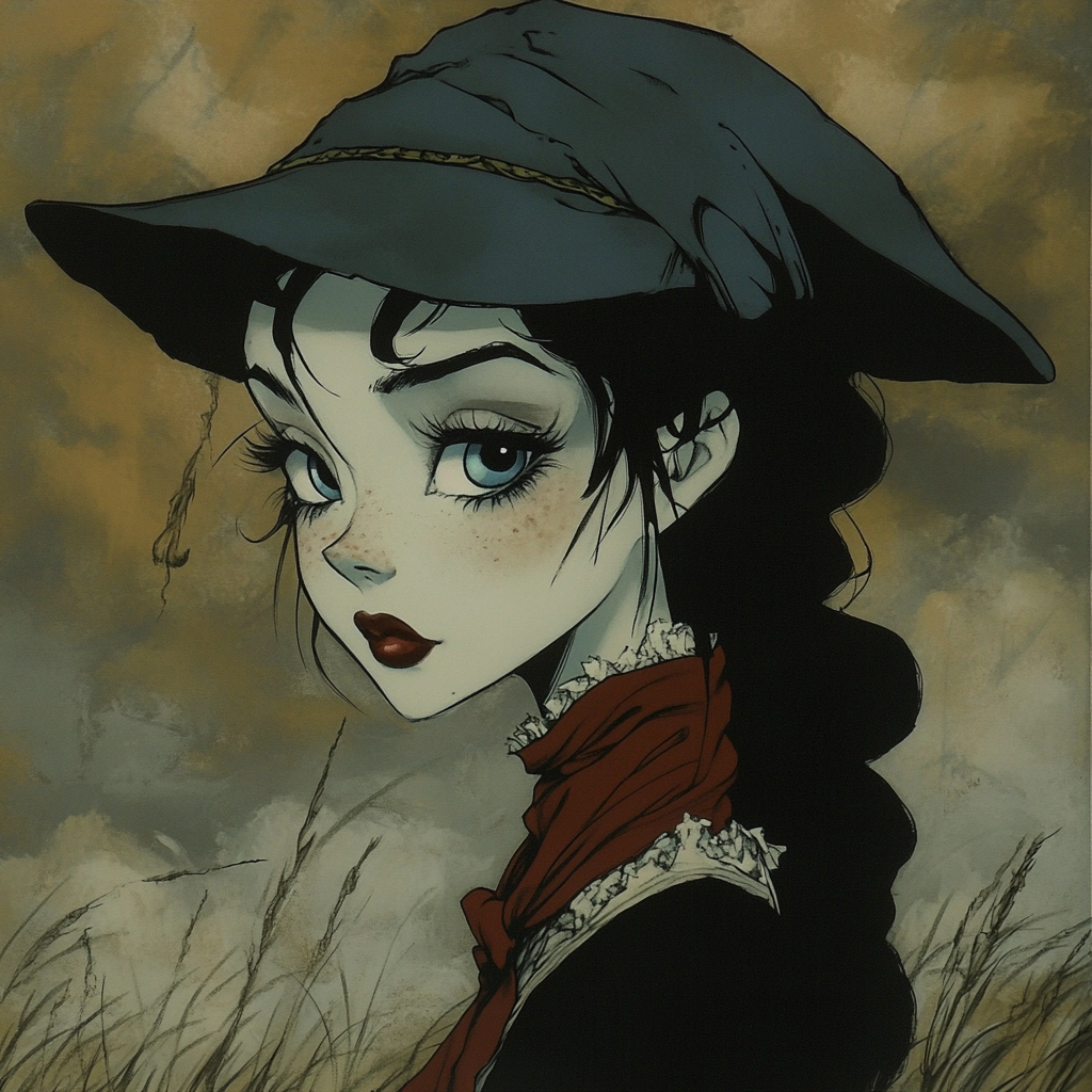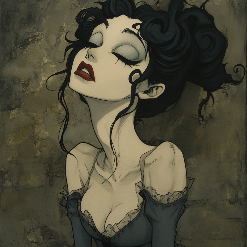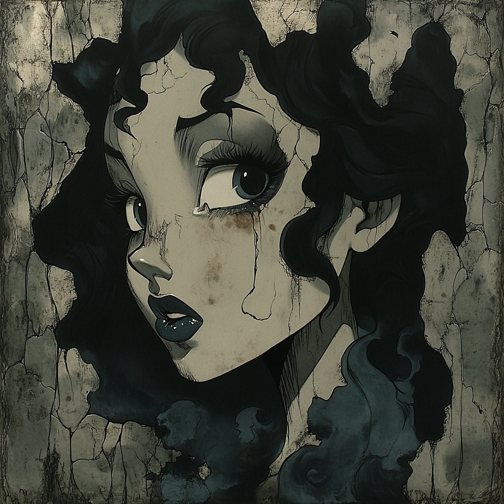 Subtle lighting highlights forms, enhancing three-dimensionality; colors are predominantly muted, contributing to a melancholy atmosphere, with textures emphasized through fine line work and illustrative brush strokes.