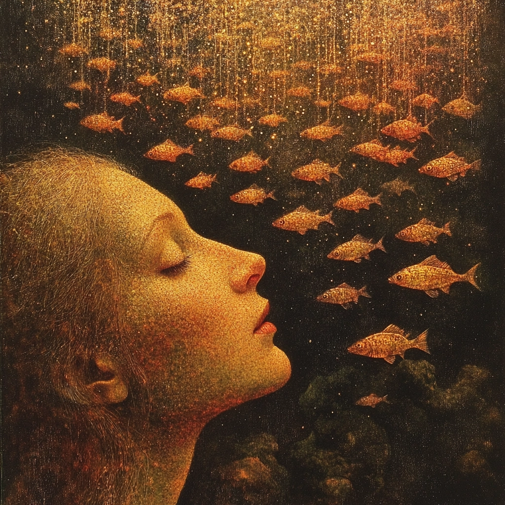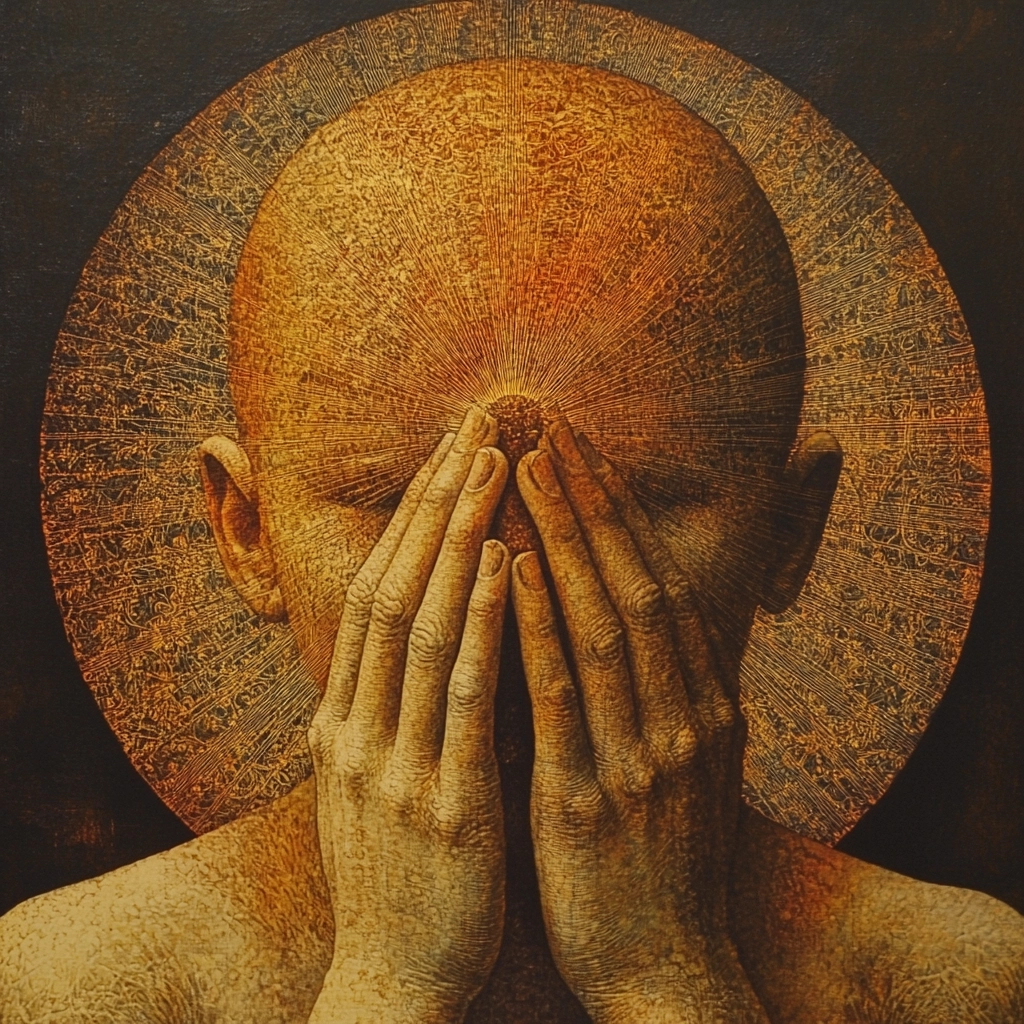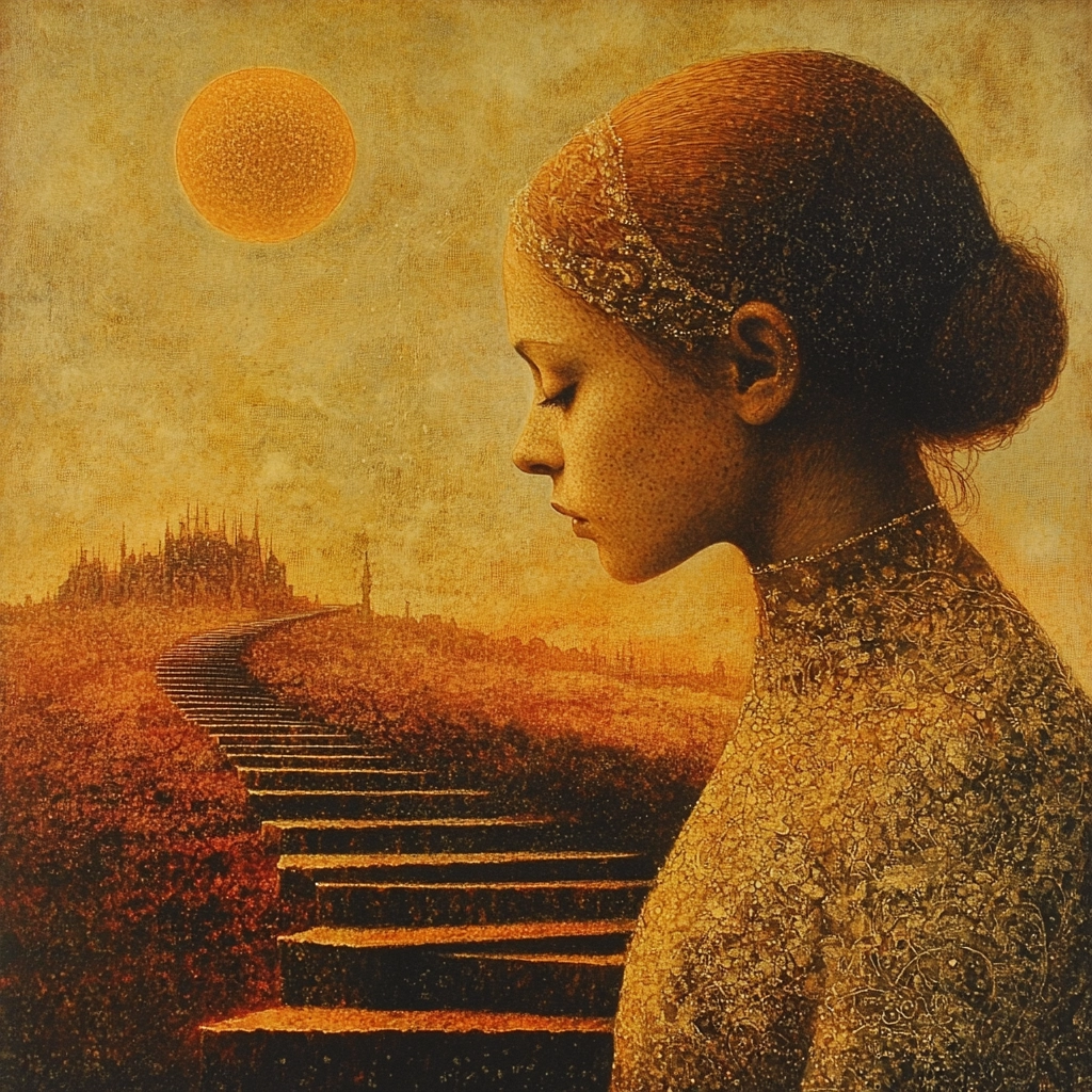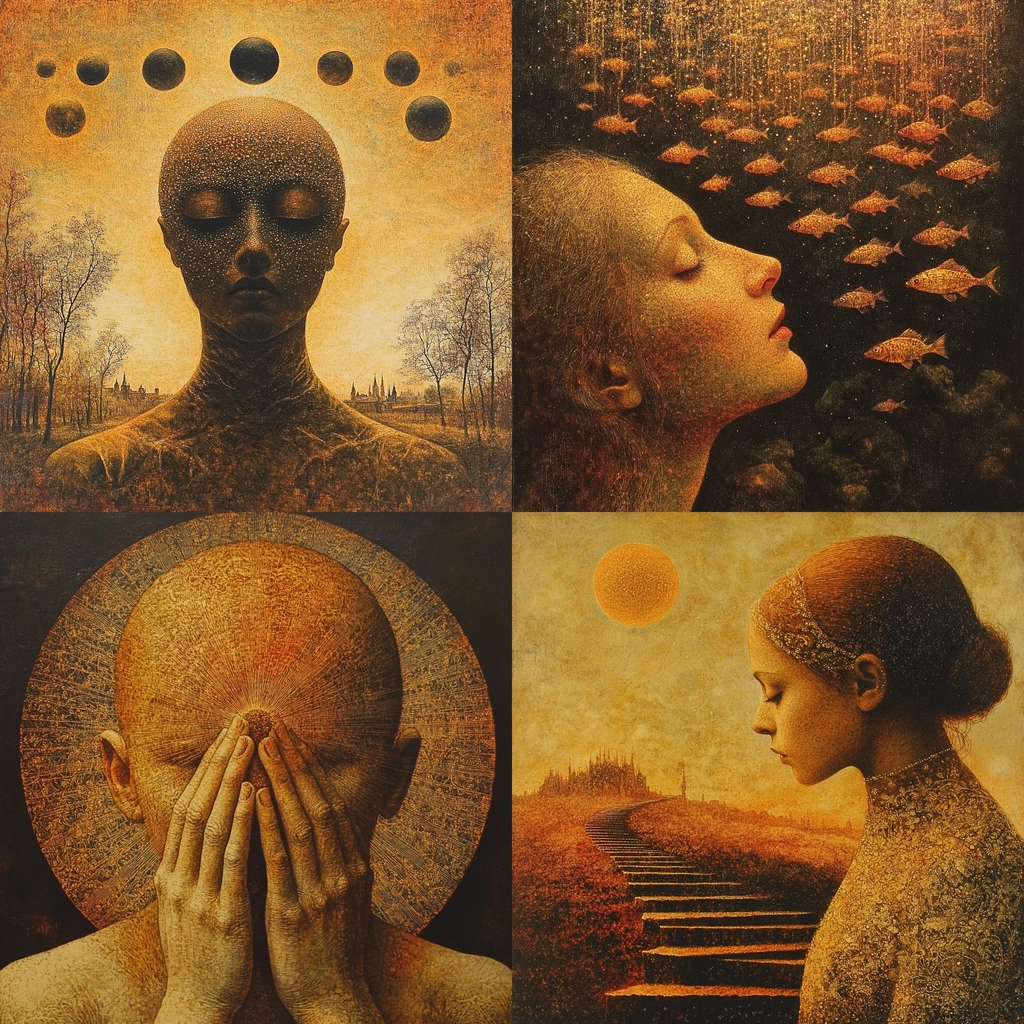 The lighting is diffused, allowing detailed texture on skin and background elements to emerge without harsh shadows; color values remain in warm browns and golds, enhancing the tactile quality. Spatial depth is conveyed through overlapping planes and selective focus, while texture is achieved via fine granular patterns and layered brushstrokes.
