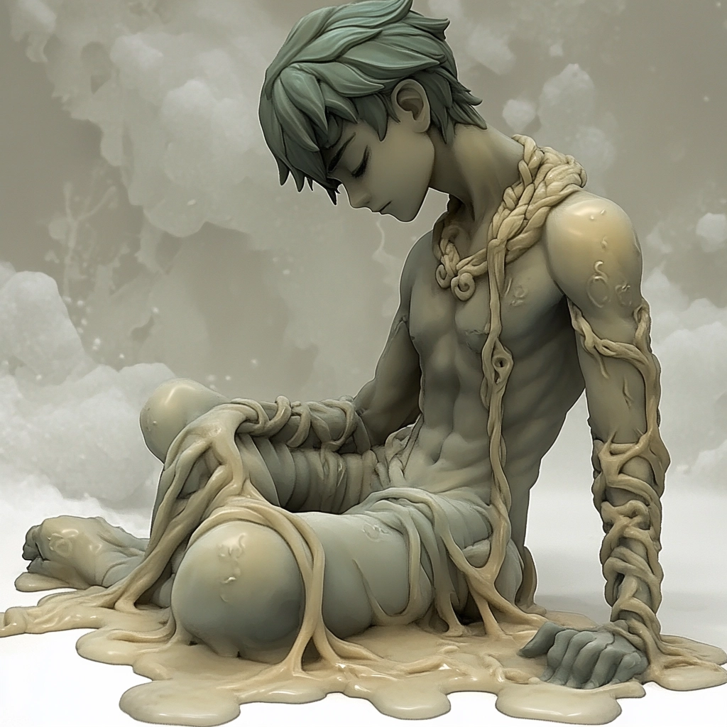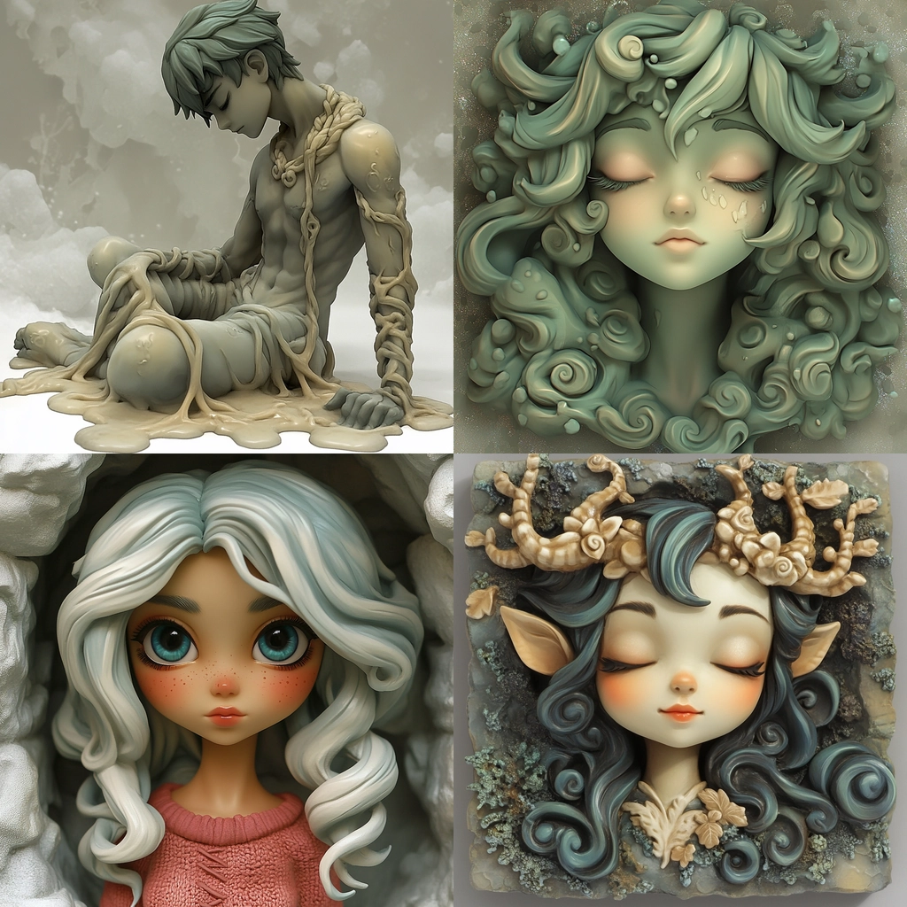 The lighting is soft, emphasizing curves and textures. Earthy colors blend seamlessly to form fluid and organic shapes, enhancing depth and dimension. The textures have a sculptural quality, emphasizing smooth yet intricate surfaces.
