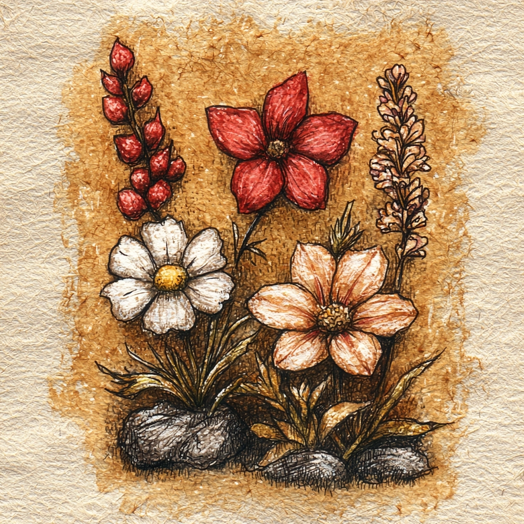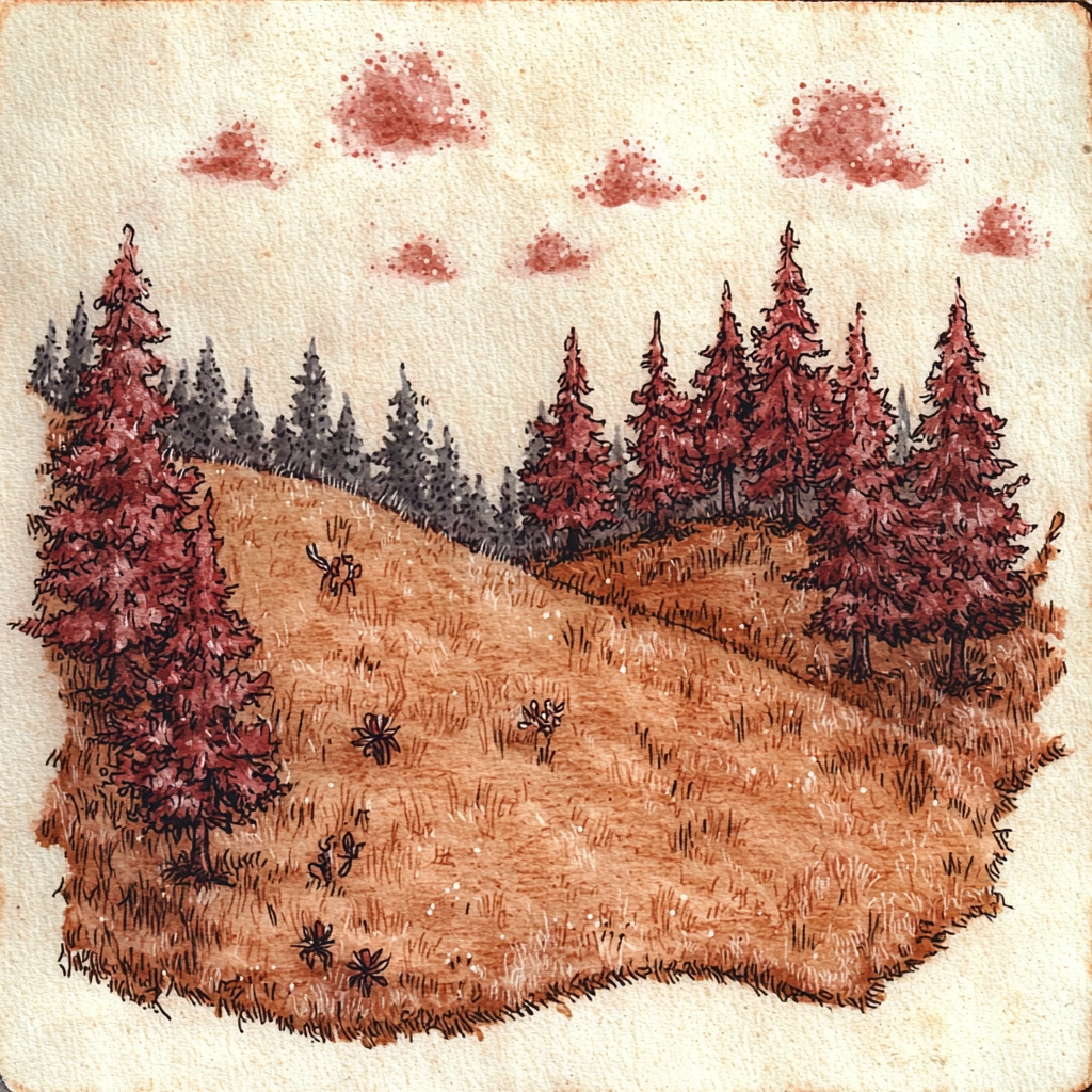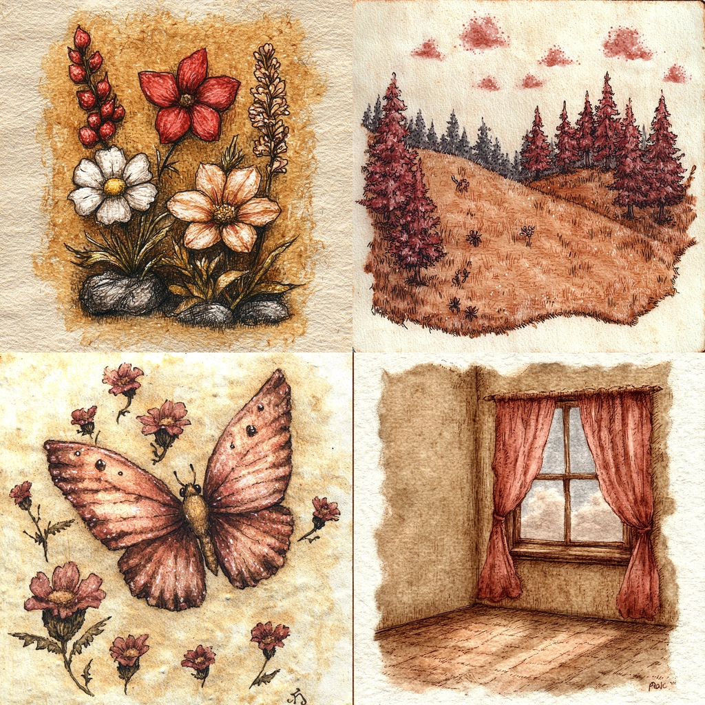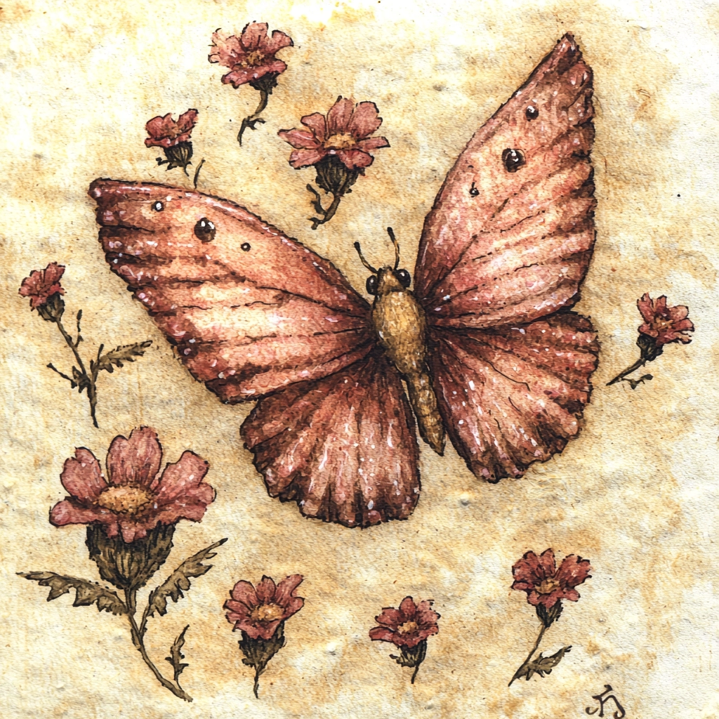 The watercolor technique gives a gentle flow to the composition, with earthy browns blending softly with pinks. Textured brush strokes add depth and warmth, creating a tactile feel. Beige highlights accentuate the natural contours and organic shapes.