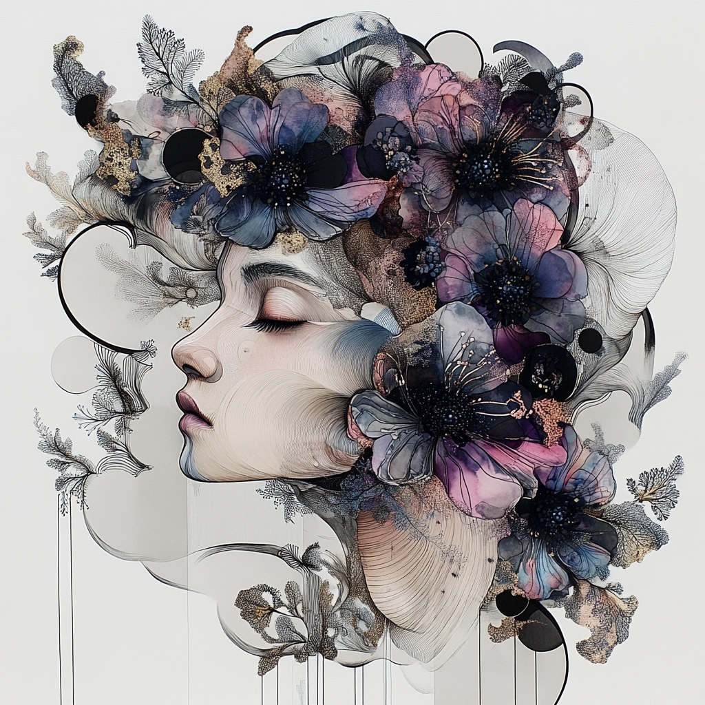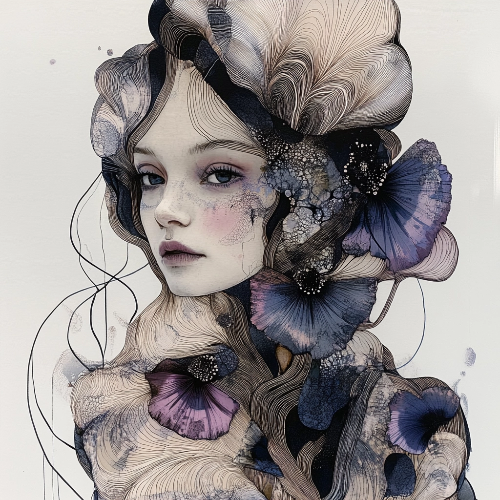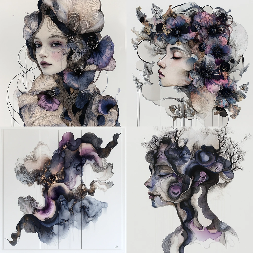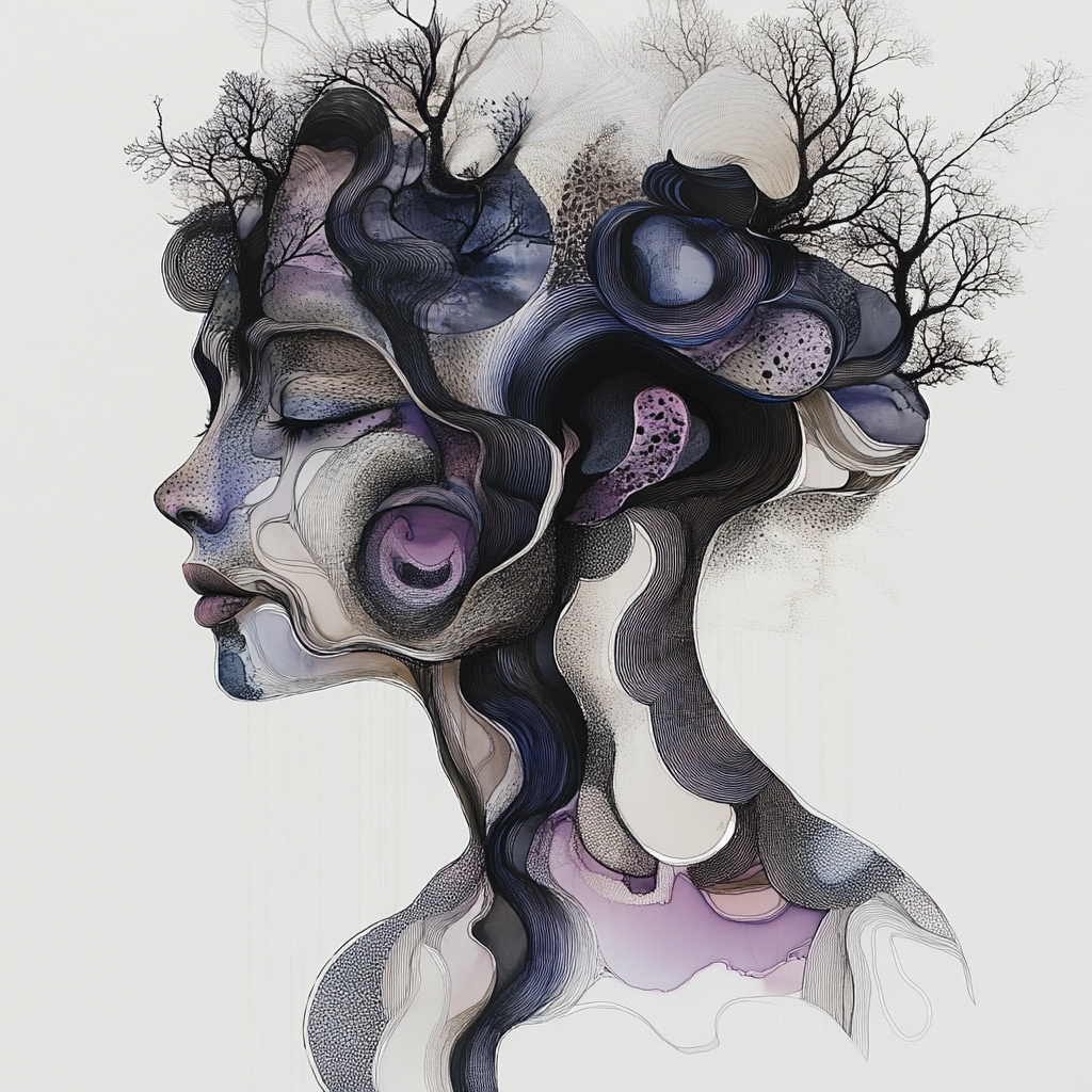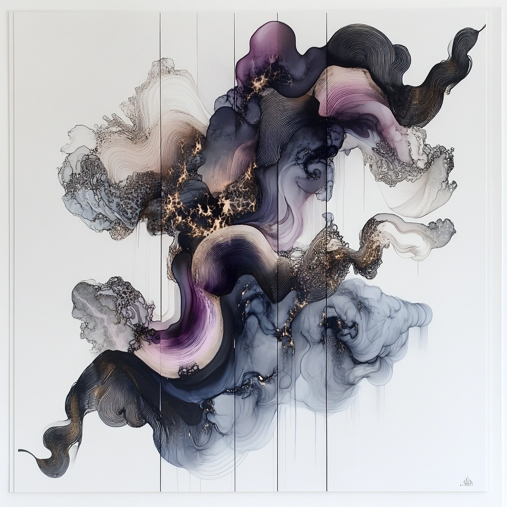The artwork uses flowing lines that intertwine with organic shapes, complementing the textured and layered appearance. Gradients of purple and black add depth, while white spaces create contrast and highlight the fluidity.