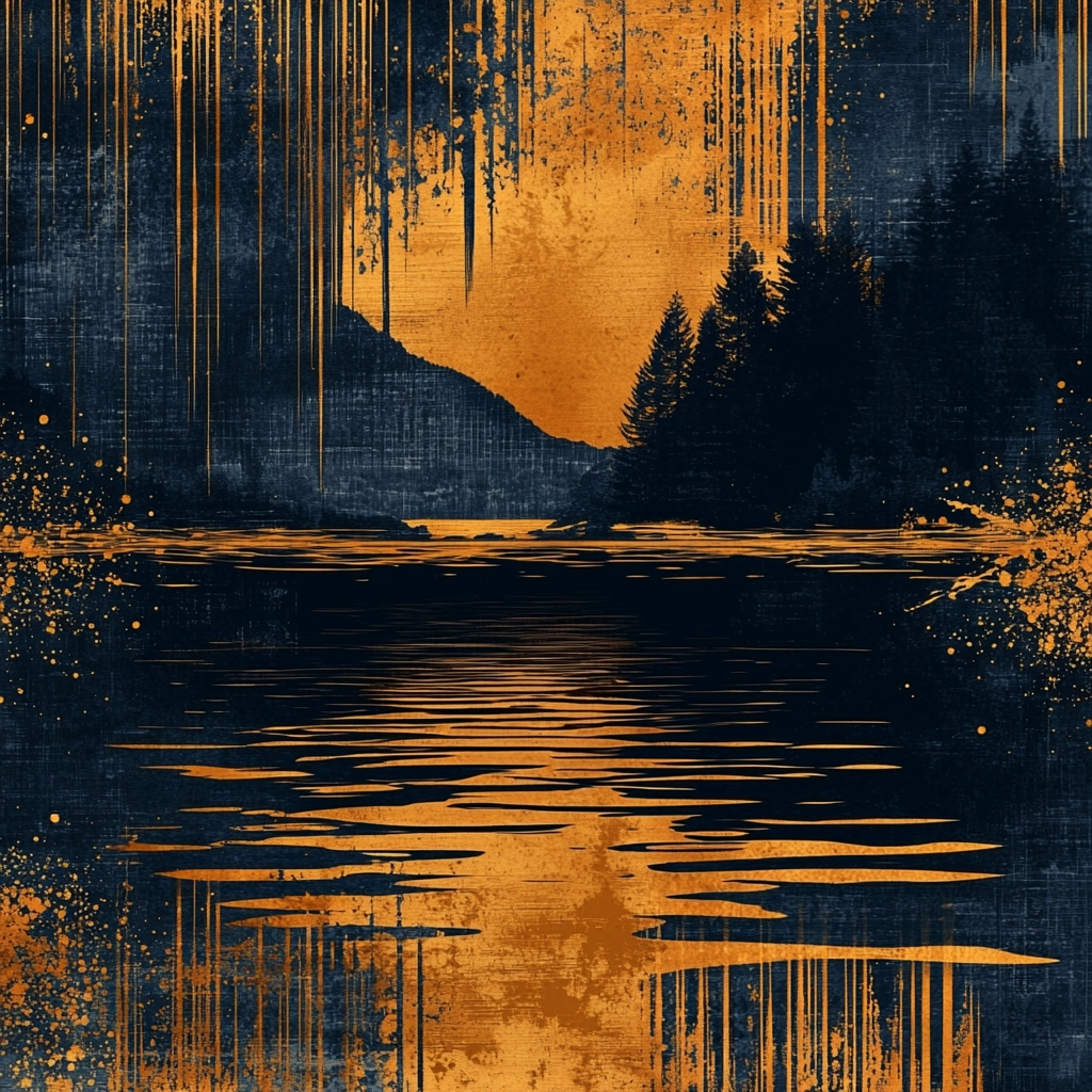 The interplay of gold and dark blue is enhanced by textured layers that evoke movement and depth. Lighting effects draw focus to specific areas, creating spatial dimensionality while the colors emphasize the contrasted textures.