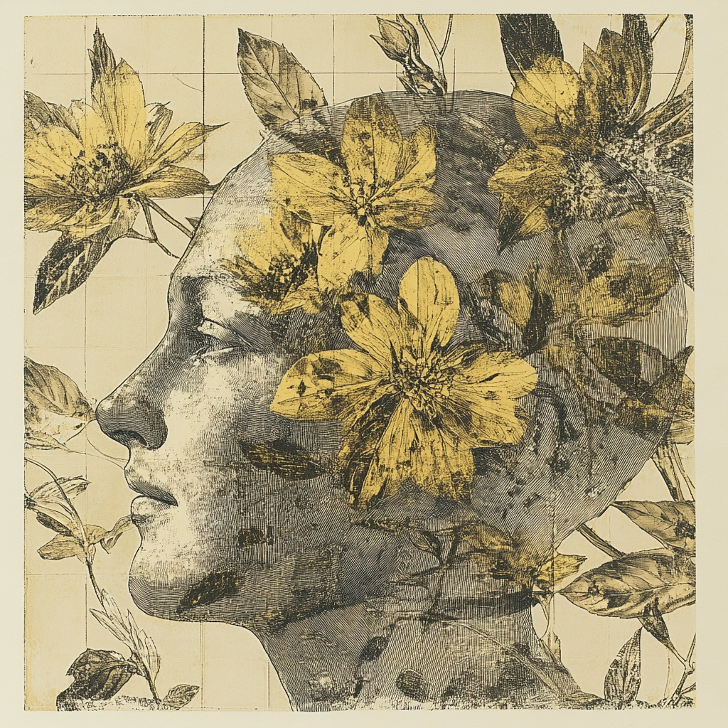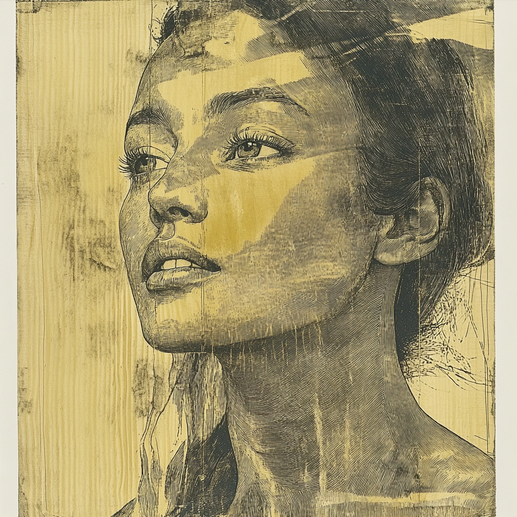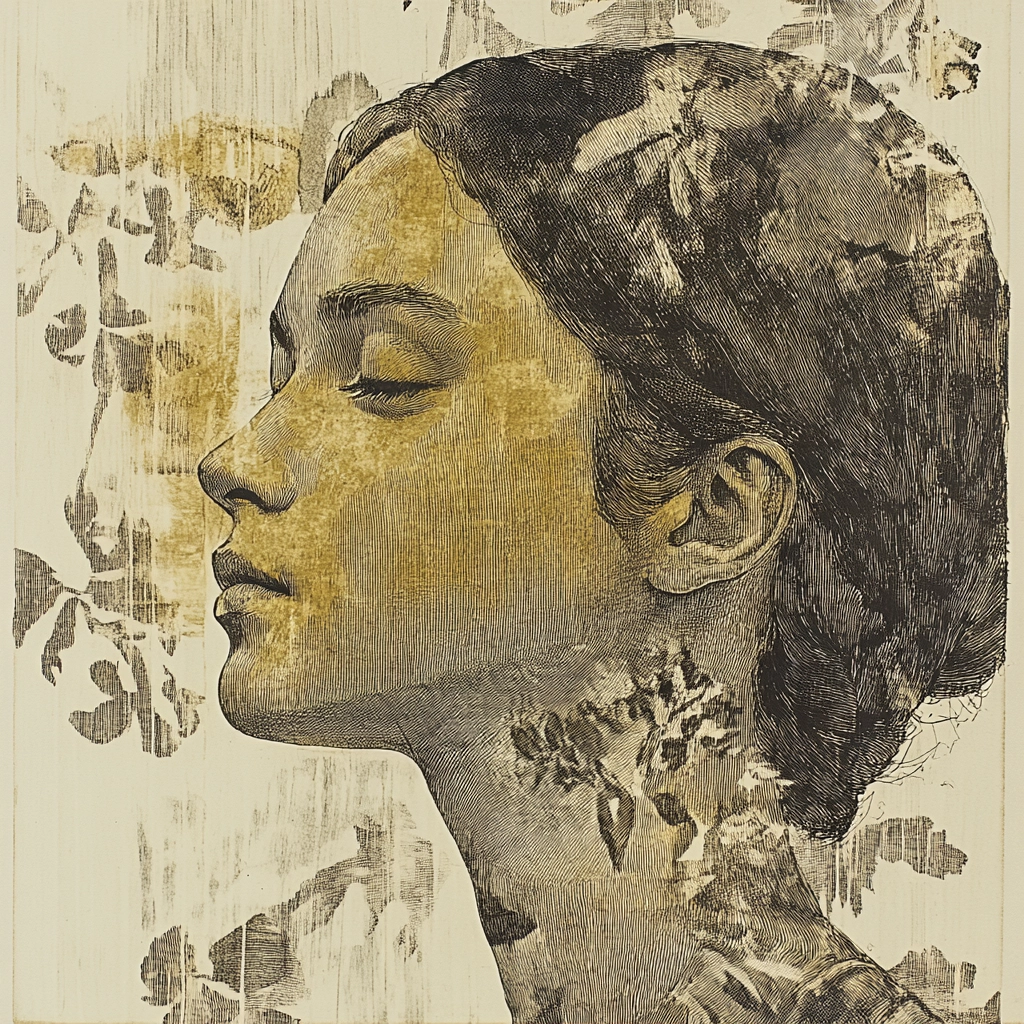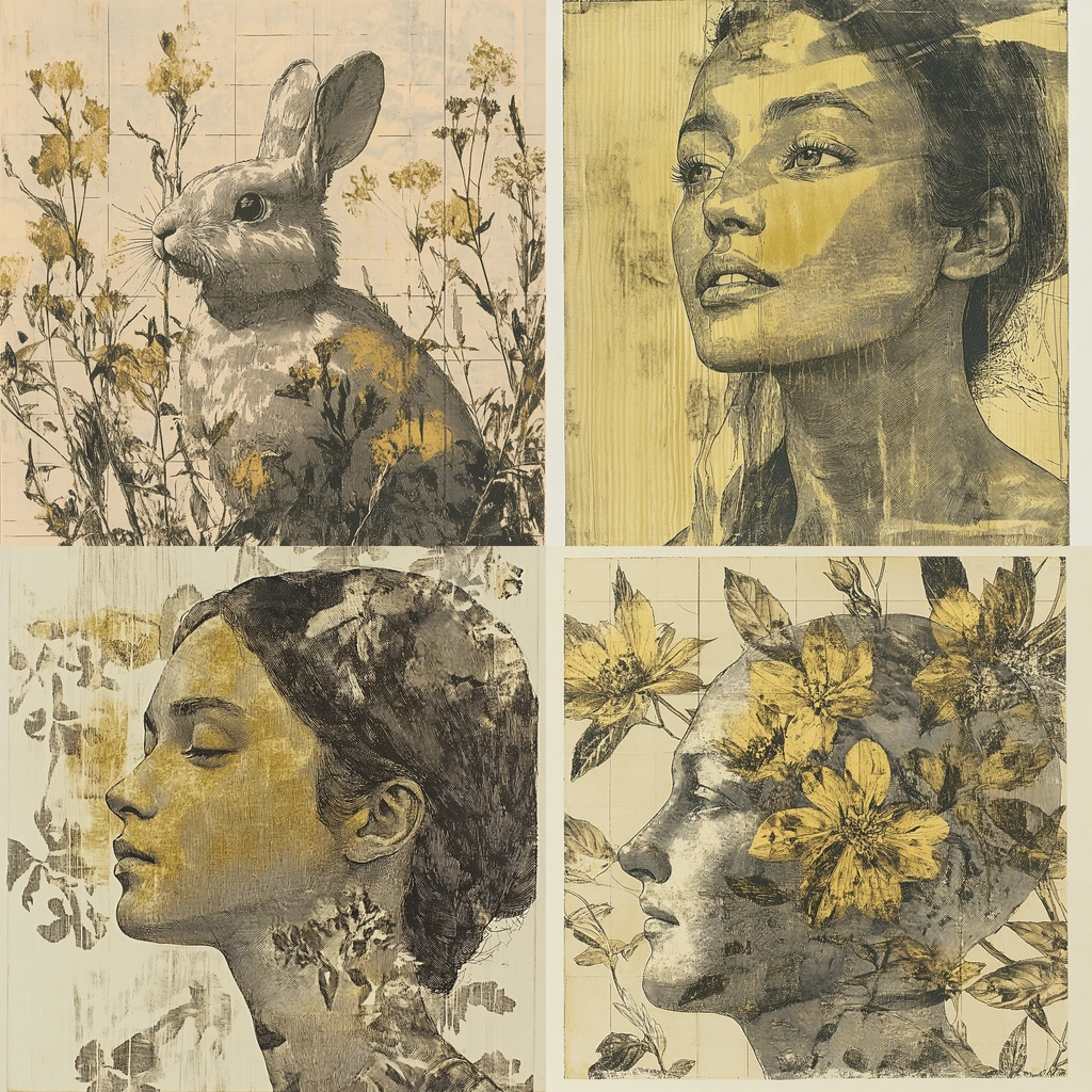 The lighting subtly enhances the contrasts between the gray and gold hues, creating depth and dimension. The textures suggest a deliberate, almost tactile quality, further highlighted by the precise and intricate line work. Spatial arrangement and layering appear carefully considered, contributing to a harmonious visual flow.