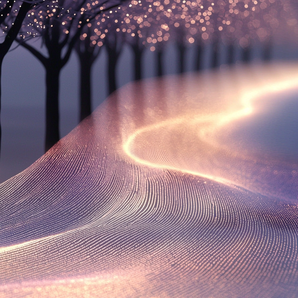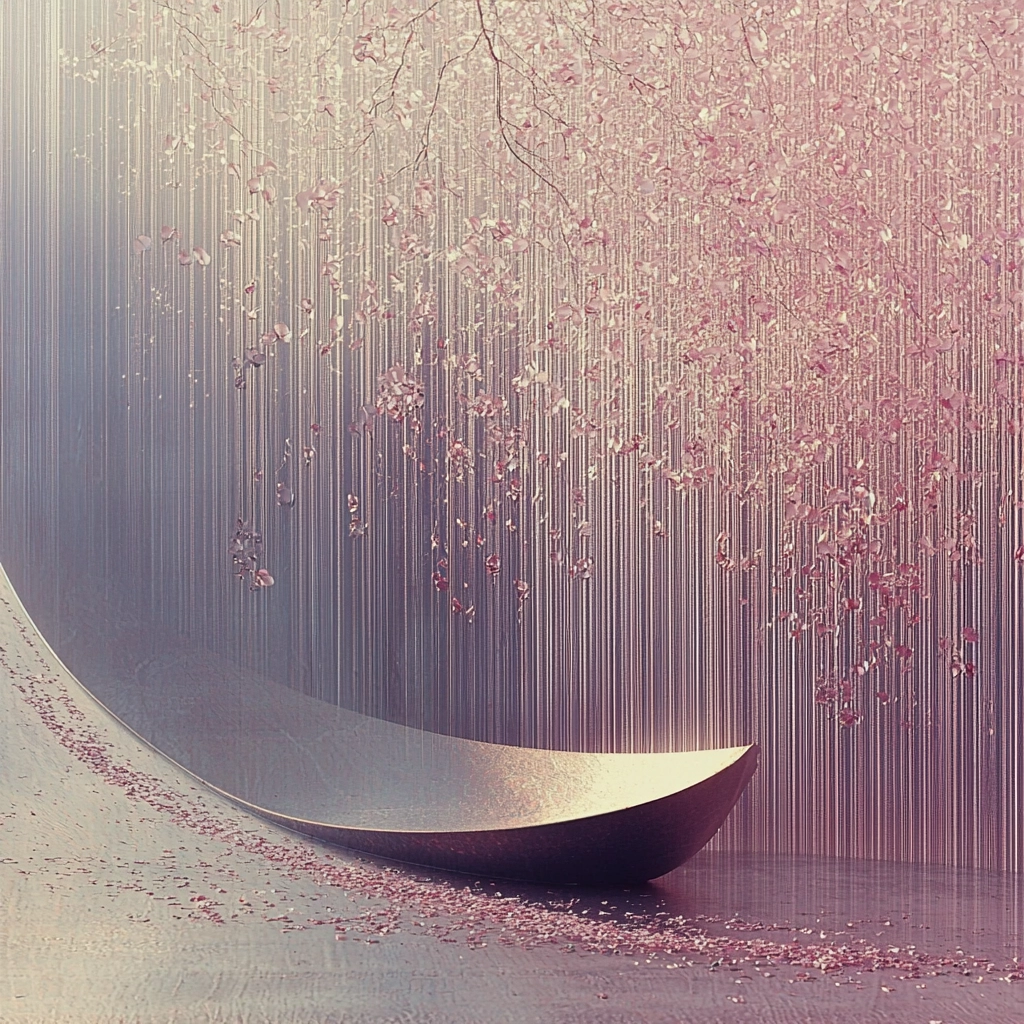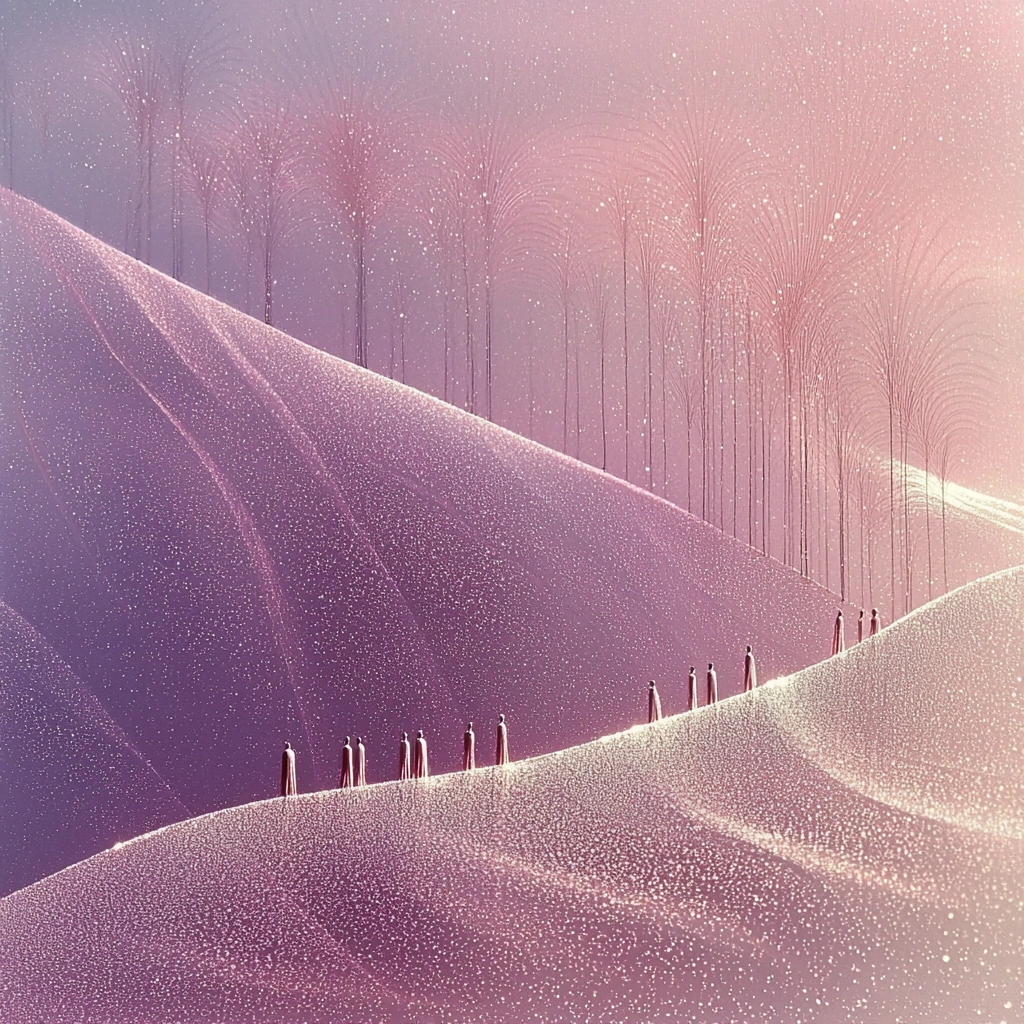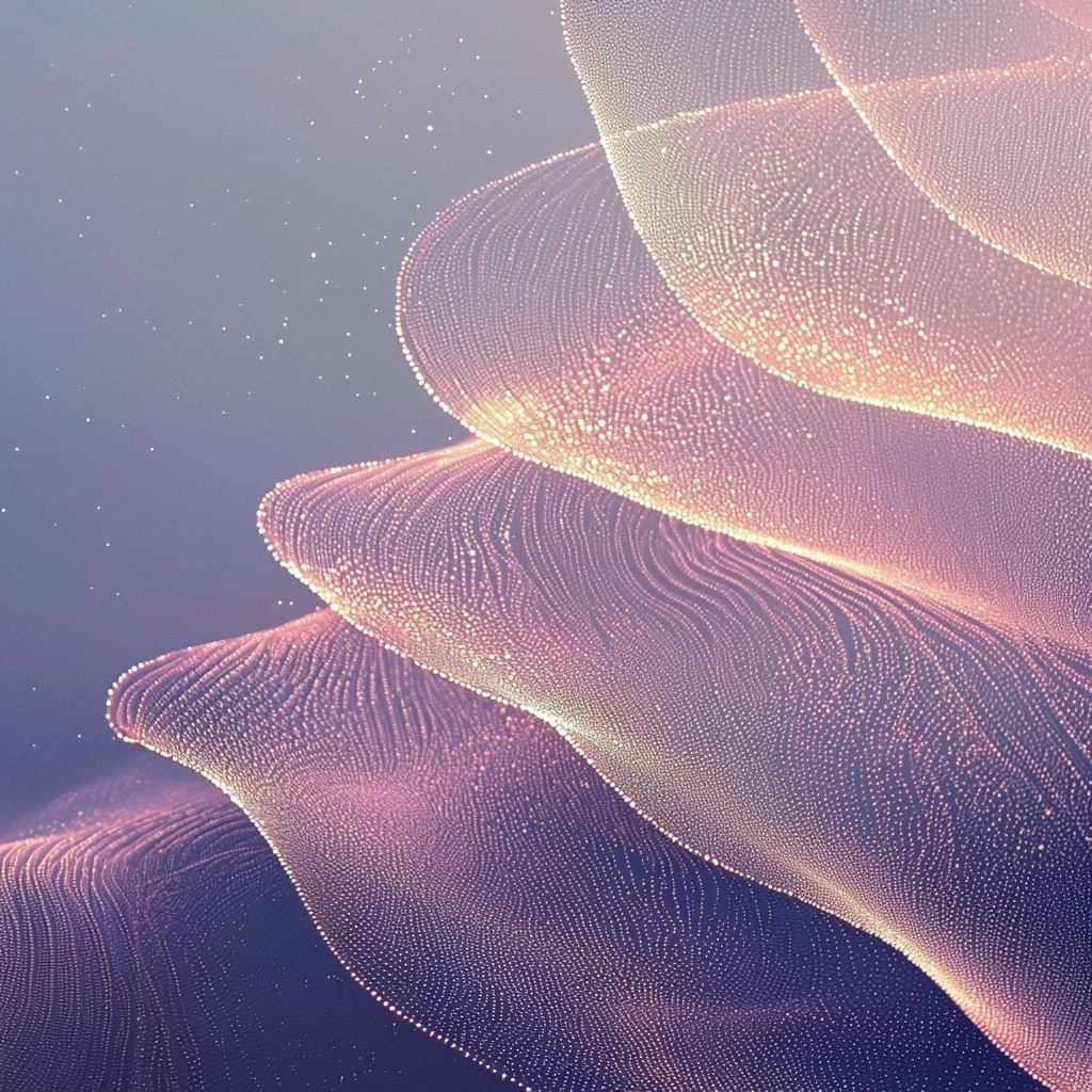 The lighting softly illuminates the scene, creating gradients that transition seamlessly between pink, purple, and gray. Textures are expressed through layered contours, producing a flowing sense of motion. Depth is achieved through subtle transitions and delicate focus.