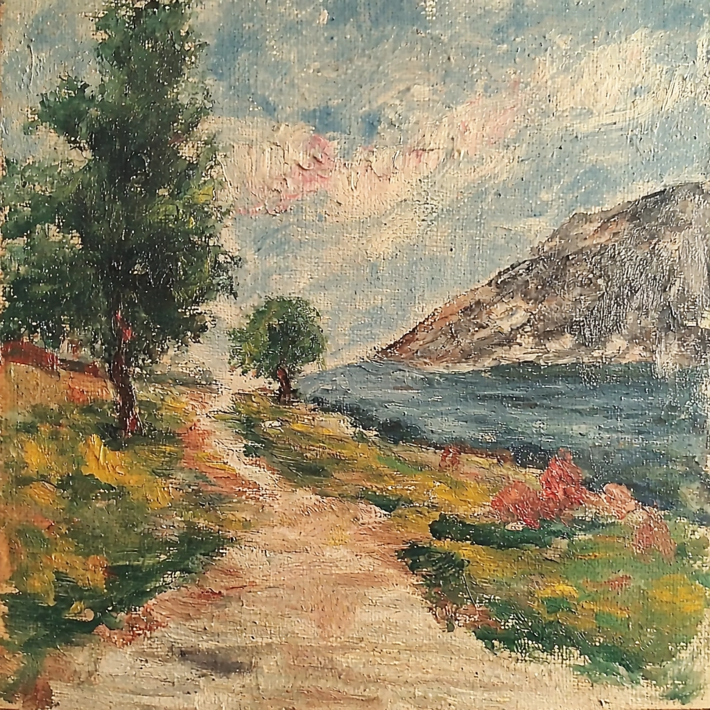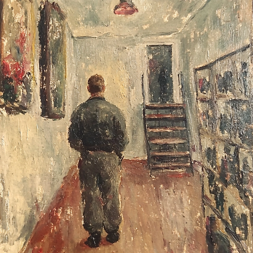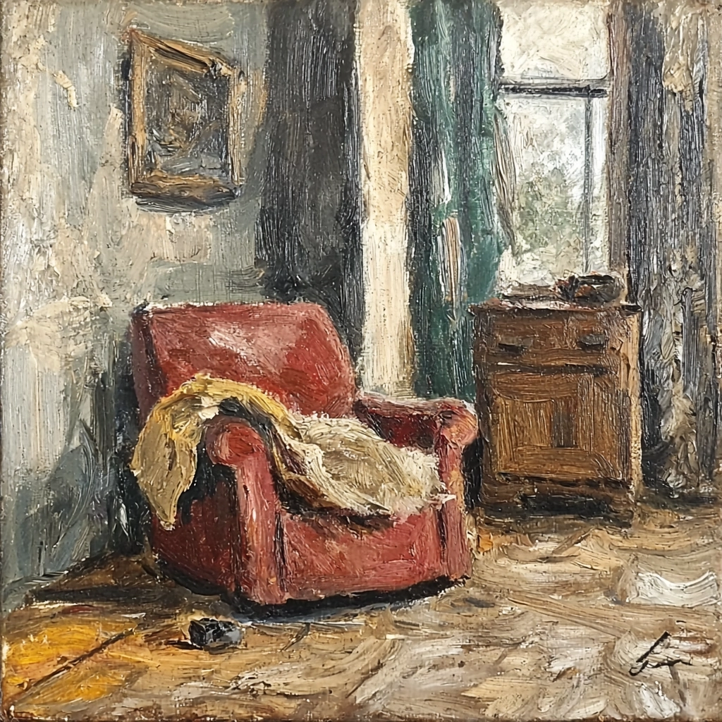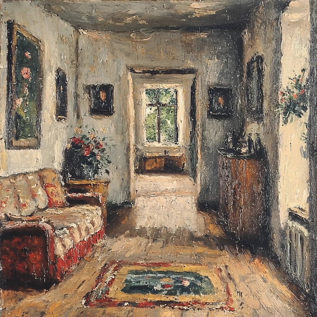 Thick, impasto-like texture dominates, emphasizing tactile quality. Natural lighting softens tonal transitions, while muted earthy colors enhance depth. Spatial layering creates a sense of both intimacy and openness.
